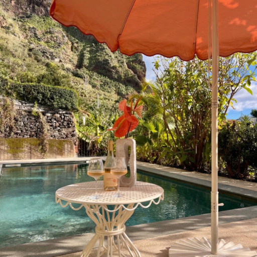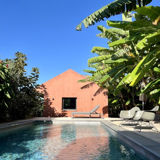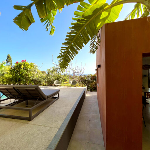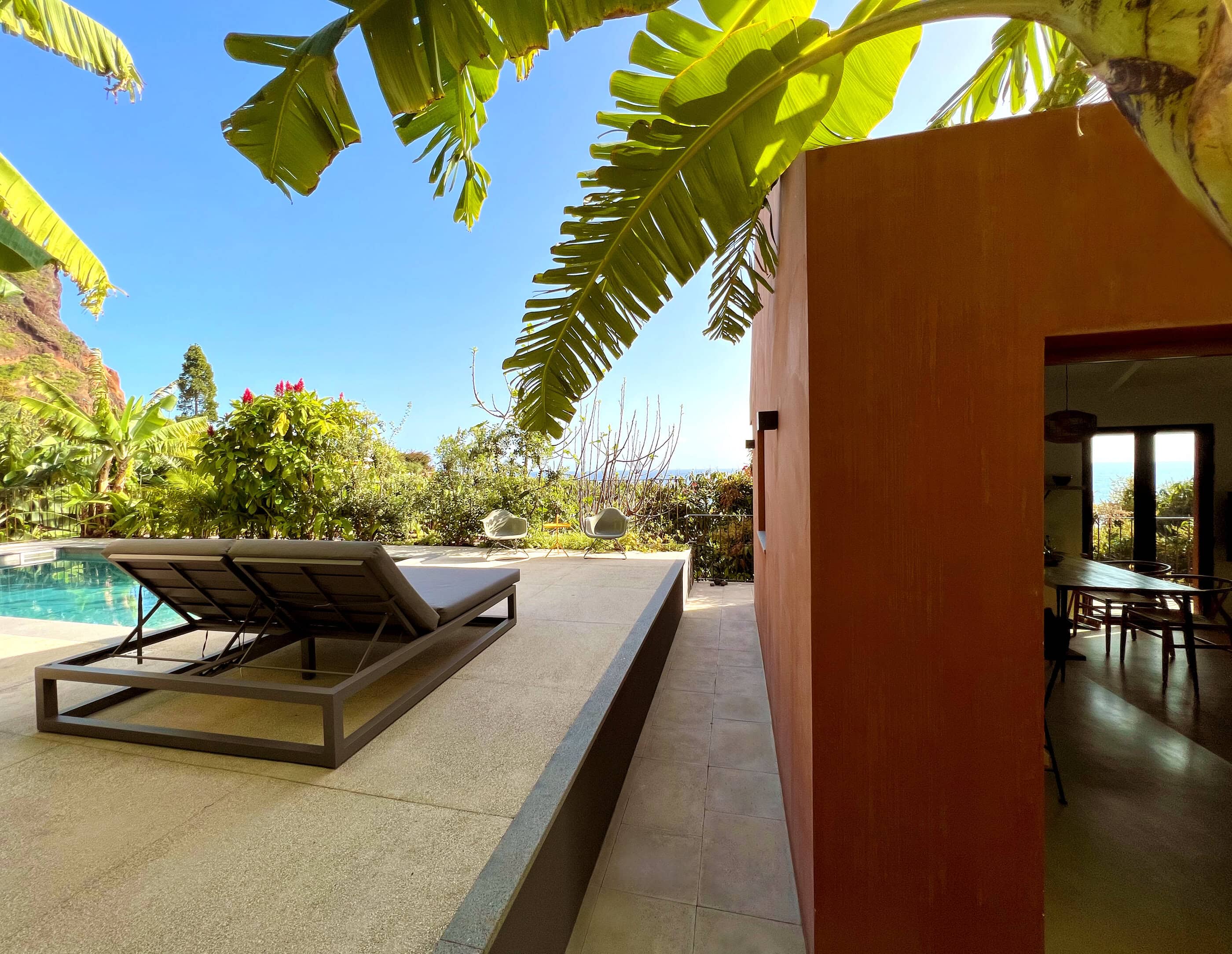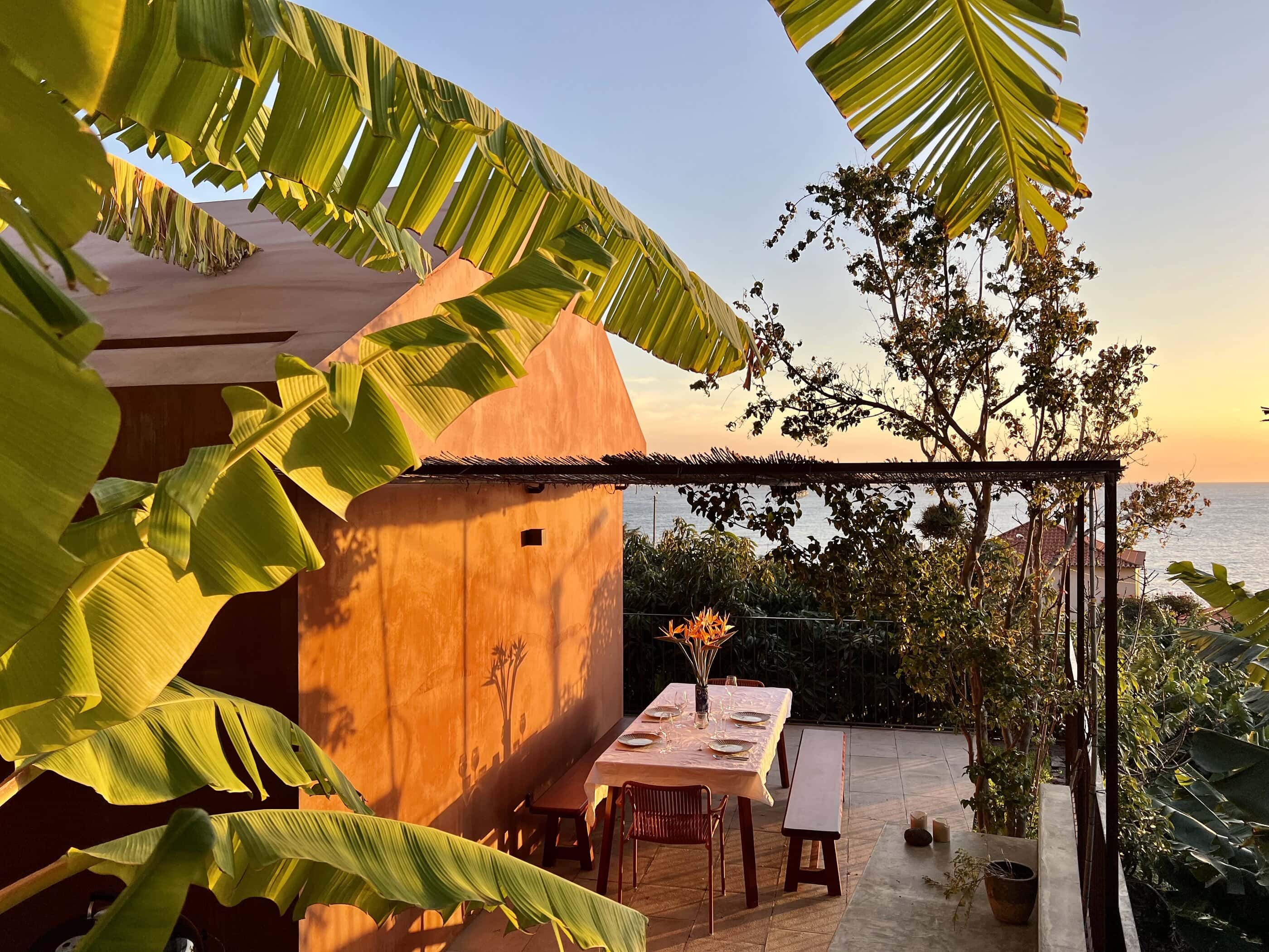 Barefoot on the terrace in the warm morning sun, the scent of mangoes, bananas, and figs in the air, and the sound of the Atlantic in the distance—this is how the days begin here, wonderfully far away from the world. Nestled amid a banana grove on the hillside of the village of Arco da Calheta, within sight of the sea, the terracotta-colored façade emerges from the dense foliage of an exotic garden. The minimalist house, designed by the architects of Tabaibo Atelier, features two levels. Upstairs are the kitchen, dining, and living areas, offering a view of the Fajã do Mar coastline. Every corner of the house is lovingly decorated with a mix of modern design and vintage furniture. The two bedrooms are located in the basement and have direct access to the garden, where mango, fig, and avocado trees grow (picking is expressly encouraged!). Madeira is known for its breathtakingly beauty, so life mainly takes place outdoors. A perfect day therefore not only begins under the open sky, but is also best spent ending there. After a stroll through the market, your shopping haul of fresh fish, meat, and vegetables goes on the grill on the terrace. With the sunset bathing everything in warm light, it’s bound to be a feast.