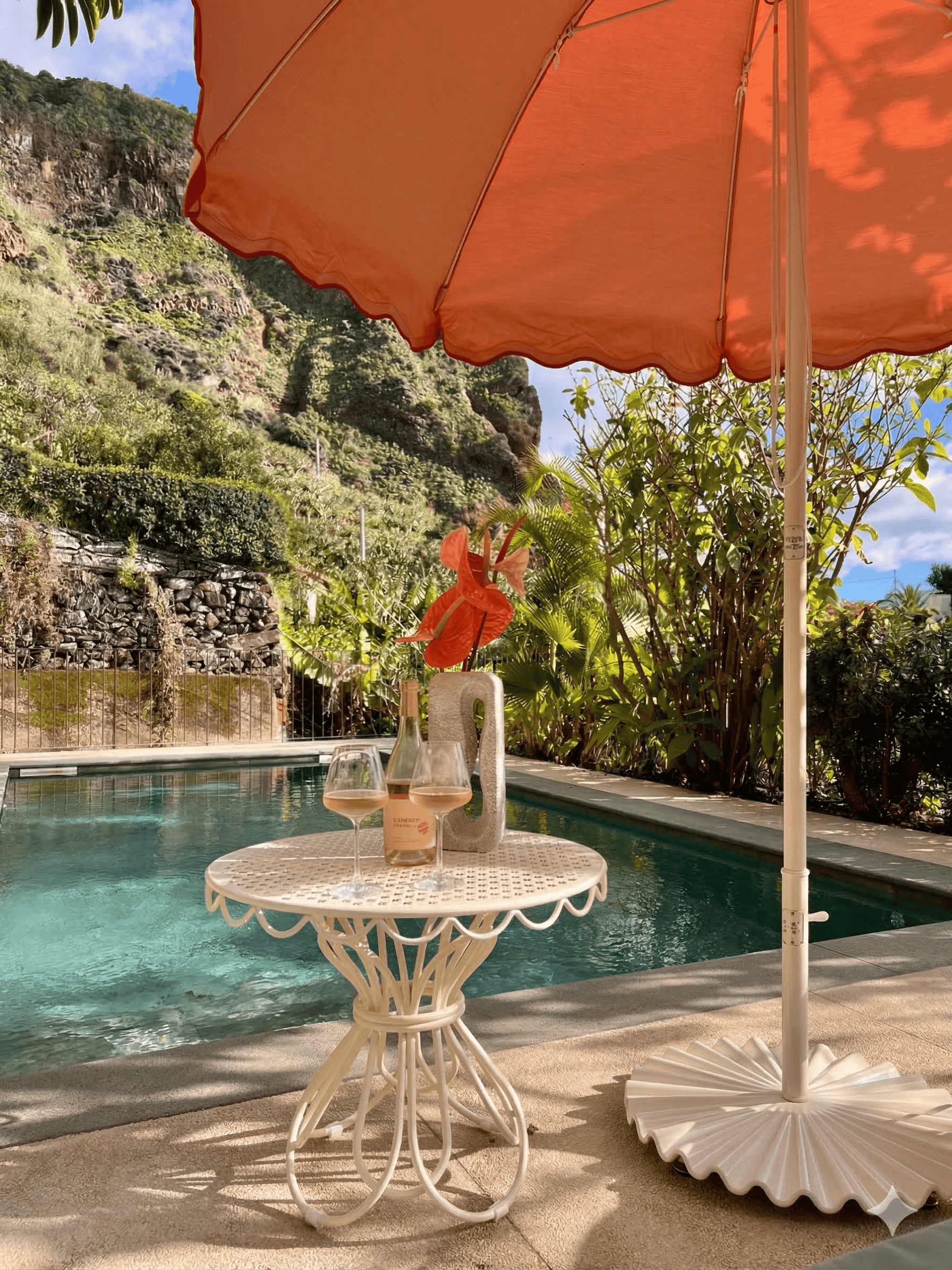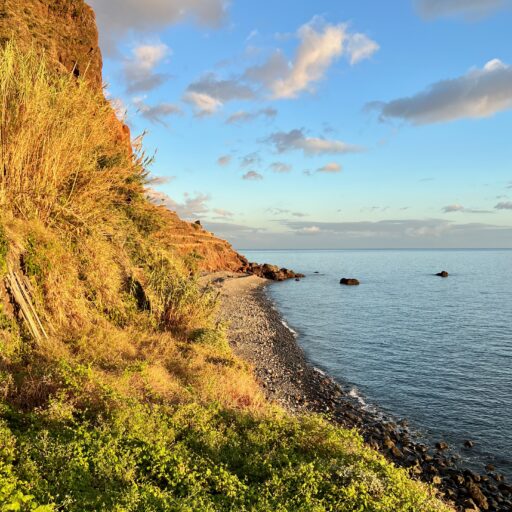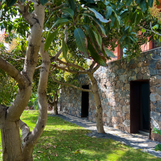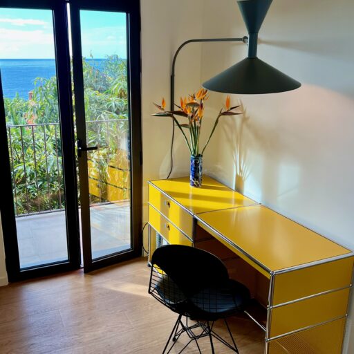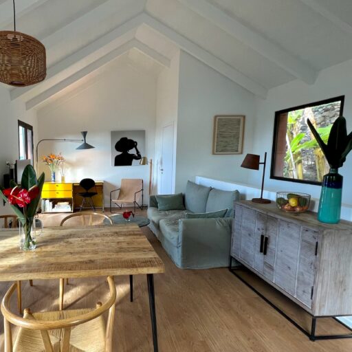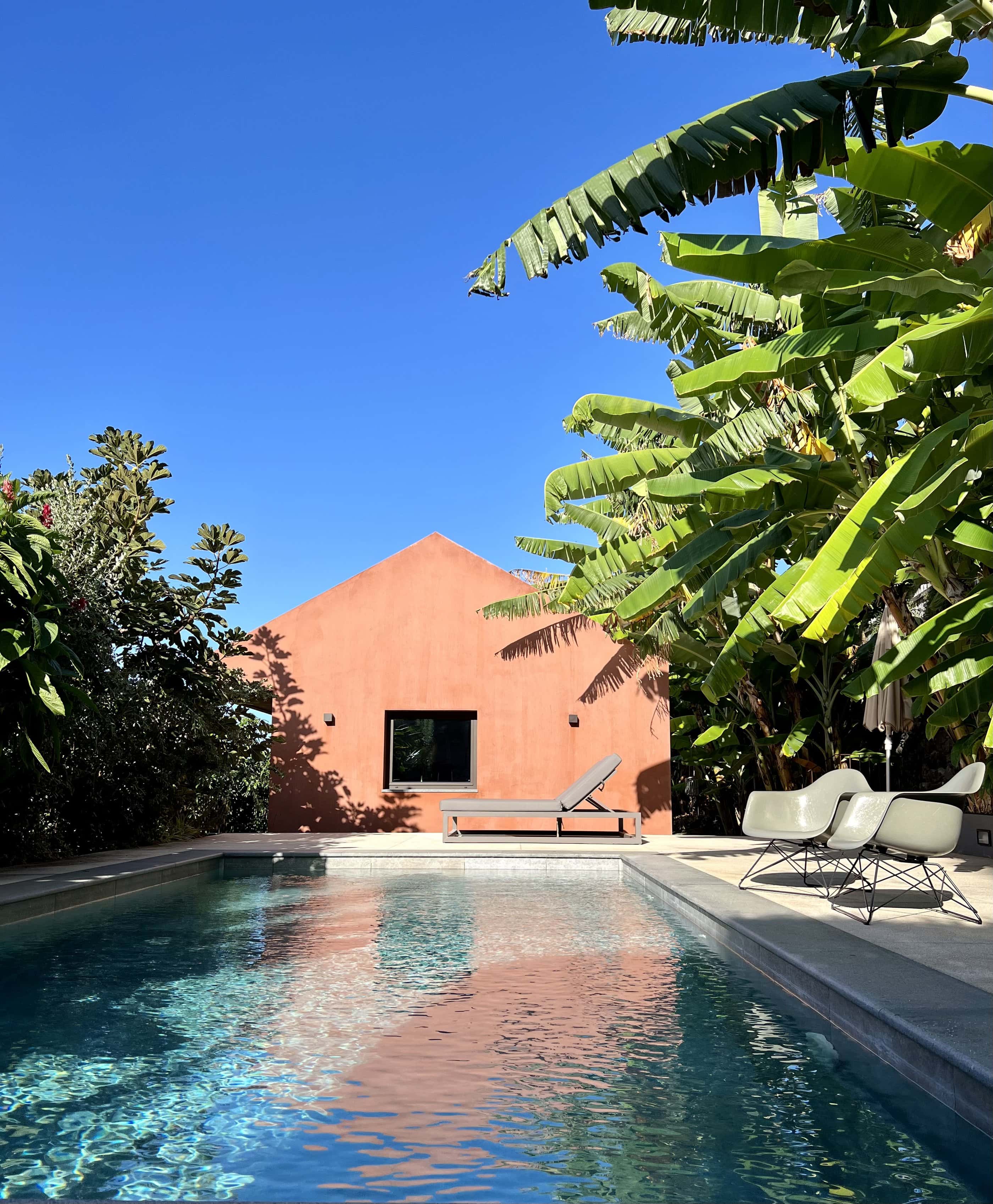 Barefoot on the terrace in the warm morning sun, the scent of mangoes, bananas, and figs in the air, and the sound of the Atlantic in the distance—this is how the days begin here, wonderfully far away from the world. Nestled amid a banana grove on the hillside of the village of Arco da Calheta, within sight of the sea, the terracotta-colored façade emerges from the dense foliage of an exotic garden. The minimalist house, designed by the architects of Tabaibo Atelier, features two levels. Upstairs are the kitchen, dining, and living areas, offering a view of the Fajã do Mar coastline. Every corner of the house is lovingly decorated with a mix of modern design and vintage furniture. The two bedrooms are located in the basement and have direct access to the garden, where mango, fig, and avocado trees grow (picking is expressly encouraged!). Madeira is known for its breathtakingly beauty, so life mainly takes place outdoors. A perfect day therefore not only begins under the open sky, but is also best spent ending there. After a stroll through the market, your shopping haul of fresh fish, meat, and vegetables goes on the grill on the terrace. With the sunset bathing everything in warm light, it’s bound to be a feast.