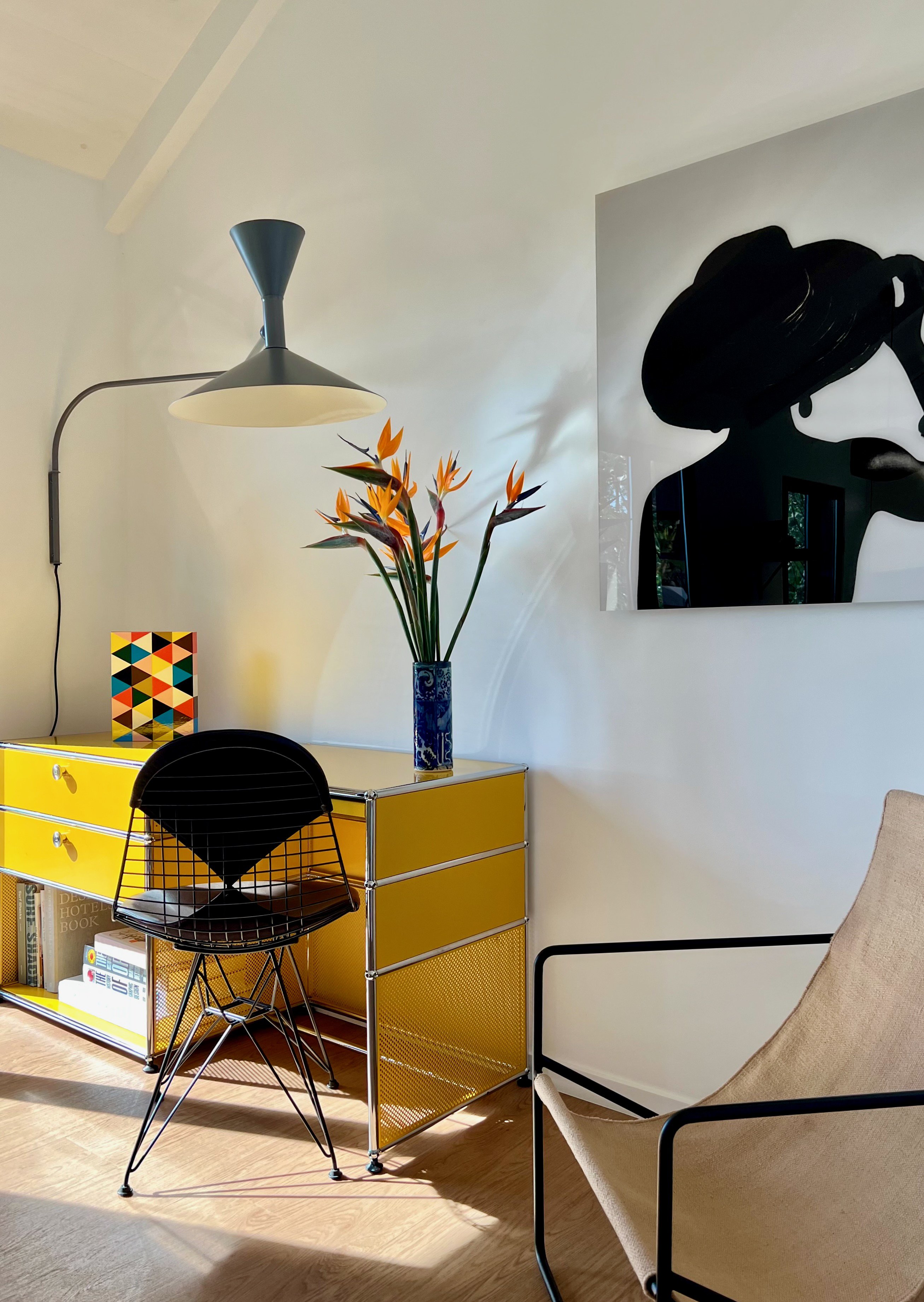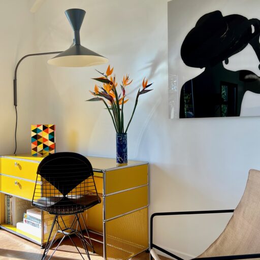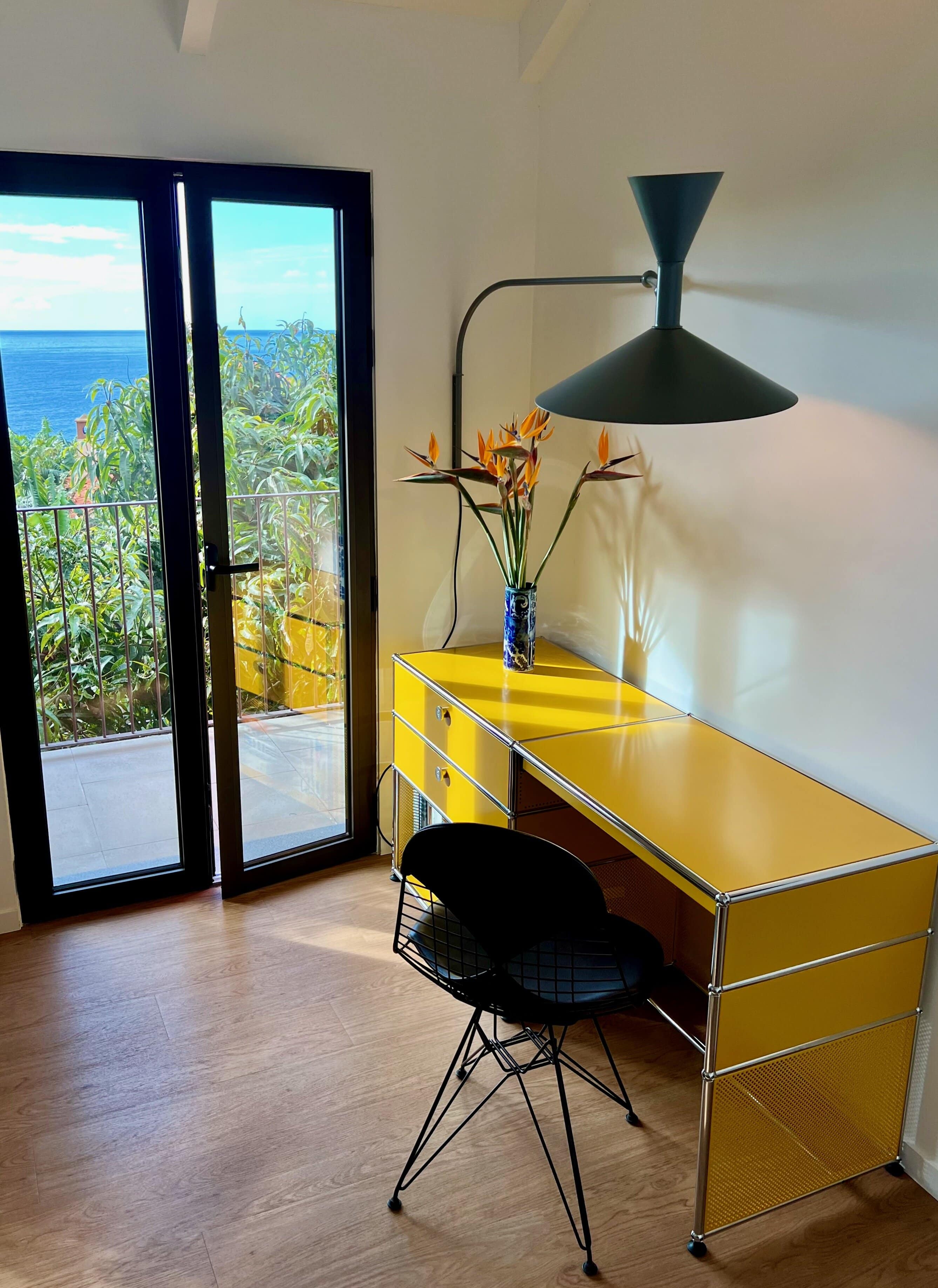 - How small splashes of color create vibrant contrasts in the minimalist design: the dark green subway tiles, the grass-green sink, and the USM designer desk in bright yellow.