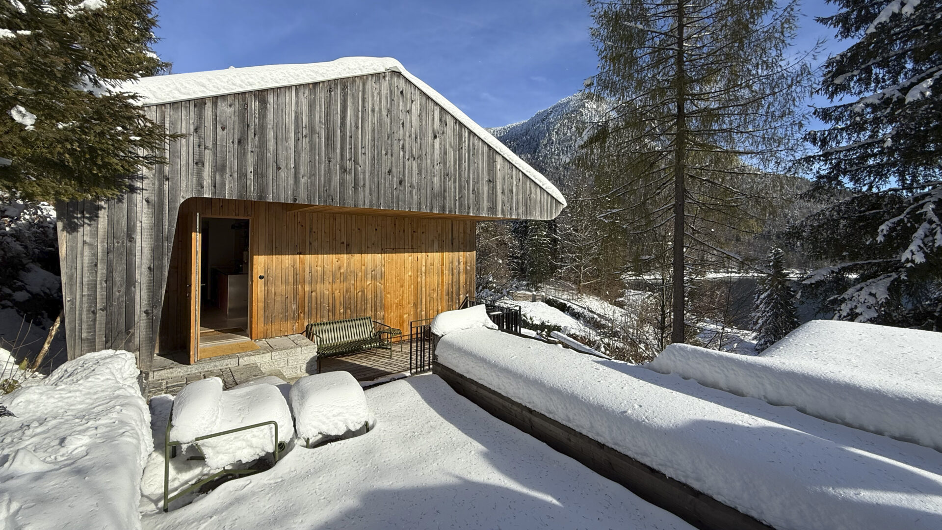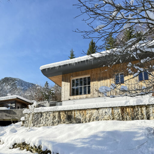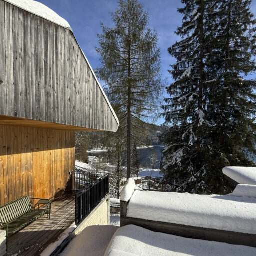 There’s a very special place right at the top of the chalet in Urfeld, just below the ridge: A cushioned lounger positioned under a generous skylight between the sky and the hillside. Lying here, you can gaze at the tips of the fir trees and the vastness of the sky—and forget for a moment that you’re inside a house. In fact, it feels like there’s no boundary between inside and out, as if the building has decided to move a little closer to the landscape. But it’s not only here that the magnificent vista offered by the hillside location has been thoughtfully considered. From the terrace decks, you can enjoy the turquoise, shimmering Walchensee lake and the forest landscape—unwinding in the sauna is even more relaxing, gazing upon those swathes of blue and green. During the renovation of the 1960s house located on the northern tip of the Alpine lake, the natural surroundings were taken into account—in every respect. Here, sustainability is a priority, and existing and regional materials were primarily used in the renovation. The new roof truss, the façade, and the custom-made fixtures are made of local silver fir, and the wood from the old building was reused for the floorboards. The minimalist design, characterized by clean lines, has already won several awards, including the German Design Award 2021. The interior focuses on the quintessential, offering plenty of space to relax and let your thoughts run free. Not only is there a cushioned lounger platform in the loft, which can be reached via an elegant wooden staircase, but also many other places in and around the house where you can feel close to nature—and wonderfully far away from the hustle and bustle of everyday life.