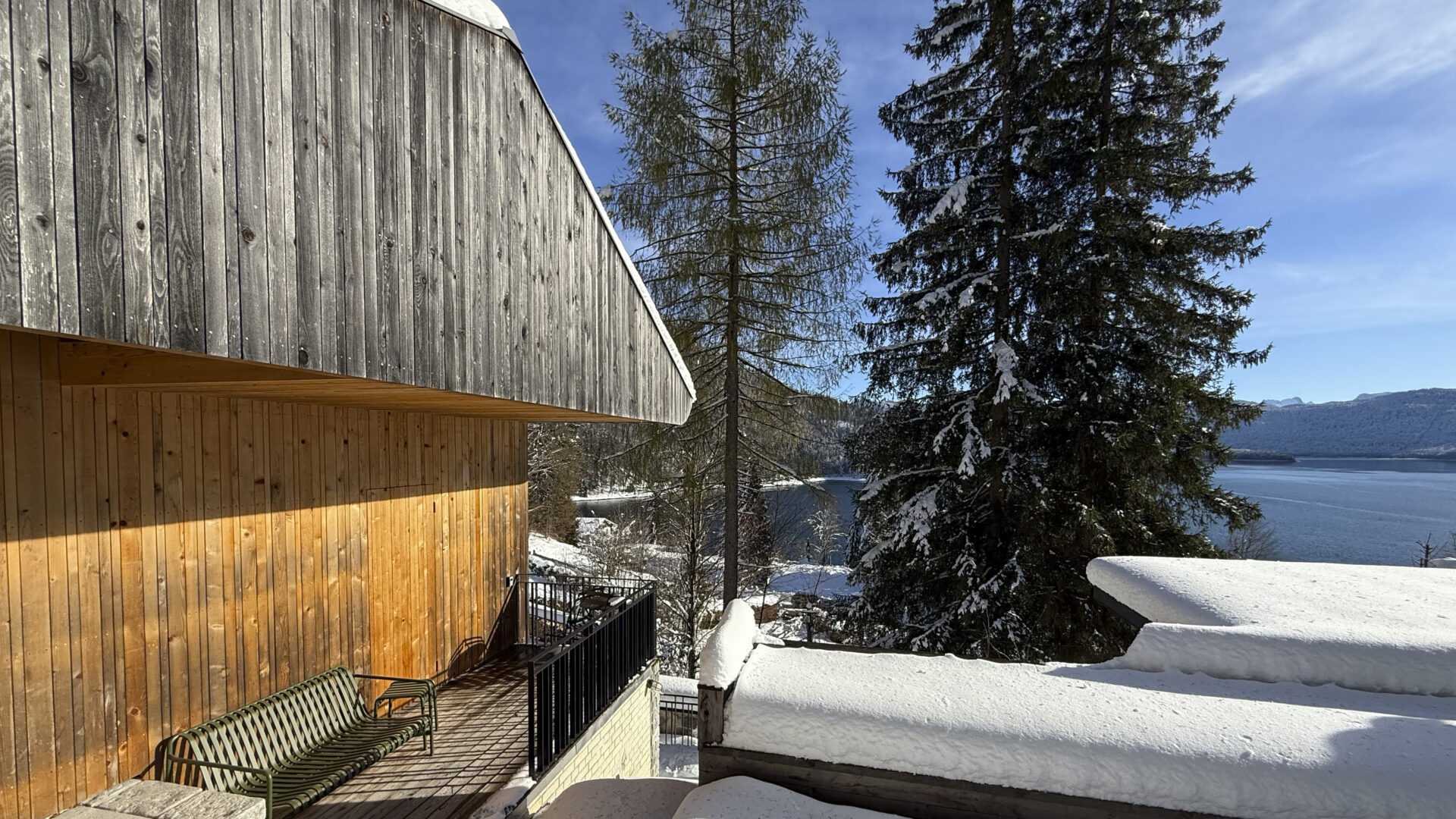 • The curved building envelope, which was designed using regional silver fir, blends harmoniously into the landscape.