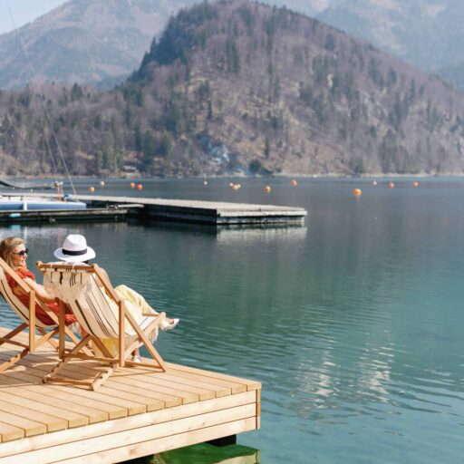 Zwei Gäste auf einem Steg am See in der Villa Alma