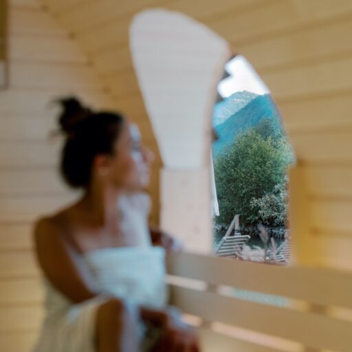 Gast blickt aus der Sana auf die Berge in der Villa Alma