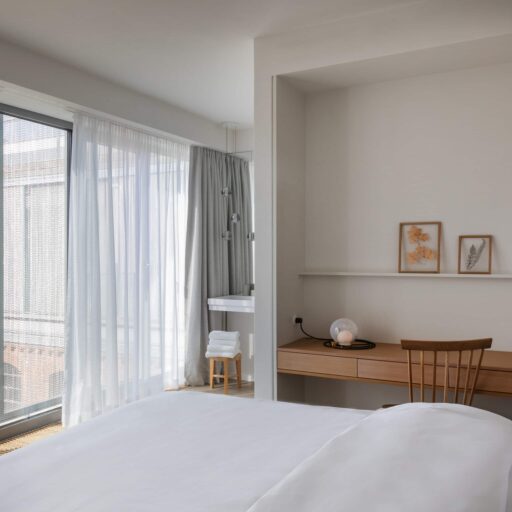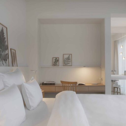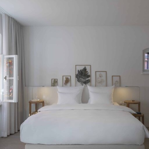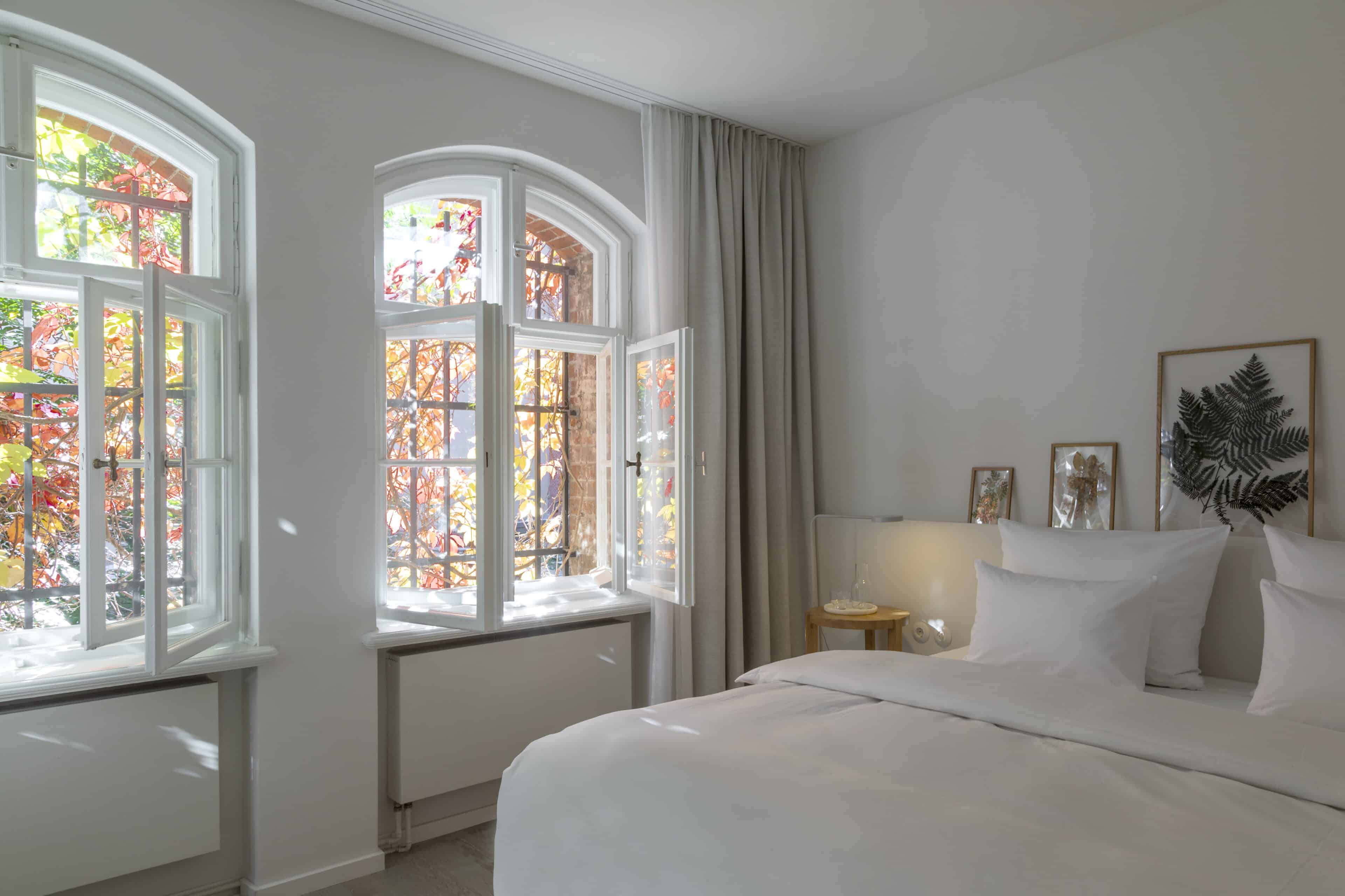 Almut Grüntuch-Ernst and Armand Grüntuch had actually only looked at the old women's prison and district court on Berlin's Kantstrasse for a possible investor. But when that investor dropped out, the architects had already had it. They had a clear vision for the historic brick building from the 19th century, in whose cells, among others, opponents of the Third Reich were imprisoned: a hotel that honors the history of the site and at the same time neither slides into the gloomy nor the trivial (à la "handcuffs at the reception desk"). Grüntuch Ernst Architekten succeeded in this tightrope act with an architectural concept that brings light and warmth to the winding prison wing. Among the 44 rooms are both eleven-square-meter small rooms that fit not much more than a bed and an en suite bathroom, and spacious penthouses. There's particularly ample space in the 75-square-meter suite in the former meeting room. This wide range makes the hotel affordable for different budgets. The architect couple placed great emphasis on environmentally friendly construction, which earned them the German Sustainability Award. The once concrete courtyard became an enchanted garden. It creates a pleasant microclimate, promotes biodiversity and offers guests a view of the greenery. In addition to the hotel, the building complex houses the cultural space Amtssalon and the Lovis restaurant, where chef Sophia Rudolph reinterprets German cuisine. It's best to make reservations in good time, as the tables are booked up quickly. And next door, since 2024, there has been a new building called Carlotta with the Lotta day bar and 5 modern and spacious apartments. This building was also designed by the same architects. Large floor-to-ceiling windows and balconies offer a direct view of the lush Wilmina garden. Whether apartment or room, large or small—there are so many different ways to spend the night here—but only one way to love the Wilmina!