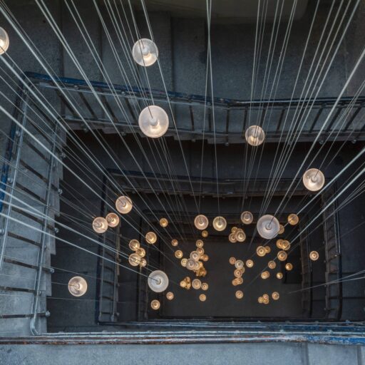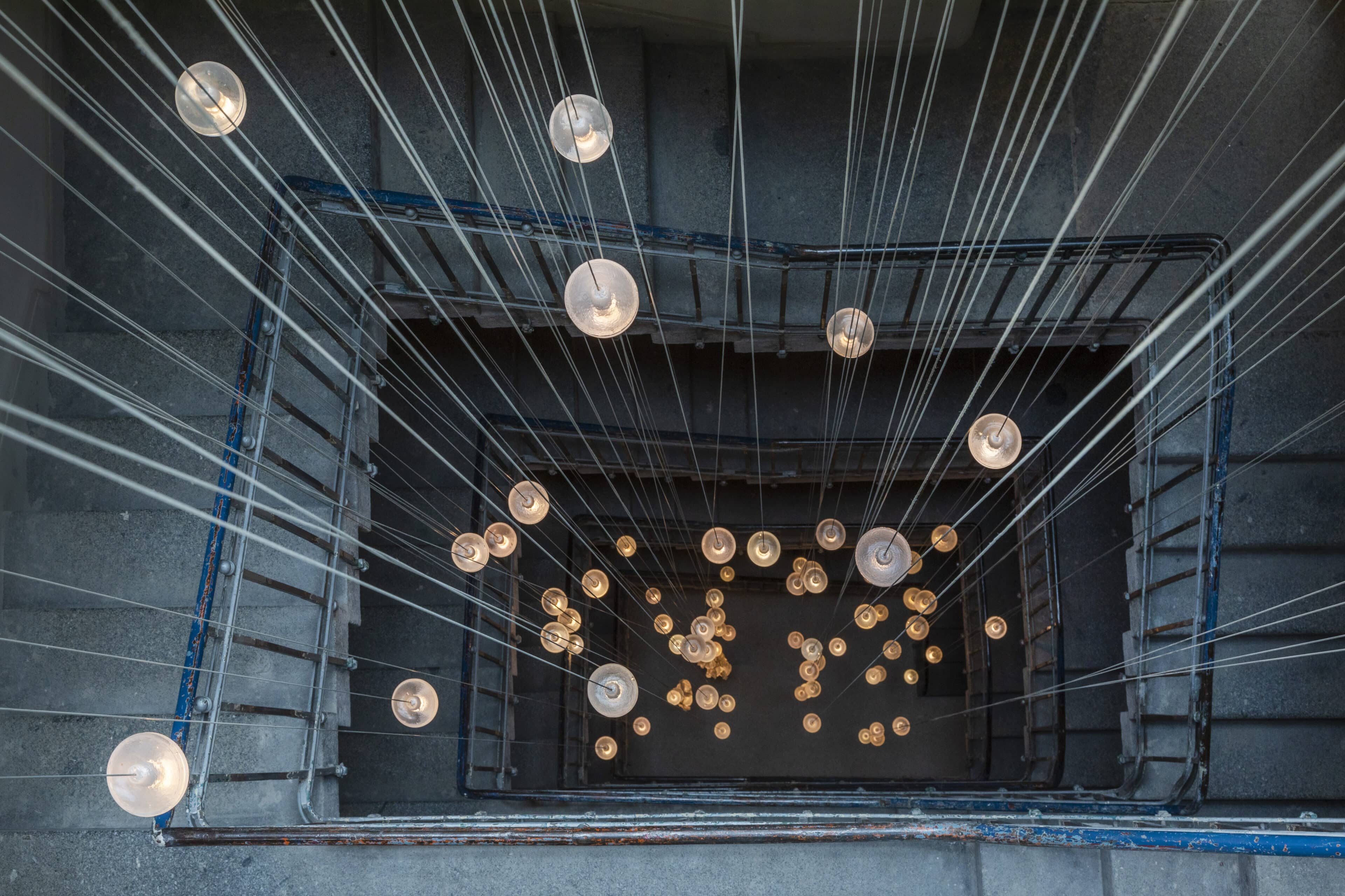 - The narrow corridors with the original wrought-iron railings are relieved of their austerity by a light installation hanging from the ceiling