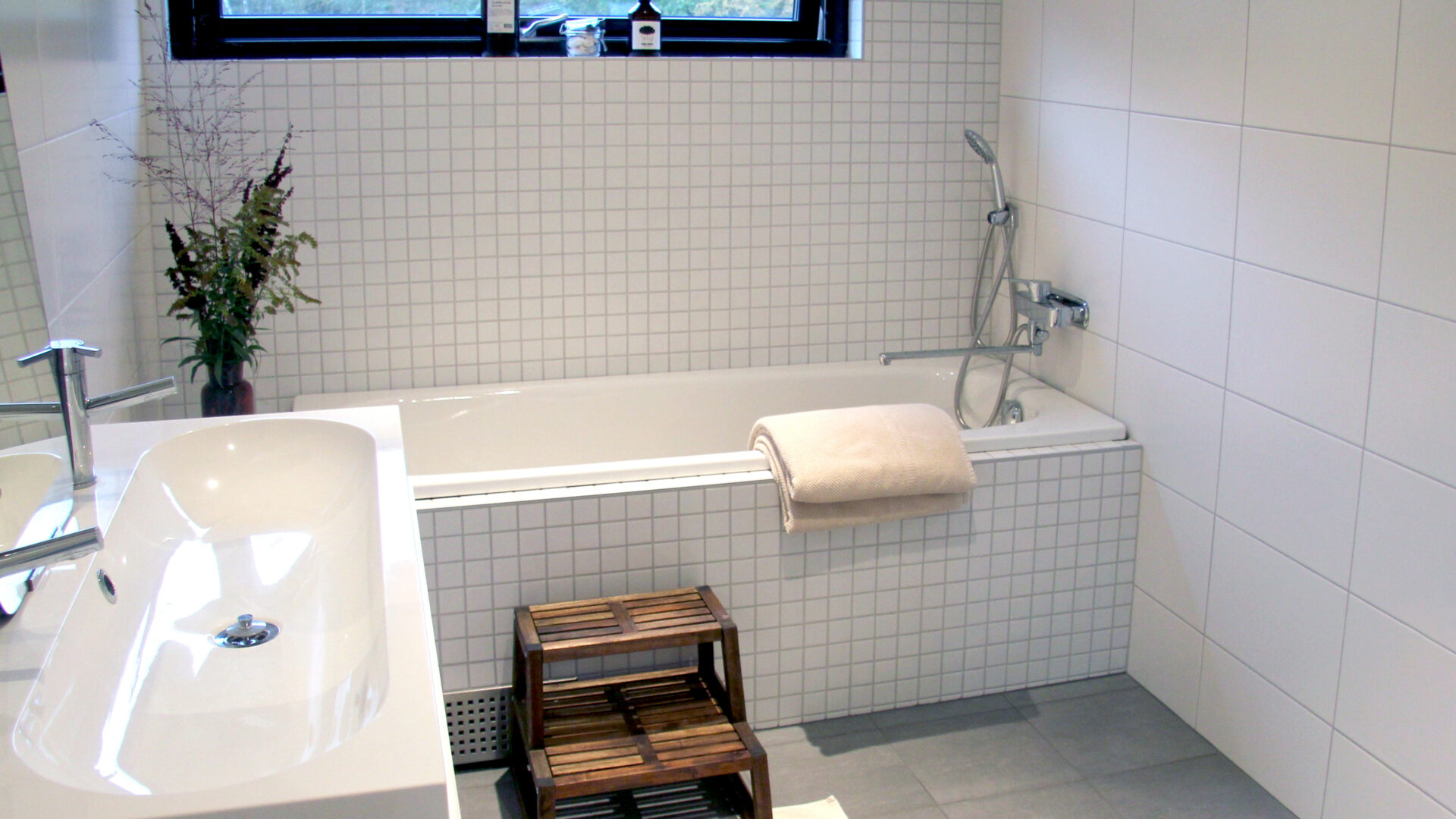- das Badezimmer ist mit Dusche und freistehender Badewanne ausgestattet