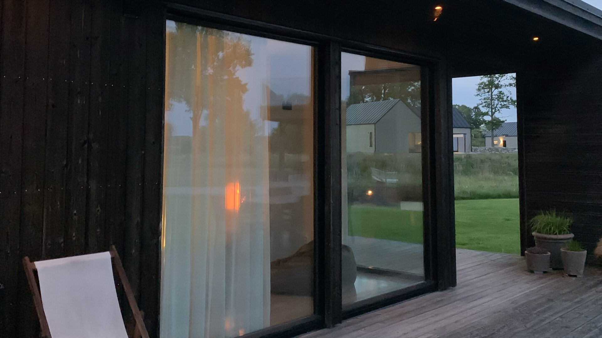 - durch die bodentiefen Fenster im Wohnbereich und von der Terrasse aus geht der Blick ins Grüne und hinunter zum Meer, das nur 150 Meter entfernt ist