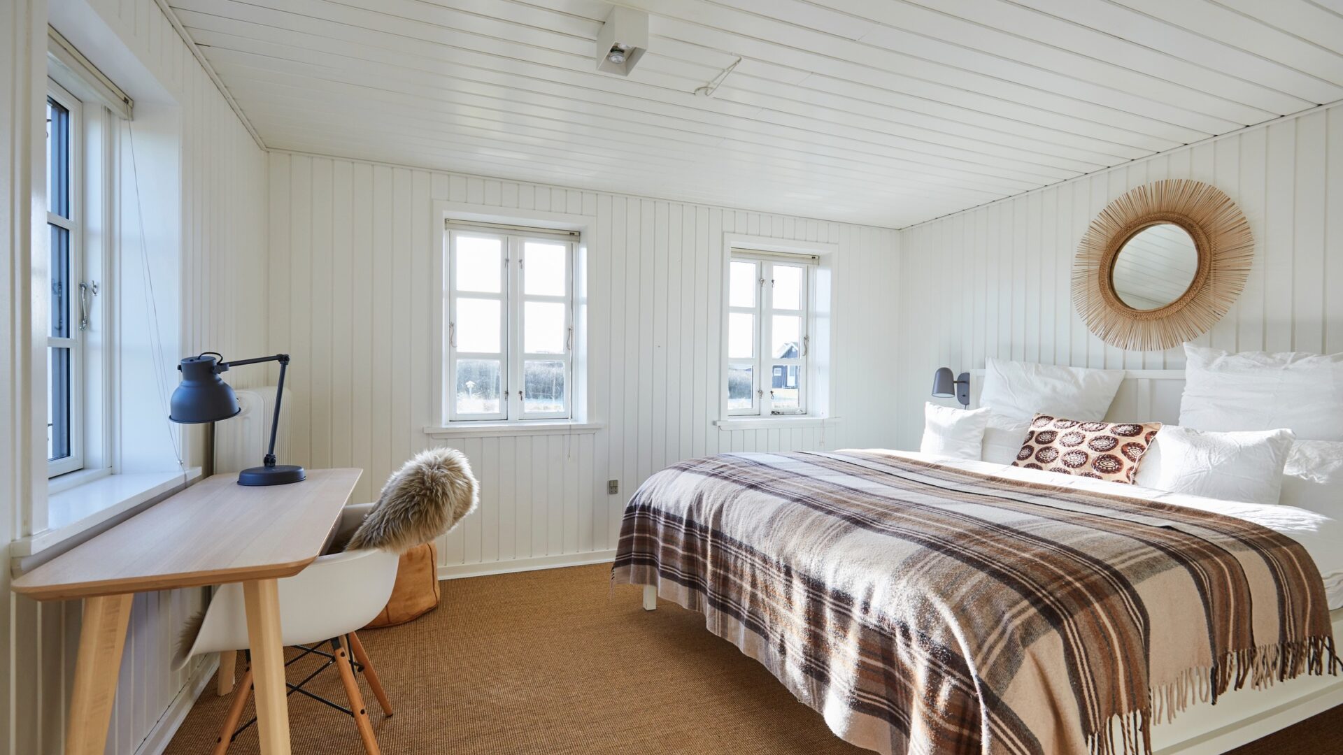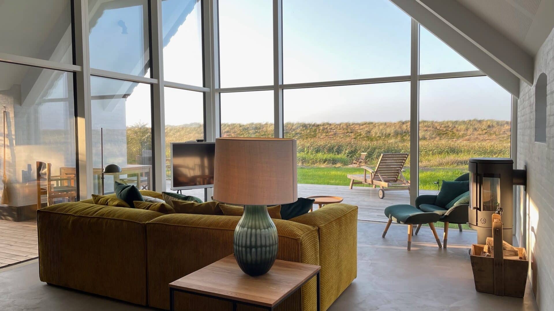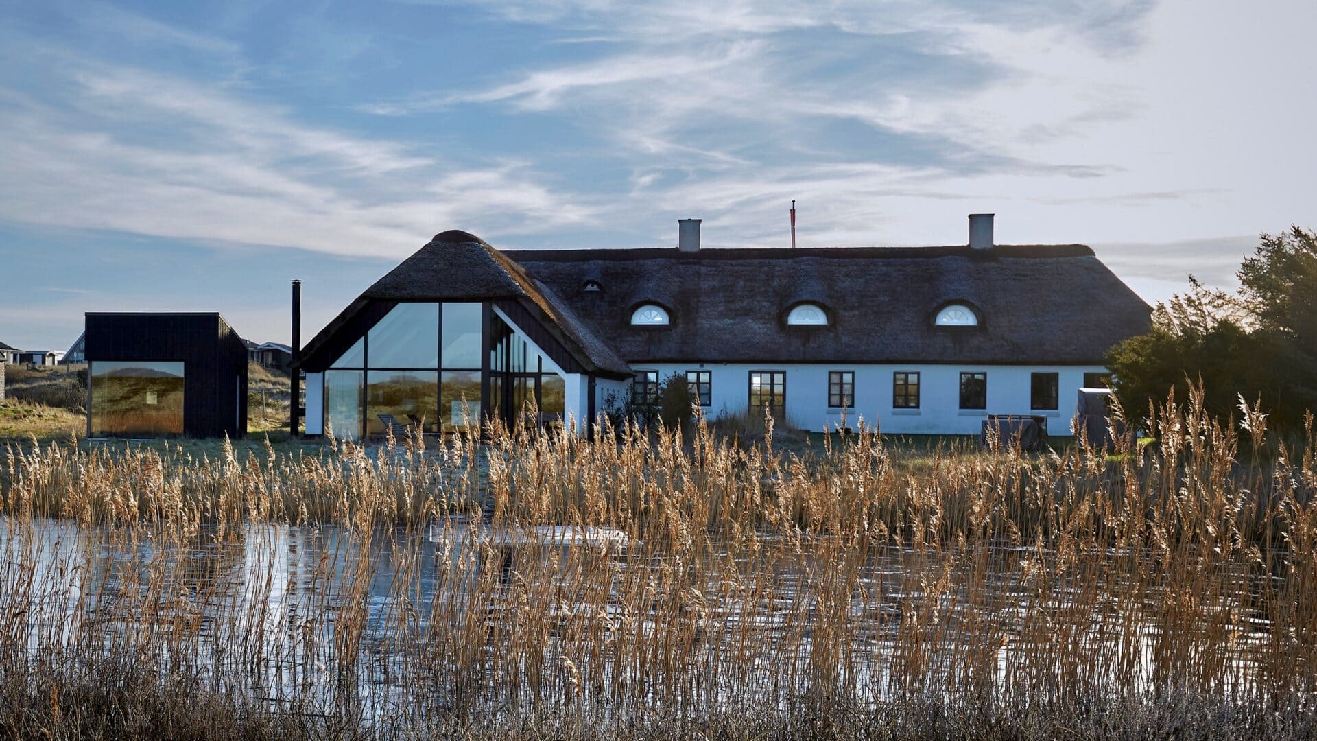 Sitzt man hier am hauseigenen See, entspannen sich Seele und Körper gleichermaßen. Wenn die Sonne aufs Wasser fällt, funkelt es magisch, vorbeiziehende Wolken spiegeln sich darin. Außer den Wind in den Gräsern hört man nicht viel. Perfekte Bedingungen, um seinen Gedanken freien Lauf zu lassen. All das dürfte der dänische Architekt Søren Sarup mit einberechnet haben. Natur, Licht und Wetter spielen in den von ihm geschaffenen Häusern eine große Rolle. Er ist bekannt für seine offenen Grundrisse, die auch dem Agger Farmhouse zugrunde liegen. Ein offener, entspannter Geist ermöglicht viele einzigartige Erfahrungen, so sein Credo, und die kann man im dänischen Agger in dieser besonderen Unterkunft allemal machen. Das denkmalgeschützte Bauernhaus mit Reetdach wurde bereits 1802 erbaut und zuletzt 2020 renoviert. Es besteht eigentlich aus zwei Gebäuden: dem 240 Quadratmeter großen Main House und dem etwas kleineren (und doch 102 Quadratmeter großen) Hayloft. Beide können einzeln oder auch zusammen gebucht werden. Das Hayloft, die ehemalige Scheune, wurde 2021 komplett entkernt und in ein lichtdurchflutetes Loft verwandelt. Die Häuser sind exklusiv ausgestattet: Zurückhaltendes dänisches Design in natürlichen Farben trifft auf erstklassigen Wohnkomfort. Gekennzeichnet von erlesenem Minimalismus verwandeln markante Vintage-Möbel, zeitgenössische Kunst und wohl ausgesuchte Accessoires die Umgebung in einen anspruchsvollen, außergewöhnlichen Rückzugsort für Naturliebhaber. Direkt hinter dem Haus beginnt der Nationalpark Thy, die größte Wildnis Dänemarks. Dazwischen liegt der weitläufige Außenbereich mit dem See, der so schön erdet. Und das ist erst der Anfang von dem, was an diesem Ort sonst noch wartet … Jeder Gast ist herzlich eingeladen, alles zu entdecken!