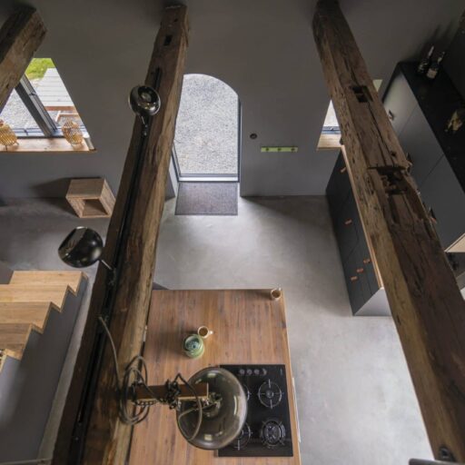 - ein weiteres Wechselspiel erzeugt Spannung: Glatte und fein geschliffene sowie rauhe, unbehandelte Flächen wechseln sich ab und sind haptisch ansprechend: ebenmäßiger Beton und Estrich findet sich neben grob geschliffenen Holzbalken, die glatten Flächen von Treppe und Arbeitsflächen kontrastieren toll zu den Backsteineinfassungen an der Tür, den derben Hanfseilen und der rustikalen Werkbank