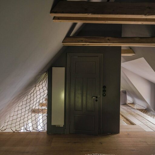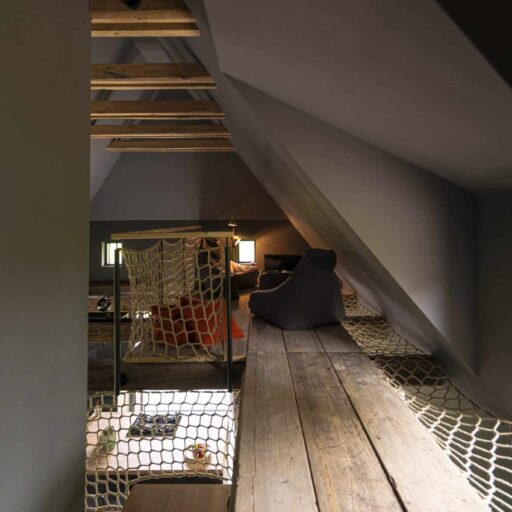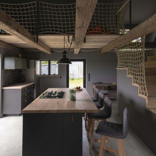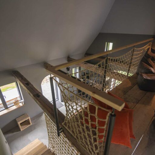 - mit Netz und doppeltem Boden: alte Fischernetze werden wirkungsvoll als Absicherung auf der Galerie eingesetzt, so bleibt das luftige Raumkonzept erhalten