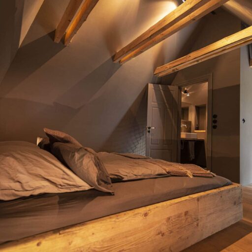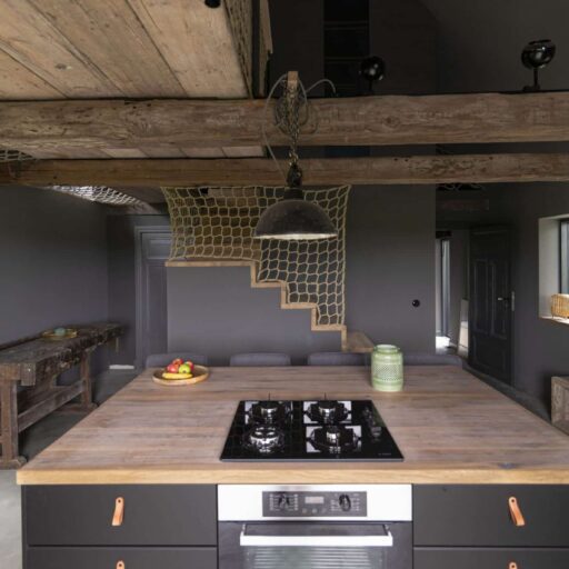 - das Inneneinrichtungskonzept ist sehr ausgewogen, wirkt lässig und gleichzeitig elegant: dem dunklen Grau der Wände, Küchenschränke und der Möbel stehen die warmen Brauntöne der natürlichen Materialien von Eichenholzbalken, Holzarbeitsplatte, Holztreppe und dem „Seilgeländer“ gegenüber