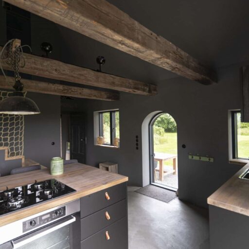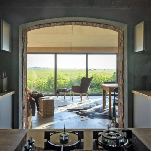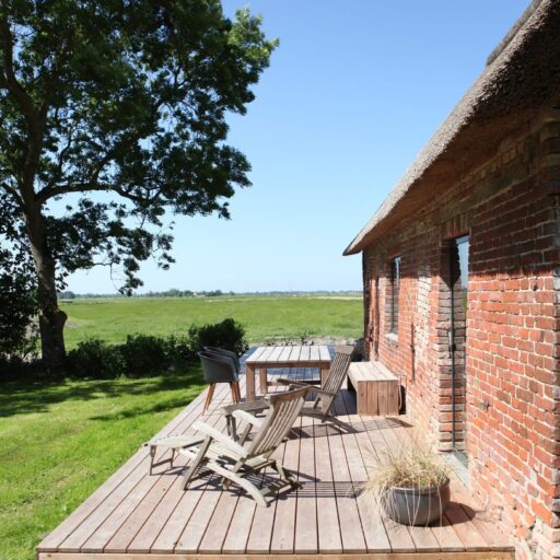 „Da ist eine Schildkröte.“ „Und ich sehe einen Hasen“. So oder ähnlich hört es sich an, wenn man rücklings im Gras des Gartens vom „Alten Schulhaus“ liegt und im Himmel die vorbeiziehenden Wolkengebilde bestaunt. Entschleunigung pur. Ruhig ist es hier – und das bezieht sich nicht nur auf die Geräuschkulisse, hier herrscht auch sonst keine Hast. Alles ist entspannt und unaufgeregt. Die Halbinsel Eiderstedt liegt an der Westküste Schleswig-Holsteins, drei Seiten grenzen ans Wattenmeer. Ursprünglich bestand die Gegend aus zwei Inseln und einer Halbinsel, die durch Eindeichungen dem Meer abgerungen und zu einem neuen Land zusammengefügt wurden. Heute bezaubert das grüne weite Land mit seinen schönen Bauernhäusern und großen Höfen, auch Haubarge genannt. Oft stehen sie einsam in der Landschaft auf sogenannten Warften, künstlichen Erdhügeln, die aus Schutz vor Sturmfluten errichtet wurden. Auch das „Alte Schulhaus“ steht auf solch einer Warft. Das Ferienhaus war zu früheren Zeiten das Wohn- und Arbeitshaus des Lehrers, der die Kinder der Nachbarschaft unterrichtete. Die Großbauern der mächtigen Haubarge schlossen sich oft zusammen und kümmerten sich um die Bildung ihrer eigenen Kinder und die der Bediensteten. Doch heute liegen nicht mehr Griffel, Schulbücher und Tafeln auf dem Tisch. Die Küche ist zu einem offenen Wohnraum umgebaut worden. Am hohen Tresen trifft man sich zum Klönen, Spielen oder Essen. Das Gastgeberpaar Gerrit Siegfriedsen und Angelika Stark hat das kleine Lehrerhäuschen zu einem modernen Ferienplatz mit Hygge-Atmosphäre umgestaltet. Über dem Küchen-Wohnraum mit fantastischem Blick zu drei Seiten, befindet sich die Galerie mit Lounge-Ecke, Bad und weiterem Schlafplatz. Nur durch ein Netz aus Seilen abgetrennt, behält der Raum seinen offenen und luftigen Charakter. Besonders fein gelungen ist das Wechselspiel aus alten und rustikalen Materialen mit der modernen und hochwertigen Ausstattung und Einrichtung. Schlicht, funktional und lässig kommt das daher. Wer hierher zurückkehrt, vom Wind durchgepustet und nach ausgiebigen Spaziergängen, Ausflügen an den weiten Nordseestrand oder dem entspannten Wolkengebilde-Gucken im großzügigen Garten, wird sich auf jeden Fall hyggelig wohlfühlen.
