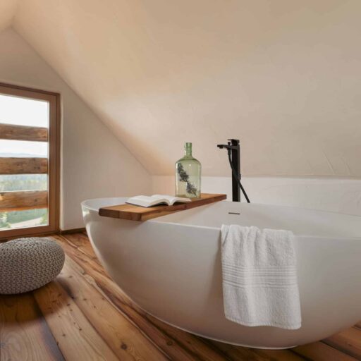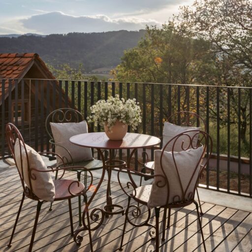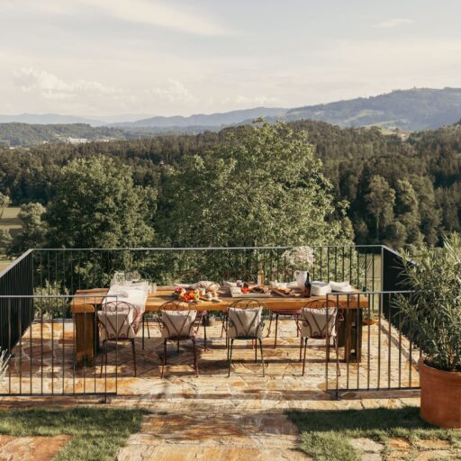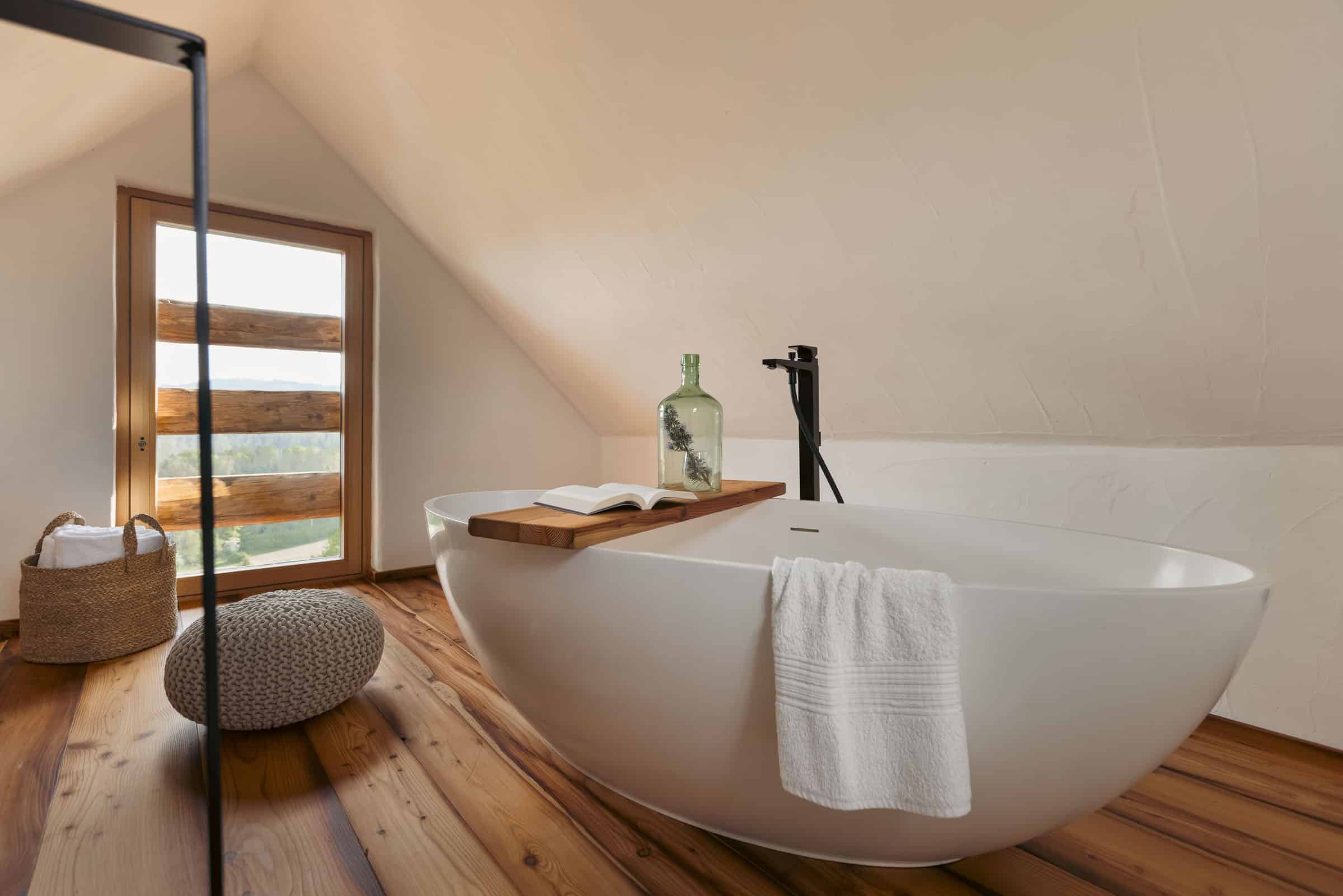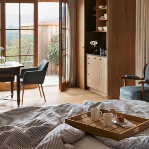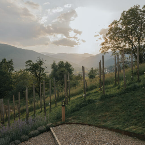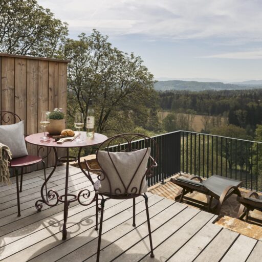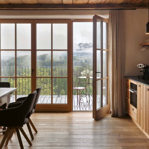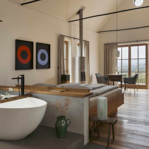 Auf halbem Weg zwischen Graz und Slowenien schmiegen sich Sepp, Franzl und Rosa an einen grünen Hang. Die drei sind weder Kinder noch Hunde oder Schafe – es sind drei kleine, luxuriöse und gemütliche Ferienhäuser mit dem „Nachnamen“ Wildbachberg, vorrangig für Paare, die sich erholen wollen und dabei die Ruhe in der Natur schätzen. „Fernab des Schnellen langsam sein“ lautet das Credo der Gastgeber Johanna und Günter Krainer, die sich in das alte Anwesen, das die Vorbesitzerin 100 Jahre lang glücklich bewohnt hatte, Hals über Kopf verliebten und es mit viel Hingabe und Aufwand saniert haben. Die drei hübschen Häuser gruppieren sich um einen kleinen, eleganten Infinity-Pool. Jedes hat eine eigene Zirbenholz-Sauna mit Panoramaverglasung erhalten, uneinsehbar für andere Gäste, dafür mit fesselndem Blick auf die weite Natur des Schilcherlandes. Die top ausgestatteten Refugien versprühen den Charme traditioneller, steirischer Bauernhäuser und punkten in ihrem Inneren mit modernen Details, selbstgefertigter Glaskunst, Eichenparkett, Fußbodenheizung, Panorama-Gaskaminofen, breiten Doppelbetten, voll ausgestatteter Küche und schickem Badezimmer. Rosa, die Sanfte, beherbergte ehemals zartrosa Borstentiere, Sepp hat sein erstes Leben als Troadkostn gelebt, in ihm wurde das Getreide aufbewahrt. Franzl hat zwei Etagen: oben befinden sich Schlafzimmer mit freistehender Badewanne und ein Kinderzimmer, unten ist die Küche mit Essbereich, Kamin und Sofa. Rosa, Franzl und Sepp lassen sich einzeln oder gemeinsam als exklusives Urlaubsrefugium buchen. Nach dem morgendlichen Yoga in den Liegestuhl legen und die weite Natur der Weststeiermark bewundern? Zur Erfrischung in den Pool springen? Oder lieber loswandern und die hügelige Weinregion zu Fuß oder auch per Radl entdecken? Erholung bedeutet für jeden etwas anderes – rundum wohl fühlen sich hier aber ganz bestimmt alle!
