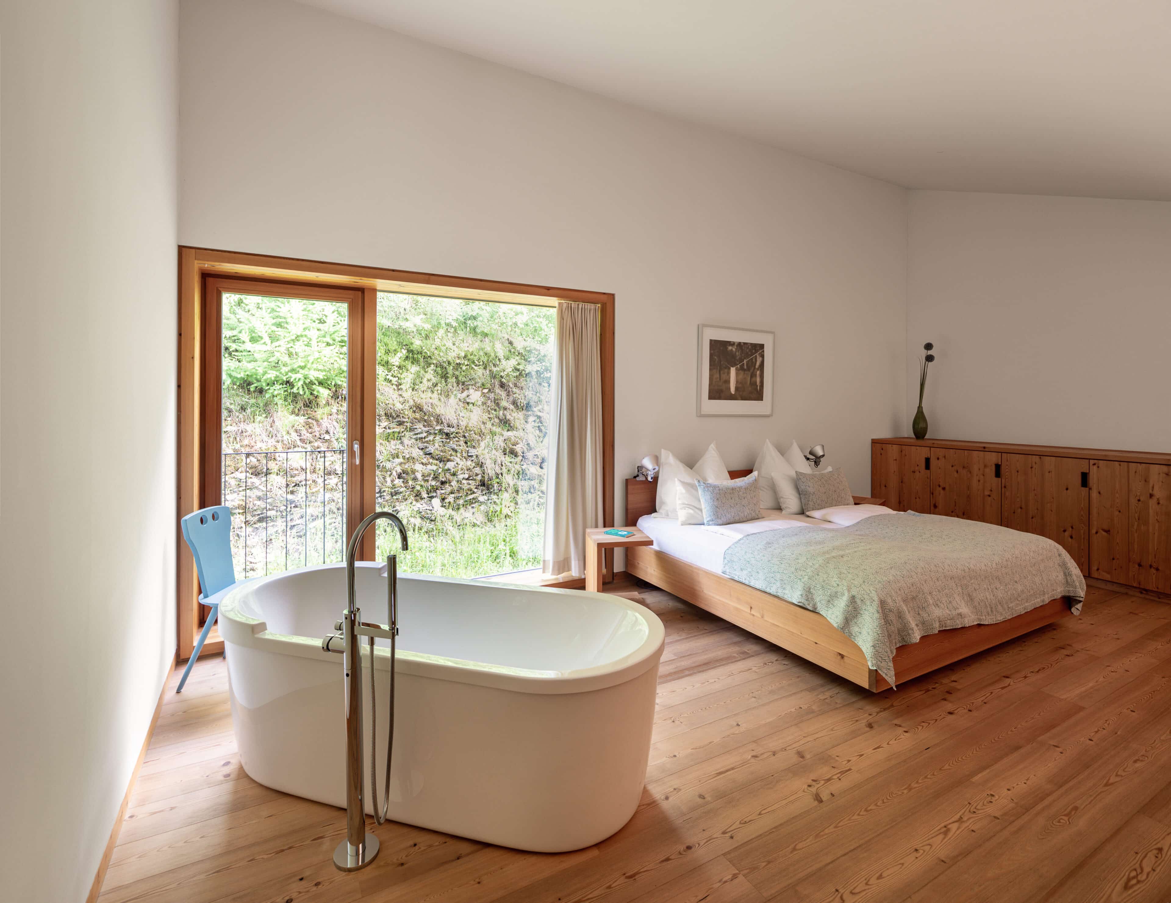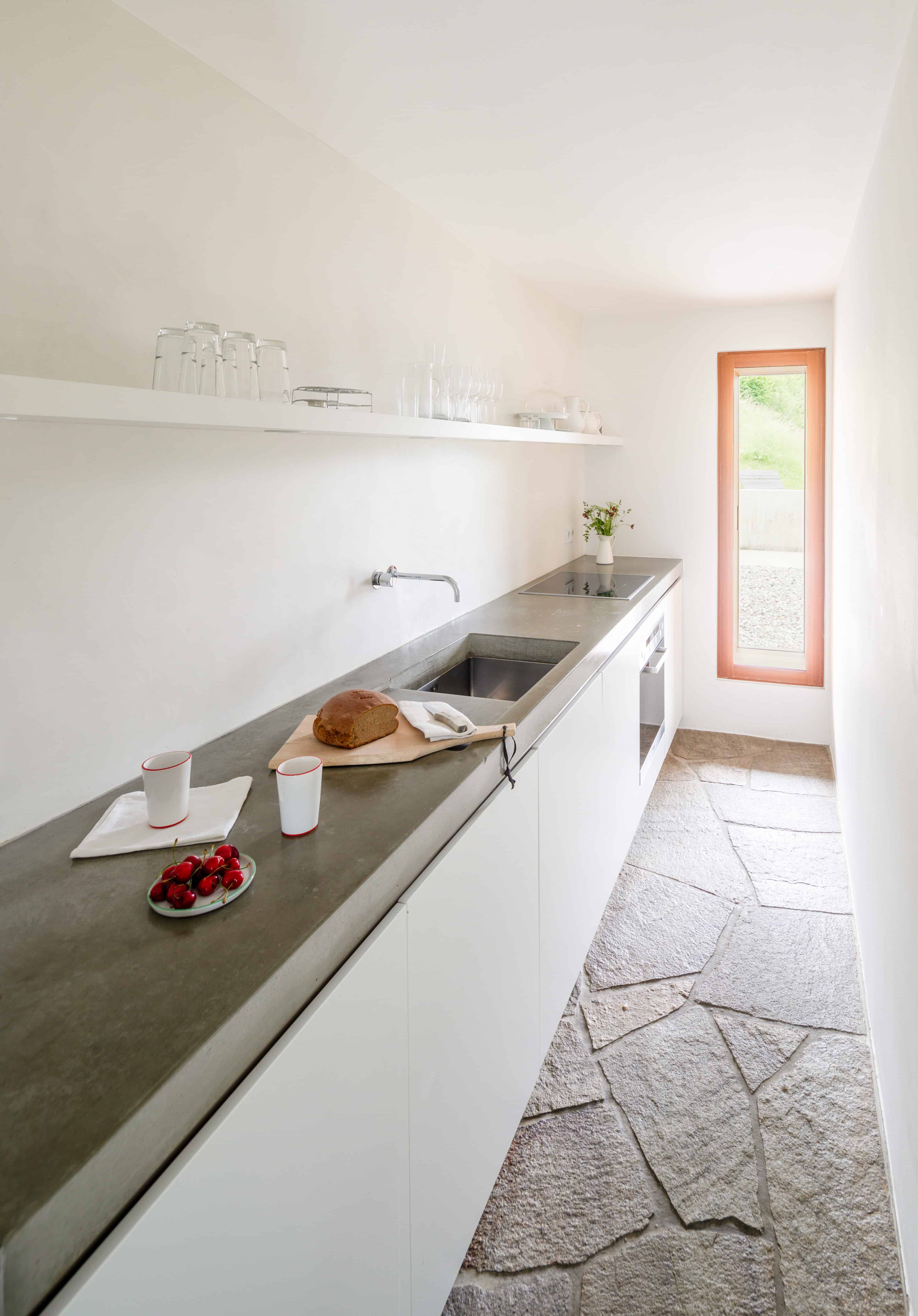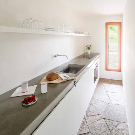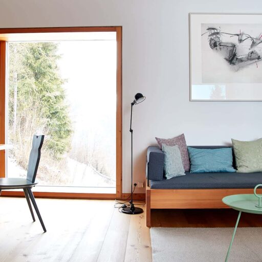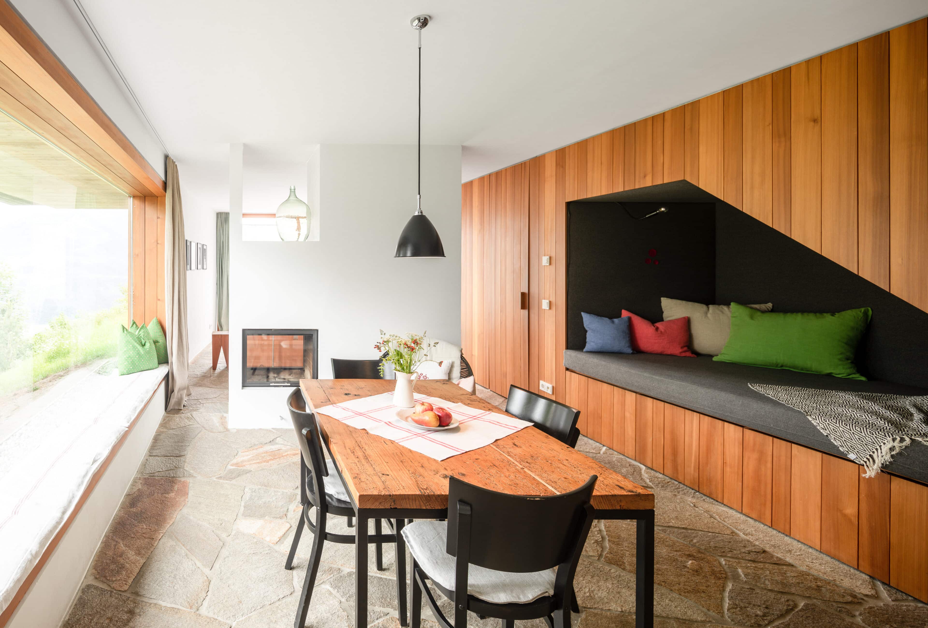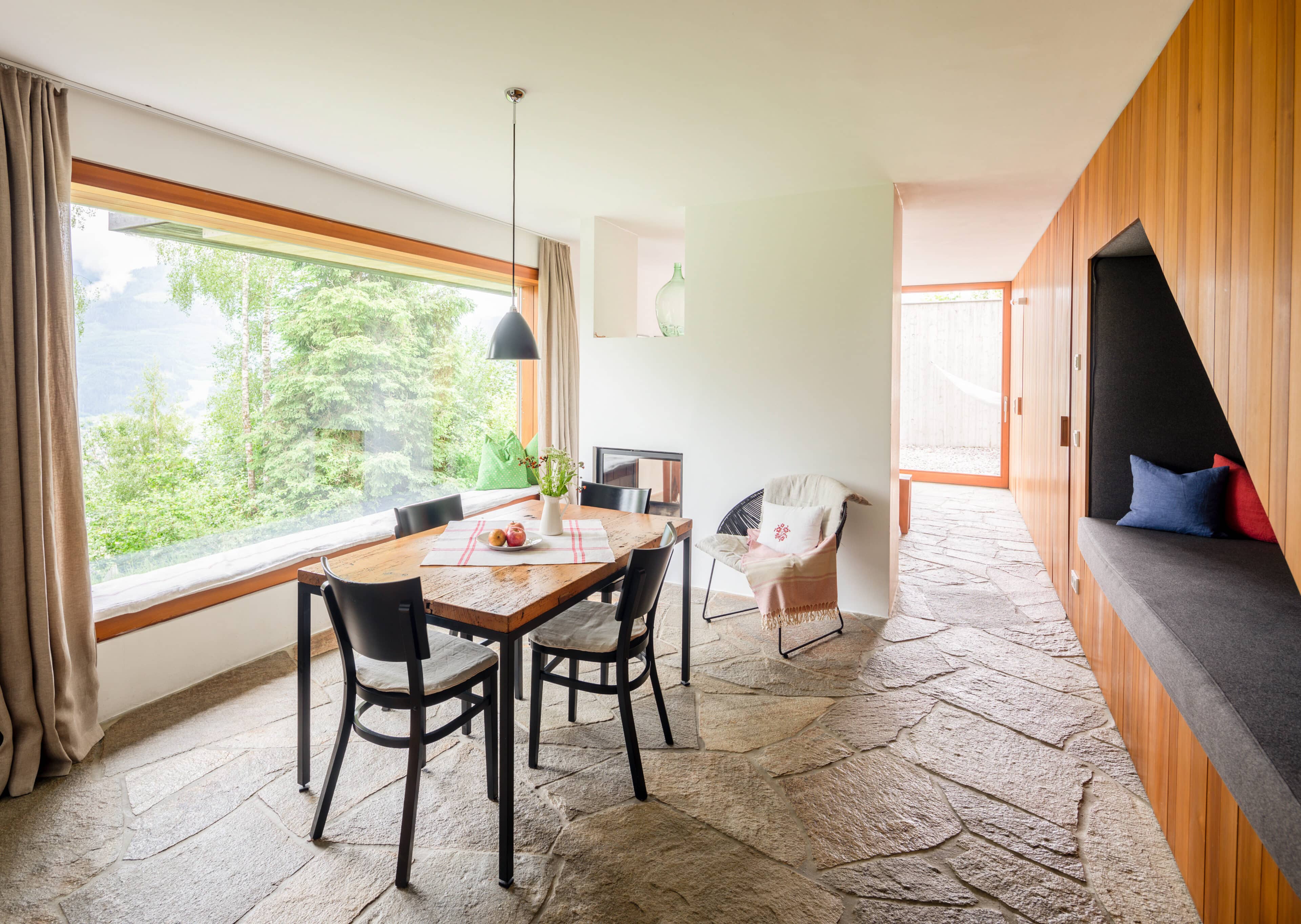 • den schönen Boden aus großen Steinplatten im Spatzennest sowie die große Lodensitznische und natürlich das große Panoramafenster