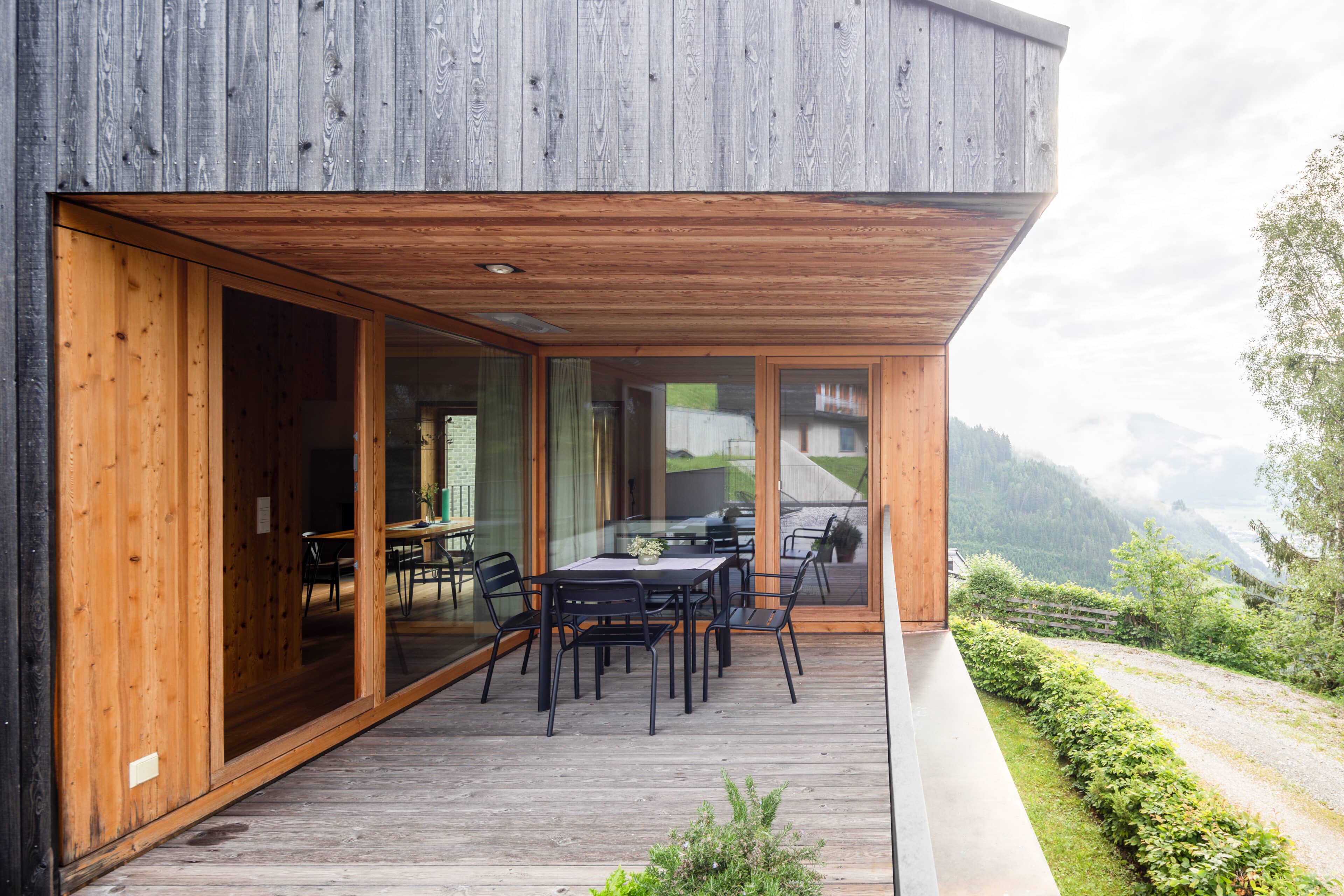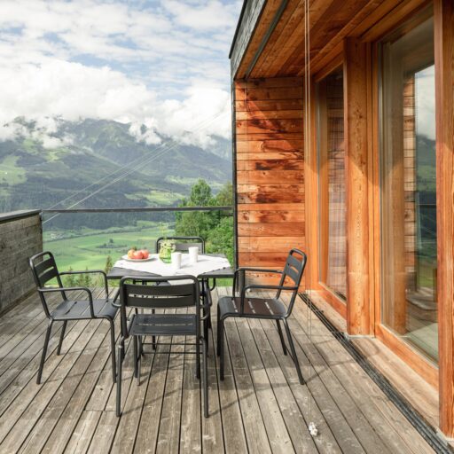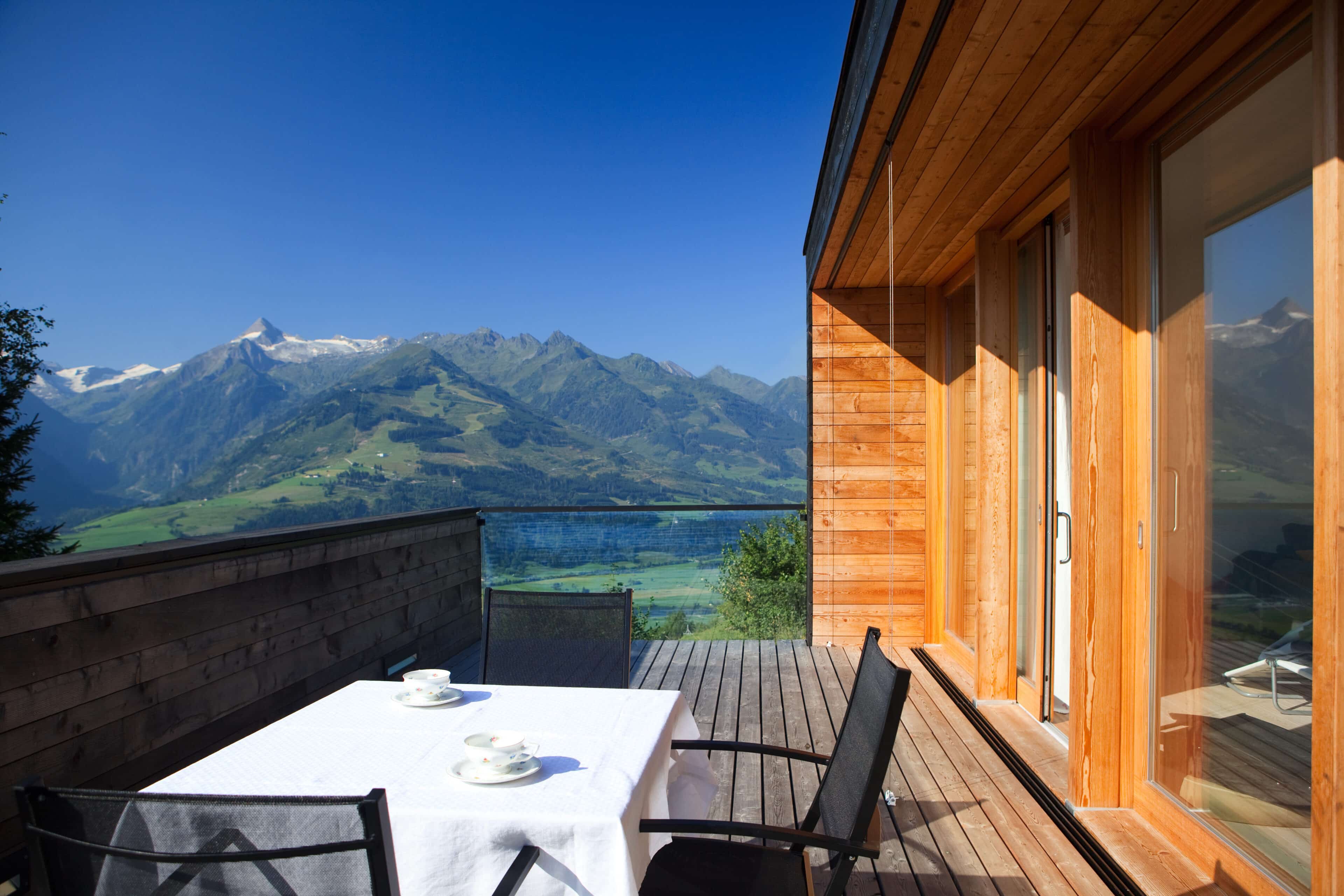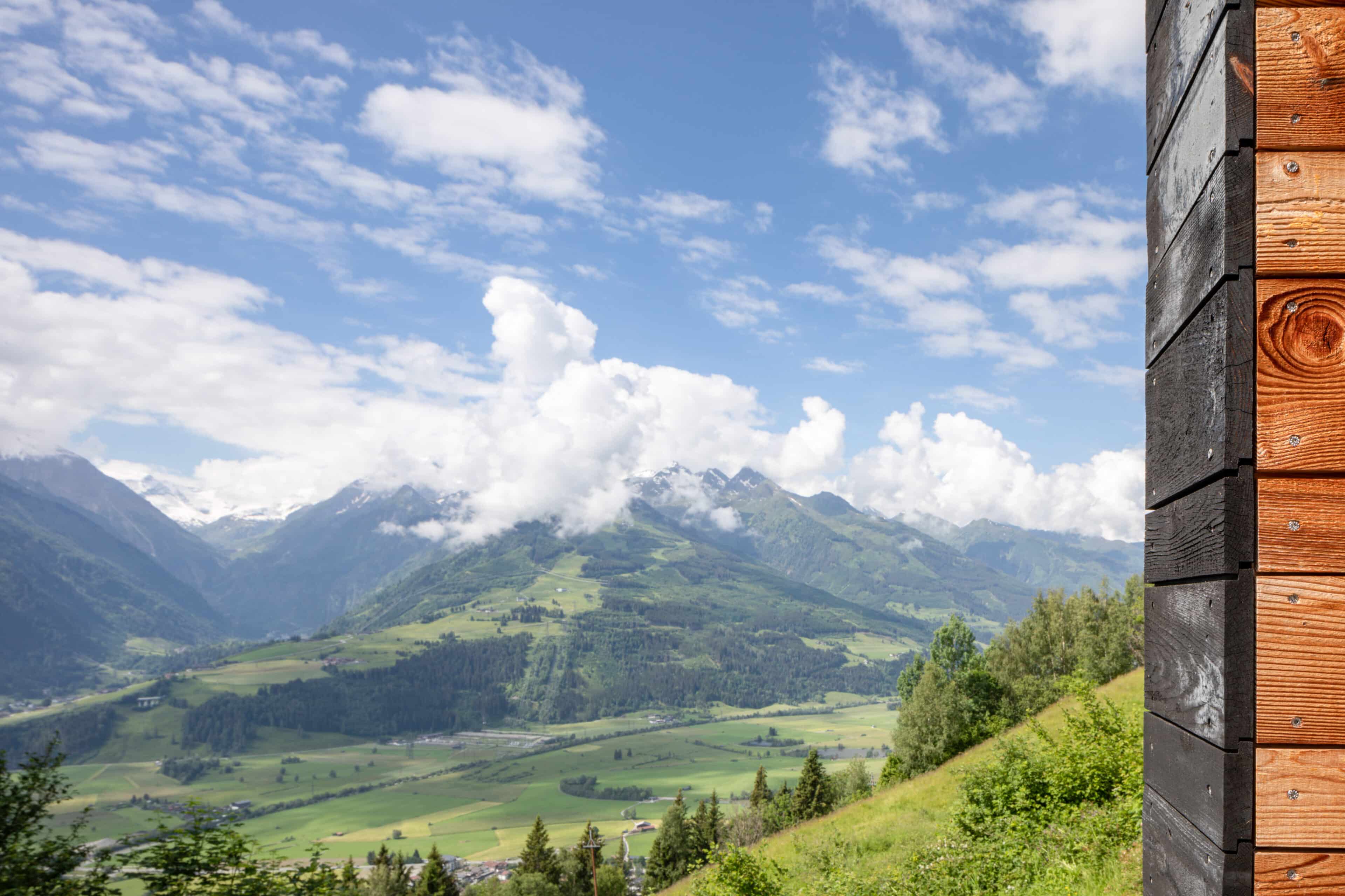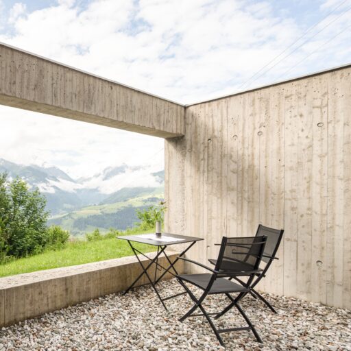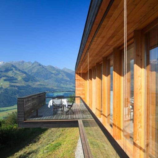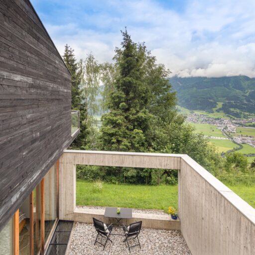 In Architekturhighlights wohnen: Die beiden Ferienhäuser Aufberg 1110 und 1113 wurden als kühnes und geradliniges Statement mitten in einen Hang der Hohen Tauern hineingeplant und bereits für mehrere Architekturpreise nominiert und ausgezeichnet. Zwei Inseln der Ruhe mitten in den Bergen, auf 1110 Meter Höhe und 1113 Meter Höhe über dem Meeresspiegel. Die perfekt geplanten Sichtachsen in den vier außergewöhnlichen Wohnungen beglücken Freunde von ausgewogener Symmetrie, die natürlichen Materialien aus naturbelassenem Holz, Stahlbeton und hellgrauen Stein erfreuen das design- und architekturaffine Herz. Durch die riesengroßen Fenster fühlt man sich inmitten der Natur und ist doch gleichzeitig gut beschützt. Im Aufberg 1113 sieht man vom Apartment Schwalbennest durch die Fensterrahmen auf die Gletscher wie auf ein Bild an der Wand. Absolutes Highlight ist die in luftiger Höhe schwebende Terrasse. Diese ist mittlerweile tatsächlich legendär, denn sie ziert zahlreiche Cover von Reise- und Architekturmagazinen. Die zweite Wohnung, das Spatzennest, bezaubert mit einem fantastischen Rundumblick von Ost nach West. Die beiden Wohnungen im kleineren Haus Aufberg 1110, Freisitz und Ansitz, haben ganze Wände und Einbauten aus Holz, mit unterschiedlichen Raumhöhen und Galerien und begeistern ebenfalls mit großen Panoramafenstern. Sie verbreiten die Wärme und Behaglichkeit einer klassischen Berghütte, samt Kamin und knisterndem Holzfeuer. Auf dem Berg im Aufberg zu wohnen, ist eine ganz besondere Erfahrung.