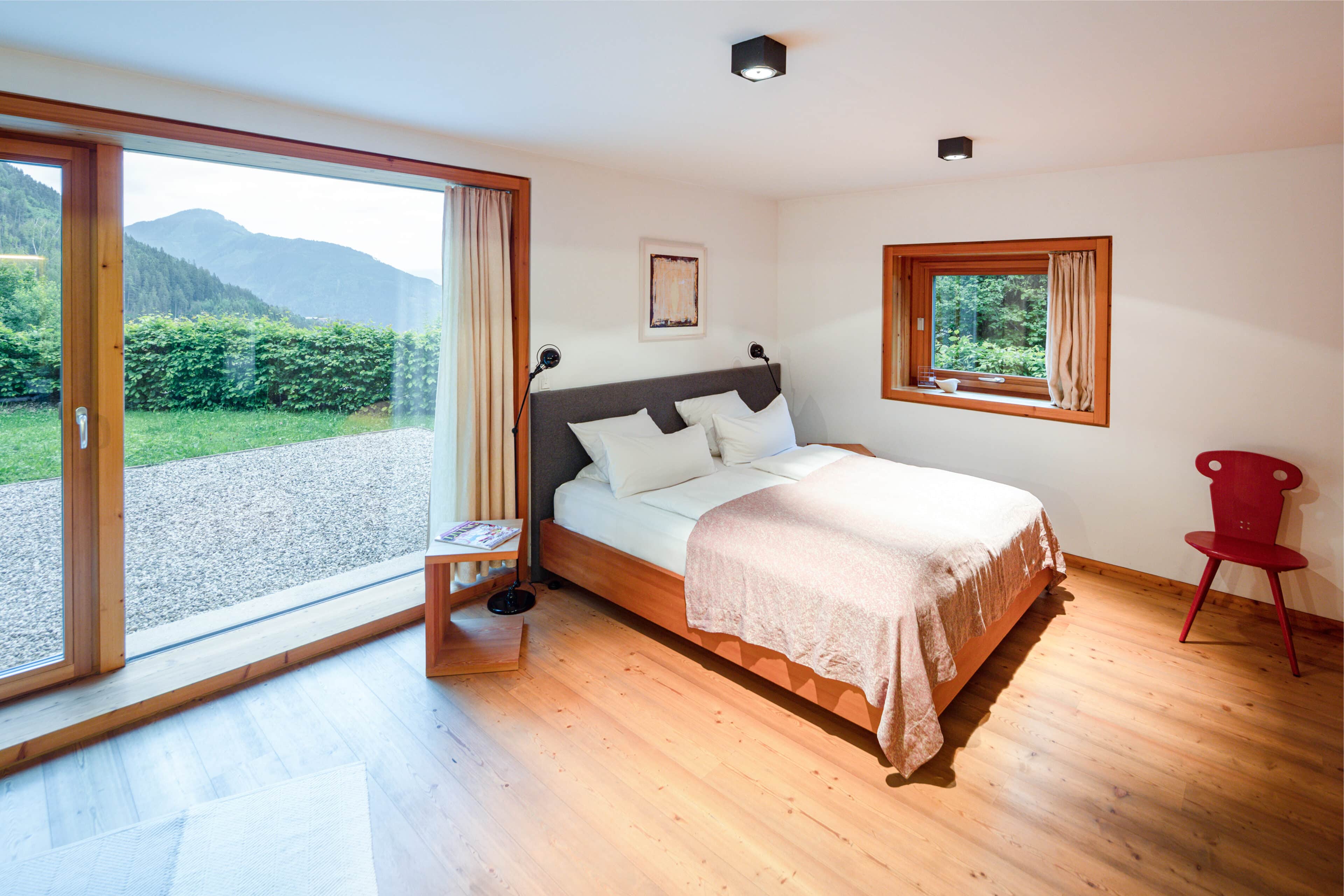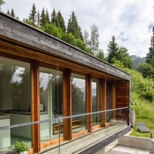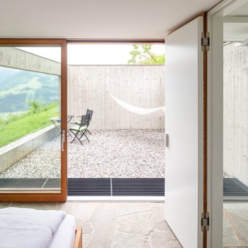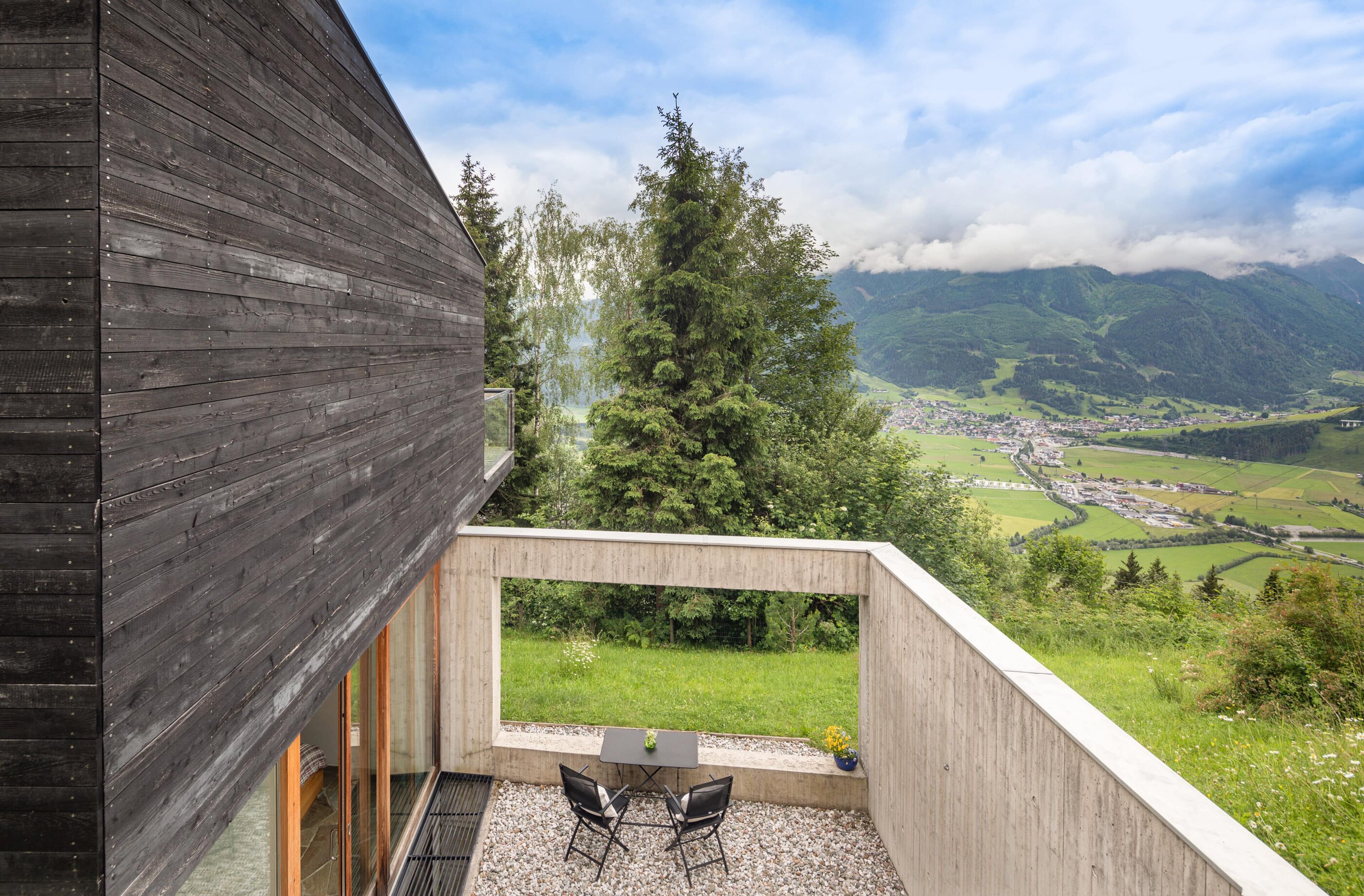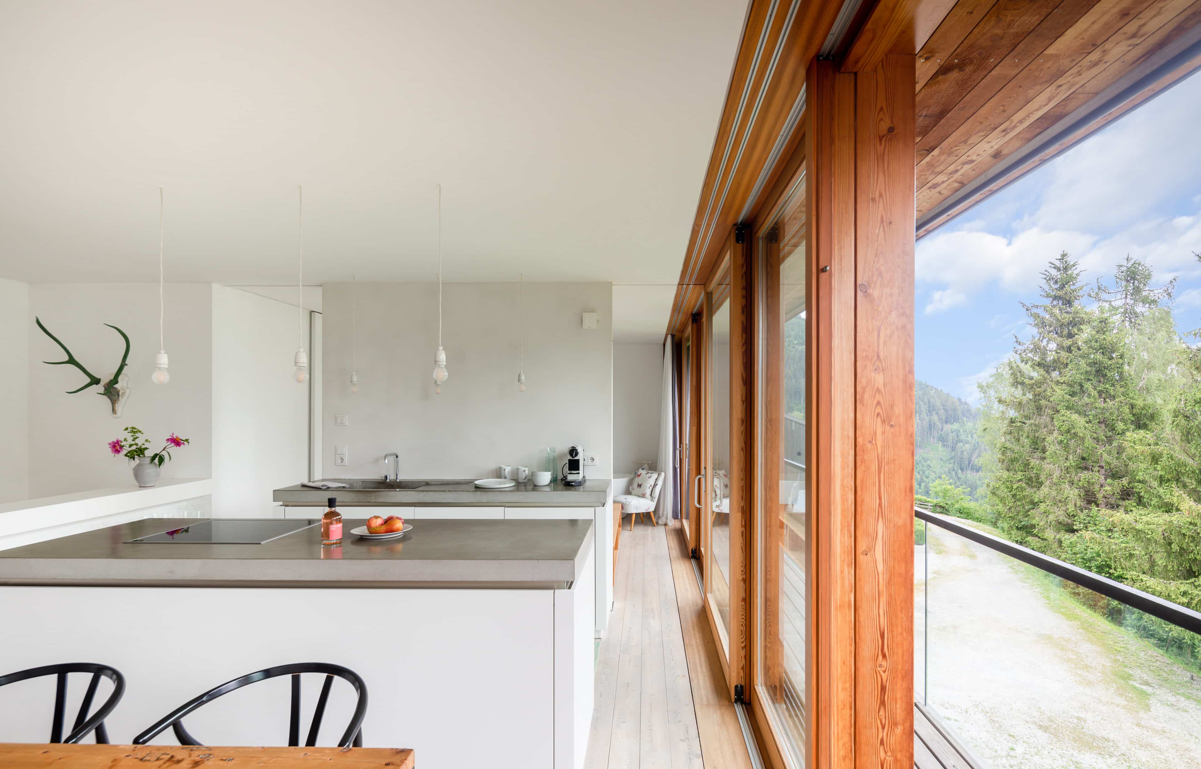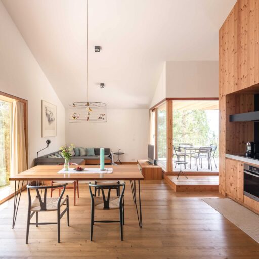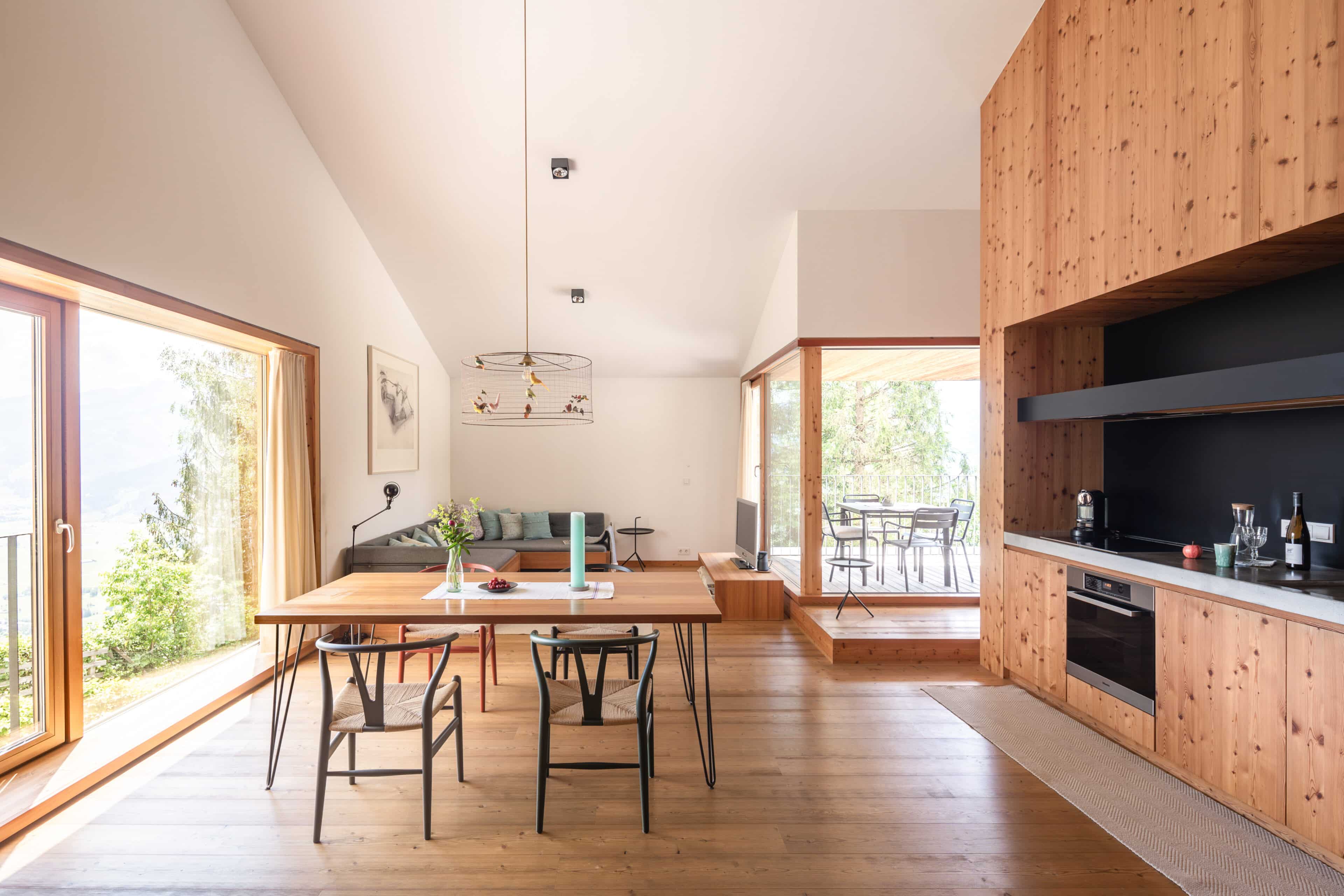 In Architekturhighlights wohnen: Die beiden Ferienhäuser Aufberg 1110 und 1113 wurden als kühnes und geradliniges Statement mitten in einen Hang der Hohen Tauern hineingeplant und bereits für mehrere Architekturpreise nominiert und ausgezeichnet. Zwei Inseln der Ruhe mitten in den Bergen, auf 1110 Meter Höhe und 1113 Meter Höhe über dem Meeresspiegel. Die perfekt geplanten Sichtachsen in den vier außergewöhnlichen Wohnungen beglücken Freunde von ausgewogener Symmetrie, die natürlichen Materialien aus naturbelassenem Holz, Stahlbeton und hellgrauen Stein erfreuen das design- und architekturaffine Herz. Durch die riesengroßen Fenster fühlt man sich inmitten der Natur und ist doch gleichzeitig gut beschützt. Im Aufberg 1113 sieht man vom Apartment Schwalbennest durch die Fensterrahmen auf die Gletscher wie auf ein Bild an der Wand. Absolutes Highlight ist die in luftiger Höhe schwebende Terrasse. Diese ist mittlerweile tatsächlich legendär, denn sie ziert zahlreiche Cover von Reise- und Architekturmagazinen. Die zweite Wohnung, das Spatzennest, bezaubert mit einem fantastischen Rundumblick von Ost nach West. Die beiden Wohnungen im kleineren Haus Aufberg 1110, Freisitz und Ansitz, haben ganze Wände und Einbauten aus Holz, mit unterschiedlichen Raumhöhen und Galerien und begeistern ebenfalls mit großen Panoramafenstern. Sie verbreiten die Wärme und Behaglichkeit einer klassischen Berghütte, samt Kamin und knisterndem Holzfeuer. Auf dem Berg im Aufberg zu wohnen, ist eine ganz besondere Erfahrung.