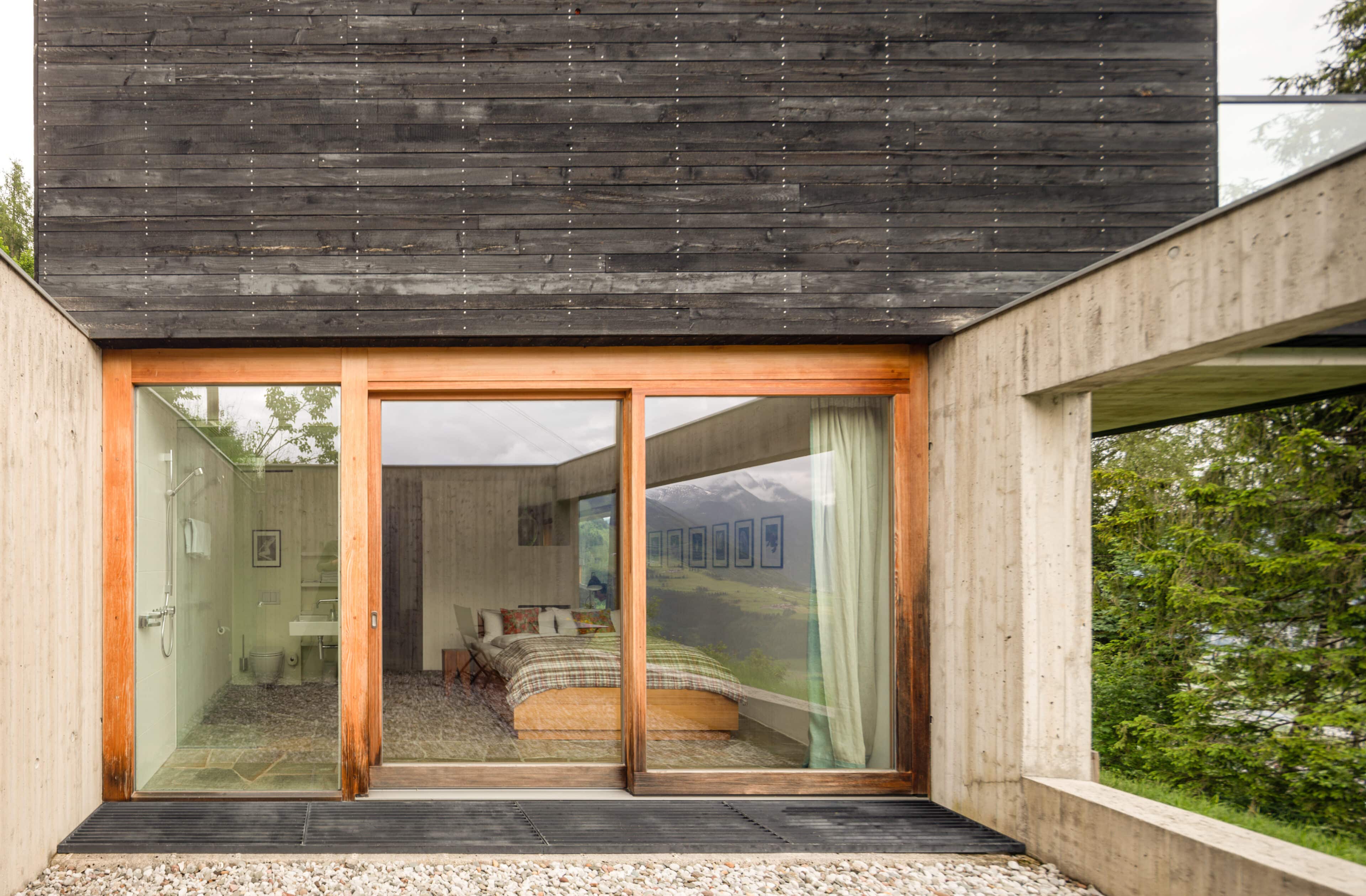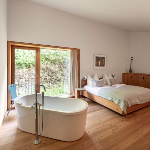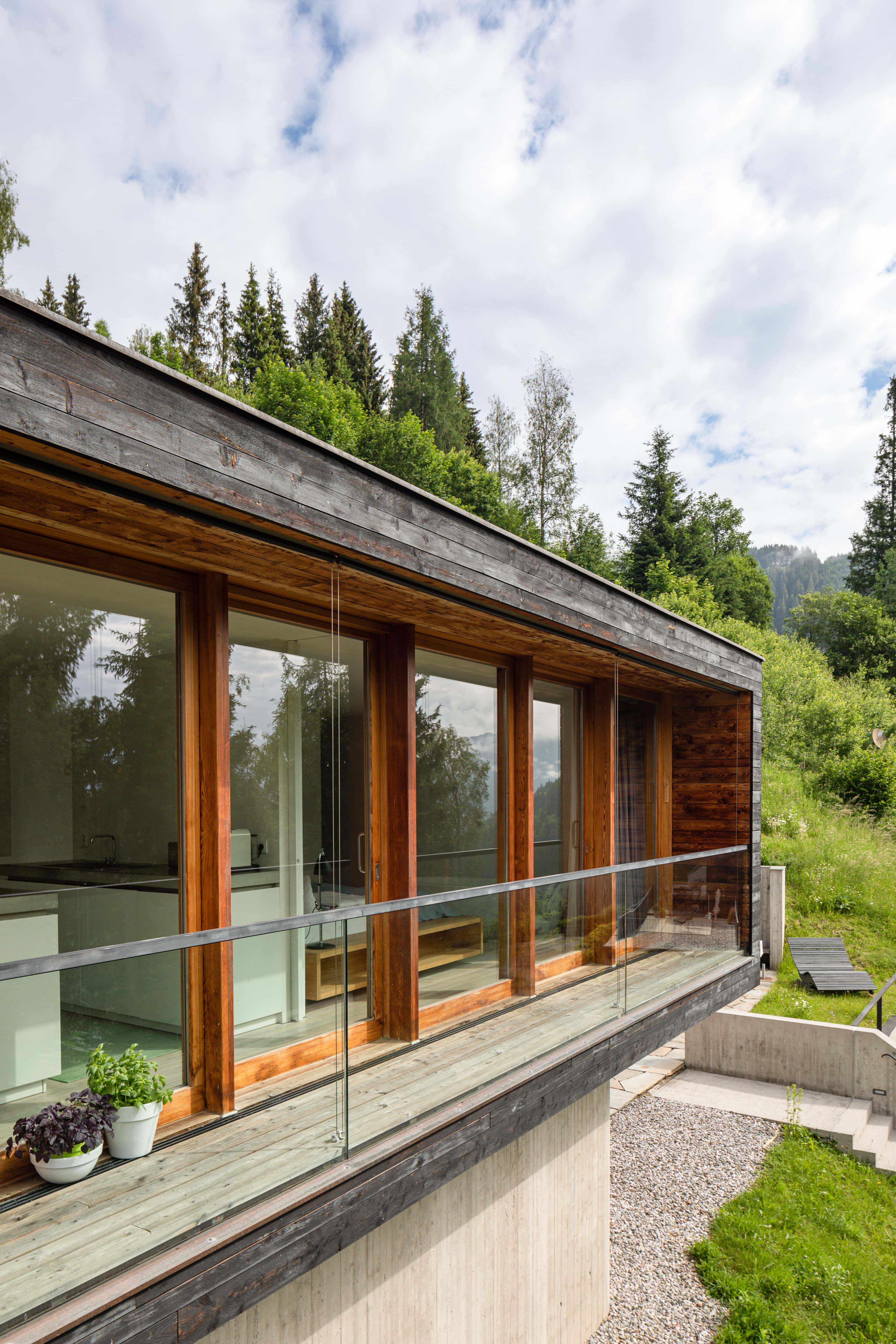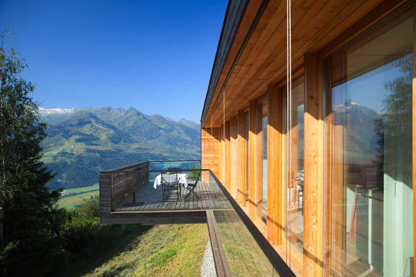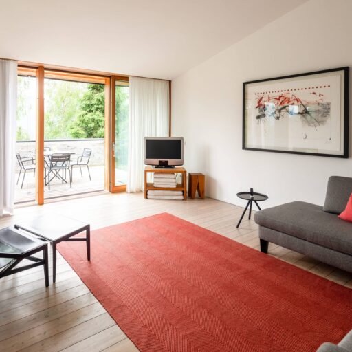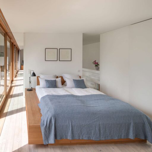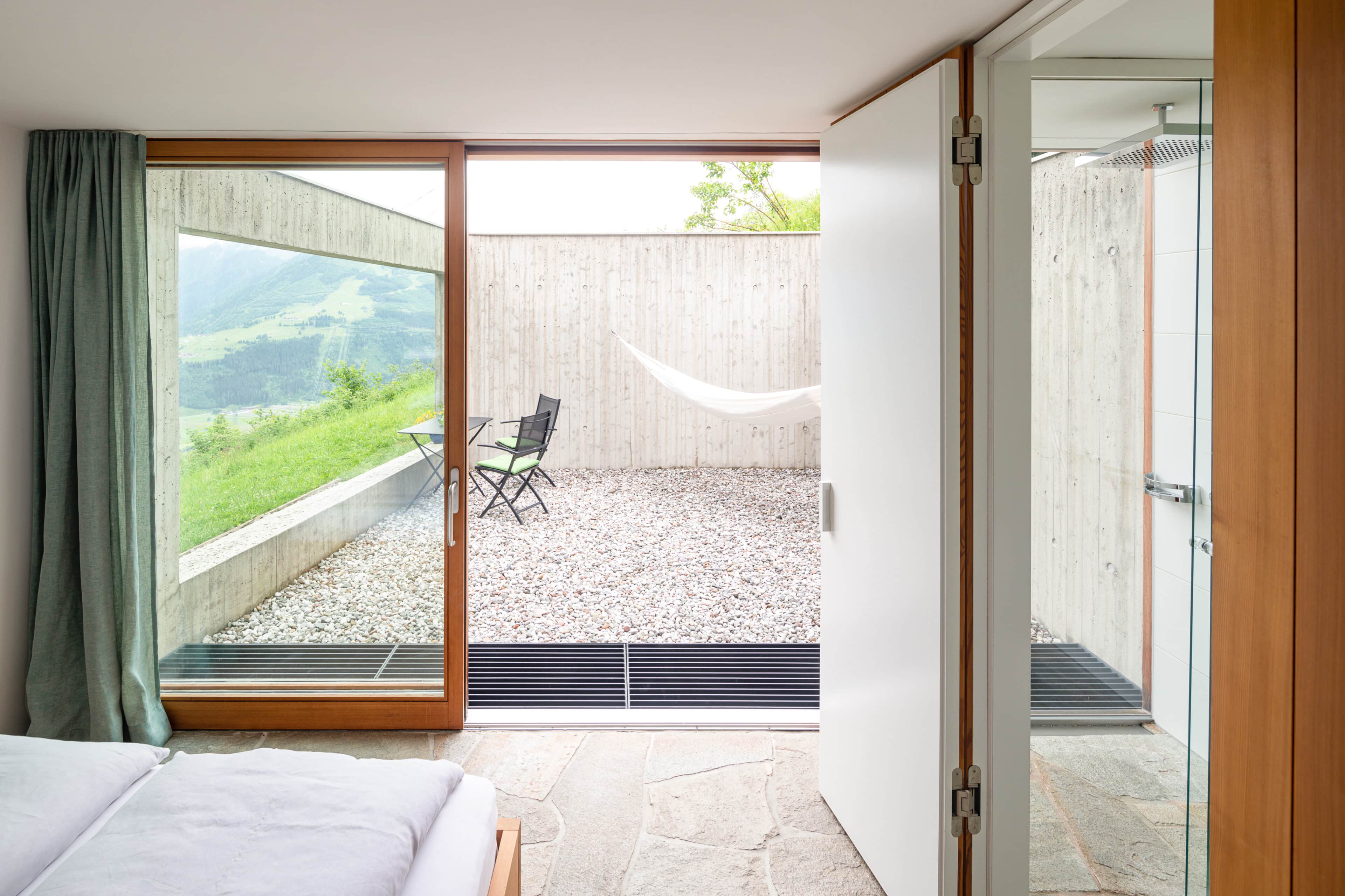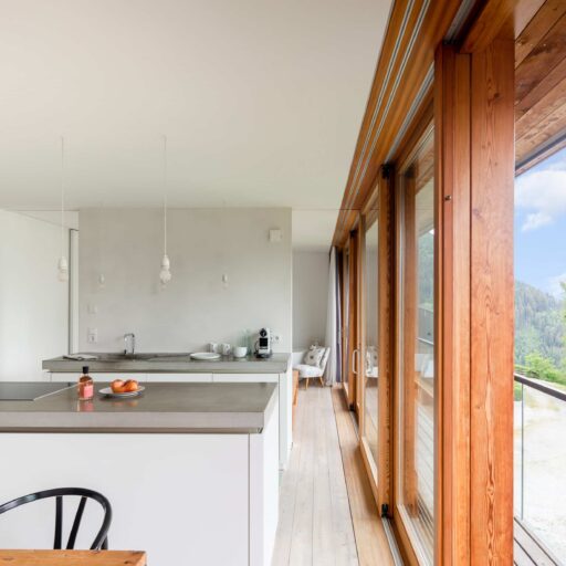 In Architekturhighlights wohnen: Die beiden Ferienhäuser Aufberg 1110 und 1113 wurden als kühnes und geradliniges Statement mitten in einen Hang der Hohen Tauern hineingeplant und bereits für mehrere Architekturpreise nominiert und ausgezeichnet. Zwei Inseln der Ruhe mitten in den Bergen, auf 1110 Meter Höhe und 1113 Meter Höhe über dem Meeresspiegel. Die perfekt geplanten Sichtachsen in den vier außergewöhnlichen Wohnungen beglücken Freunde von ausgewogener Symmetrie, die natürlichen Materialien aus naturbelassenem Holz, Stahlbeton und hellgrauen Stein erfreuen das design- und architekturaffine Herz. Durch die riesengroßen Fenster fühlt man sich inmitten der Natur und ist doch gleichzeitig gut beschützt. Im Aufberg 1113 sieht man vom Apartment Schwalbennest durch die Fensterrahmen auf die Gletscher wie auf ein Bild an der Wand. Absolutes Highlight ist die in luftiger Höhe schwebende Terrasse. Diese ist mittlerweile tatsächlich legendär, denn sie ziert zahlreiche Cover von Reise- und Architekturmagazinen. Die zweite Wohnung, das Spatzennest, bezaubert mit einem fantastischen Rundumblick von Ost nach West. Die beiden Wohnungen im kleineren Haus Aufberg 1110, Freisitz und Ansitz, haben ganze Wände und Einbauten aus Holz, mit unterschiedlichen Raumhöhen und Galerien und begeistern ebenfalls mit großen Panoramafenstern. Sie verbreiten die Wärme und Behaglichkeit einer klassischen Berghütte, samt Kamin und knisterndem Holzfeuer. Auf dem Berg im Aufberg zu wohnen, ist eine ganz besondere Erfahrung.
