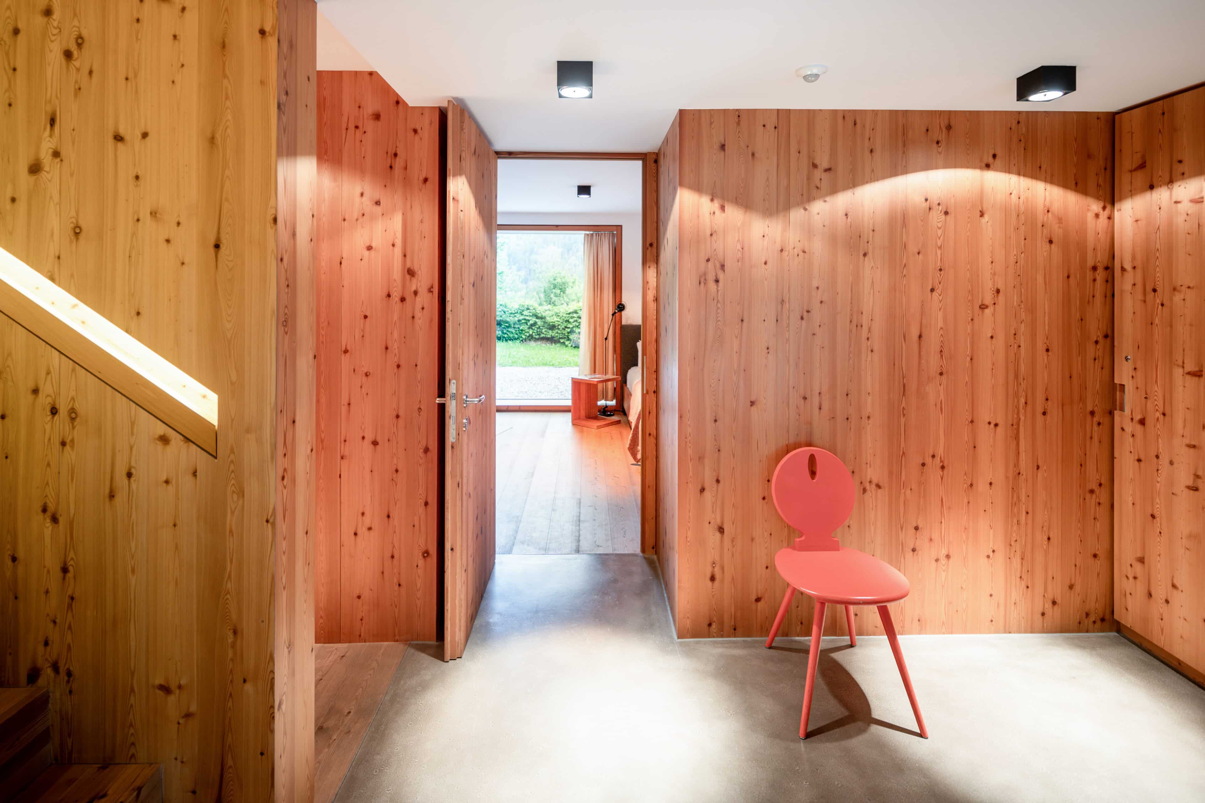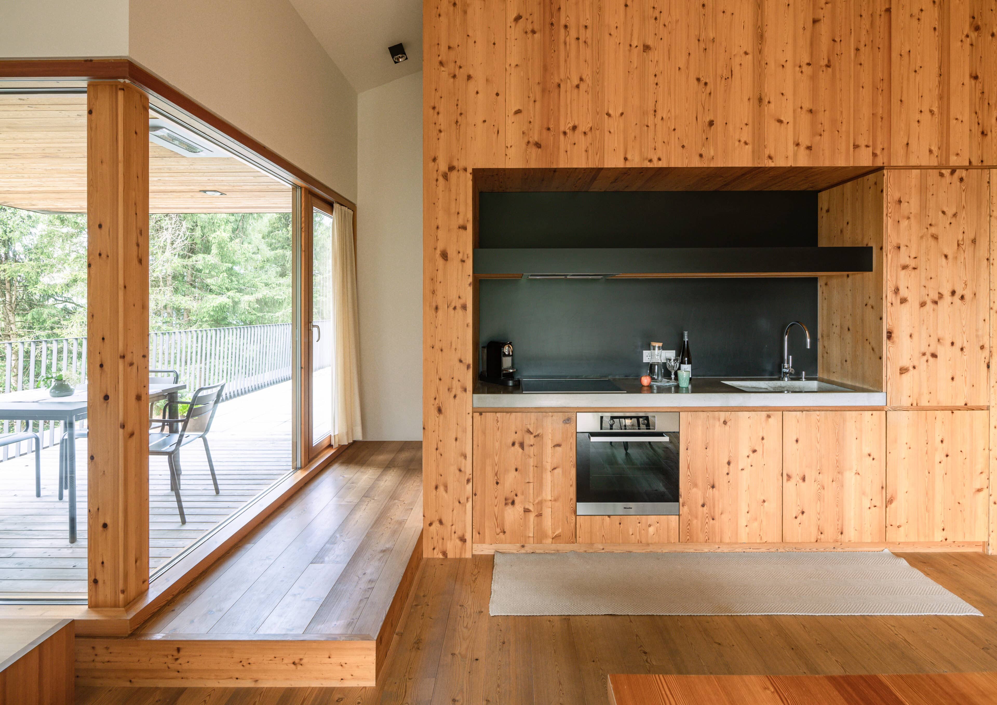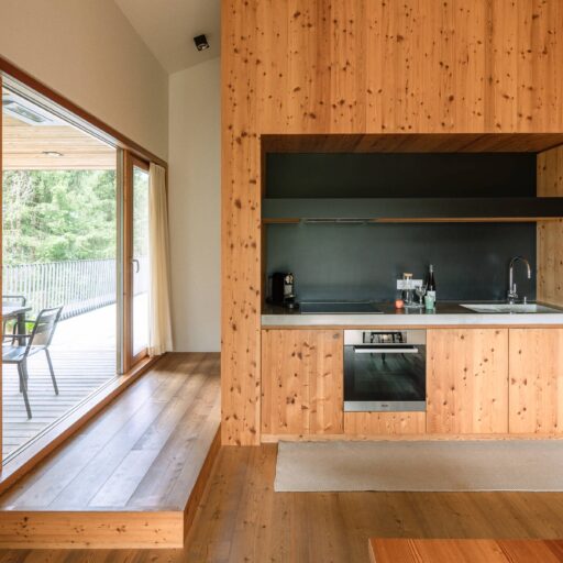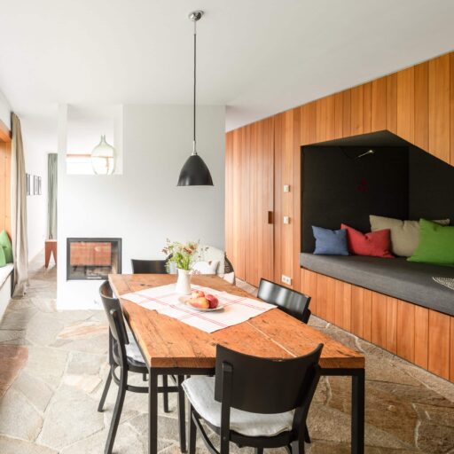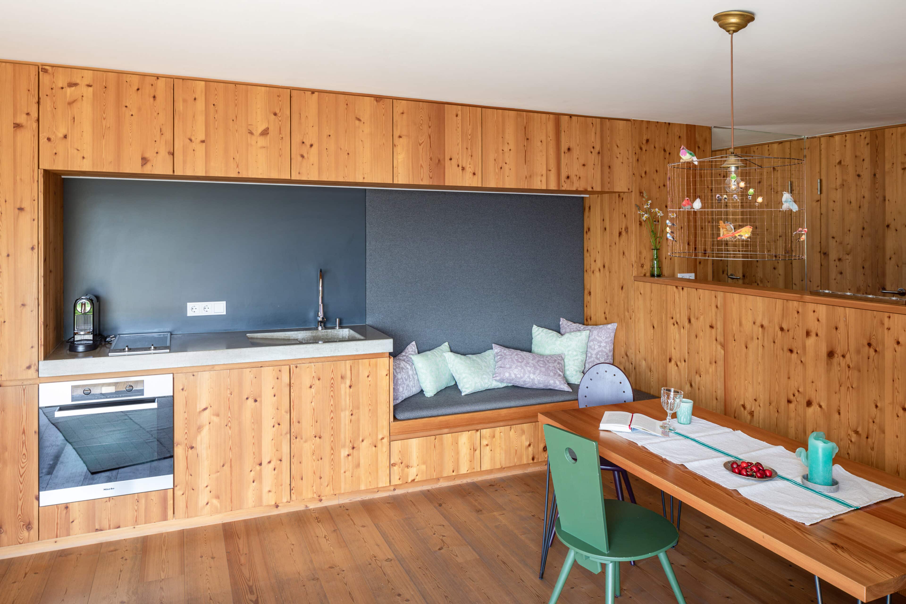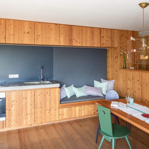 • die Holzeinbauten verbinden verschiedene Elemente in der Wohnung im Ansitz, z.B. die Sitzbank und die Einbauküche