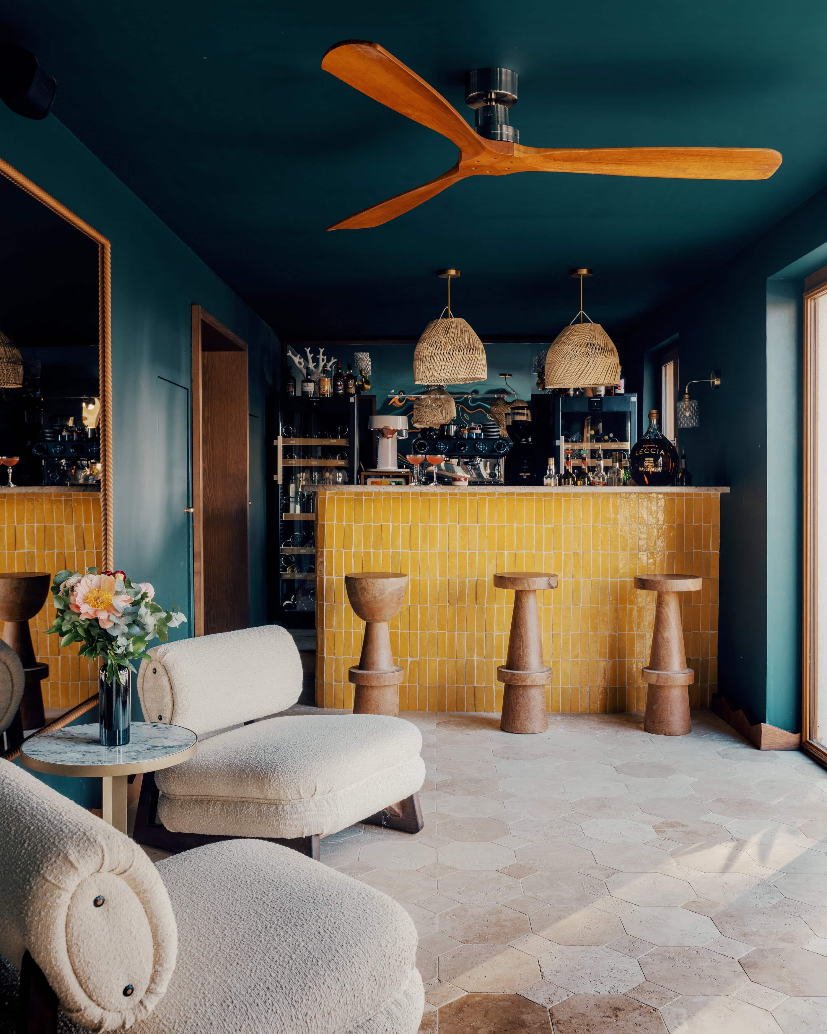 • das lässige Design der Bar: Wände und Decke sind in Petrol gestrichenen und bilden einen lebendigen Kontrast zu dem mit gelben Metrofliesen verkleideten Tresen. Man sitzt auf massiven Barhockern aus Holz unter dem dekorativen Retro-Ventilator und stößt mit Amaretto Coffee und Salvia Martini auf den Urlaub an