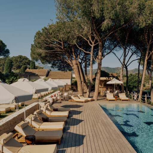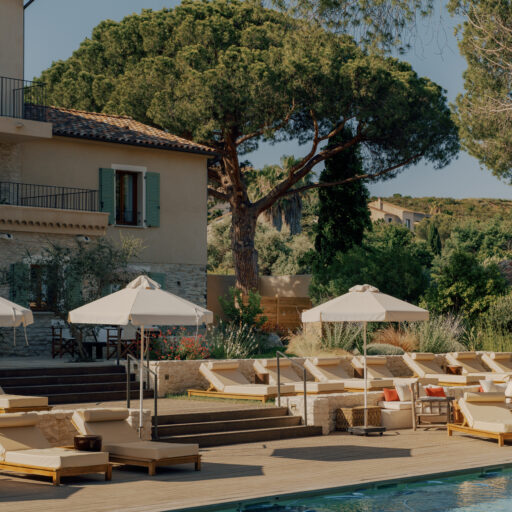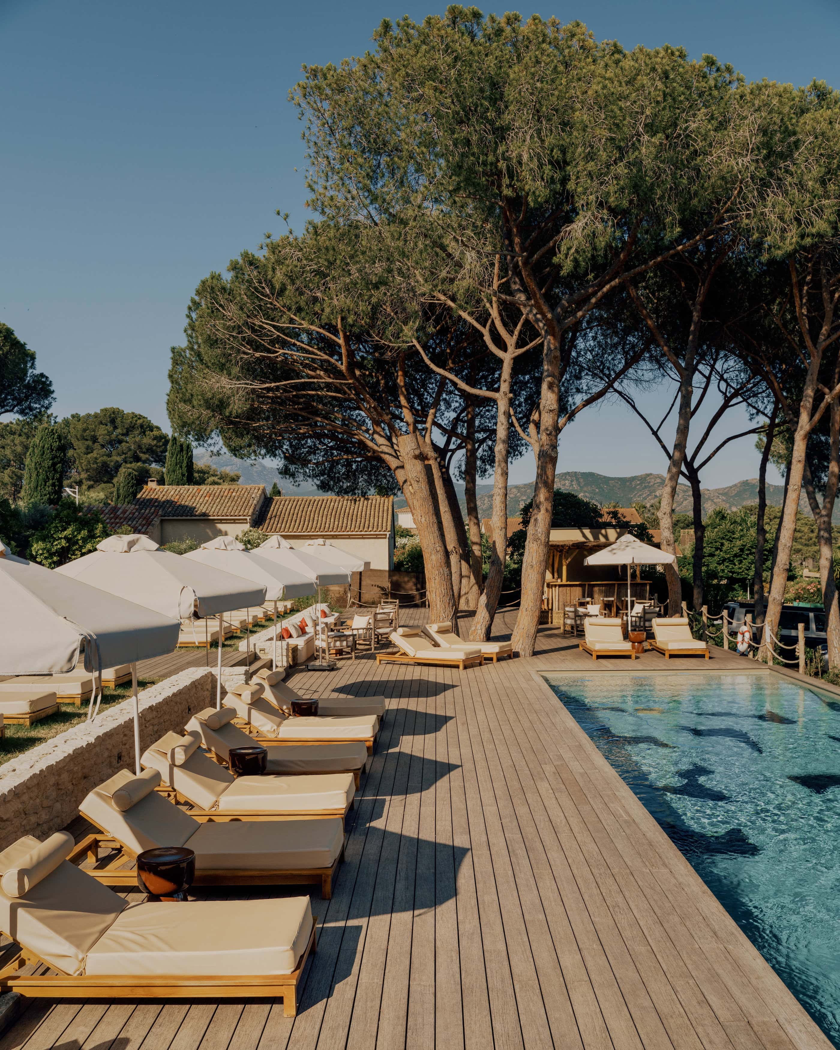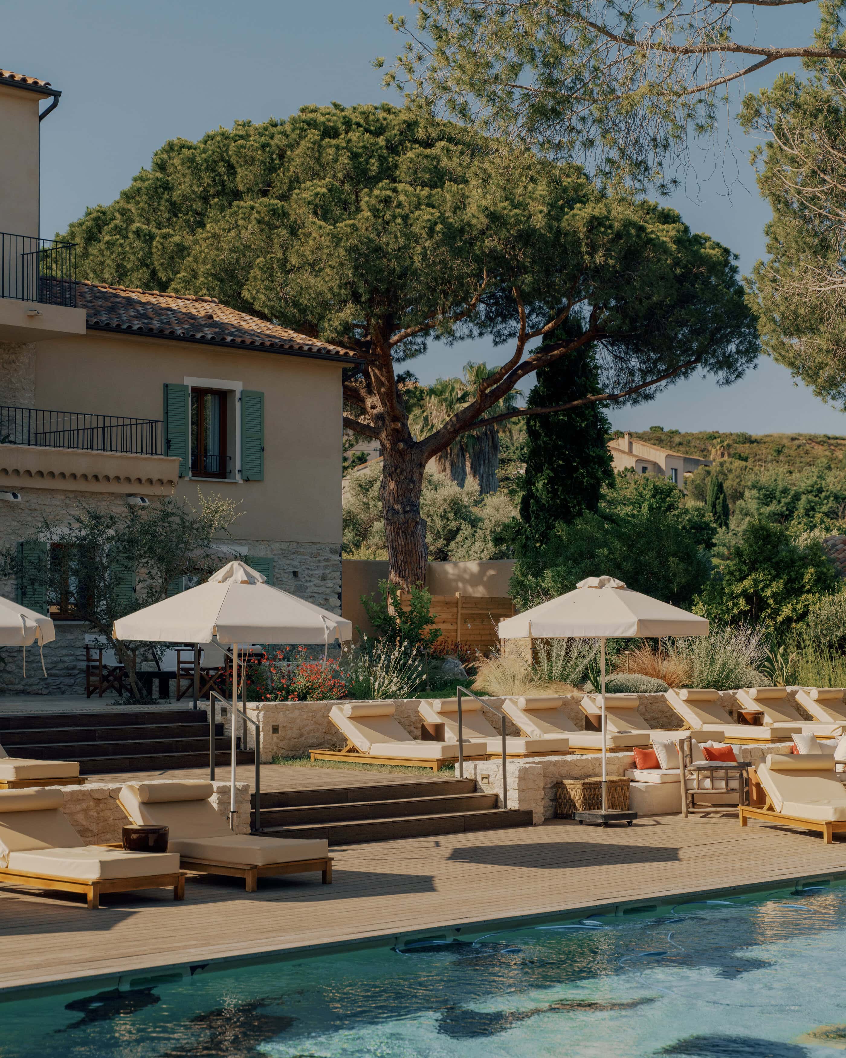 • auf einer der gepolsterten Liegen am Pool den Tag zu vertrödeln. Die Holzterrasse, das warme Licht und die mediterranen Pinien machen diesen Platz zu einem entspannenden Rückzugsort
