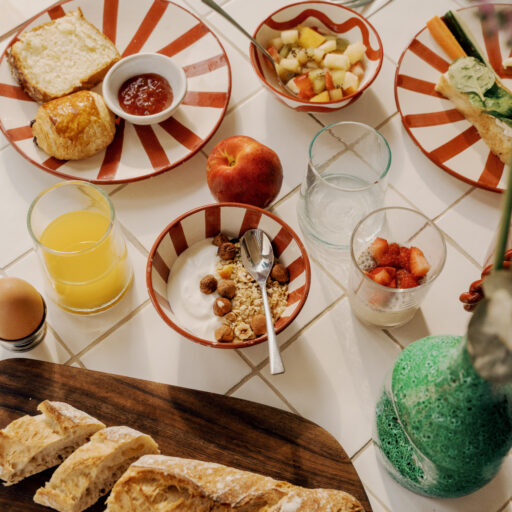 • jeder Morgen beginnt hier mit einem Frühstücksbuffet, zu dem auch externe Gäste eingeladen sind. Mit Schafsjoghurt, Käse, Bio-Eiern, hausgemachten Kuchen und Torten, Bio-Marmeladen und frischem Brot. Auf Anfrage gibt es auch vegetarische, vegane oder glutenfreie Optionen