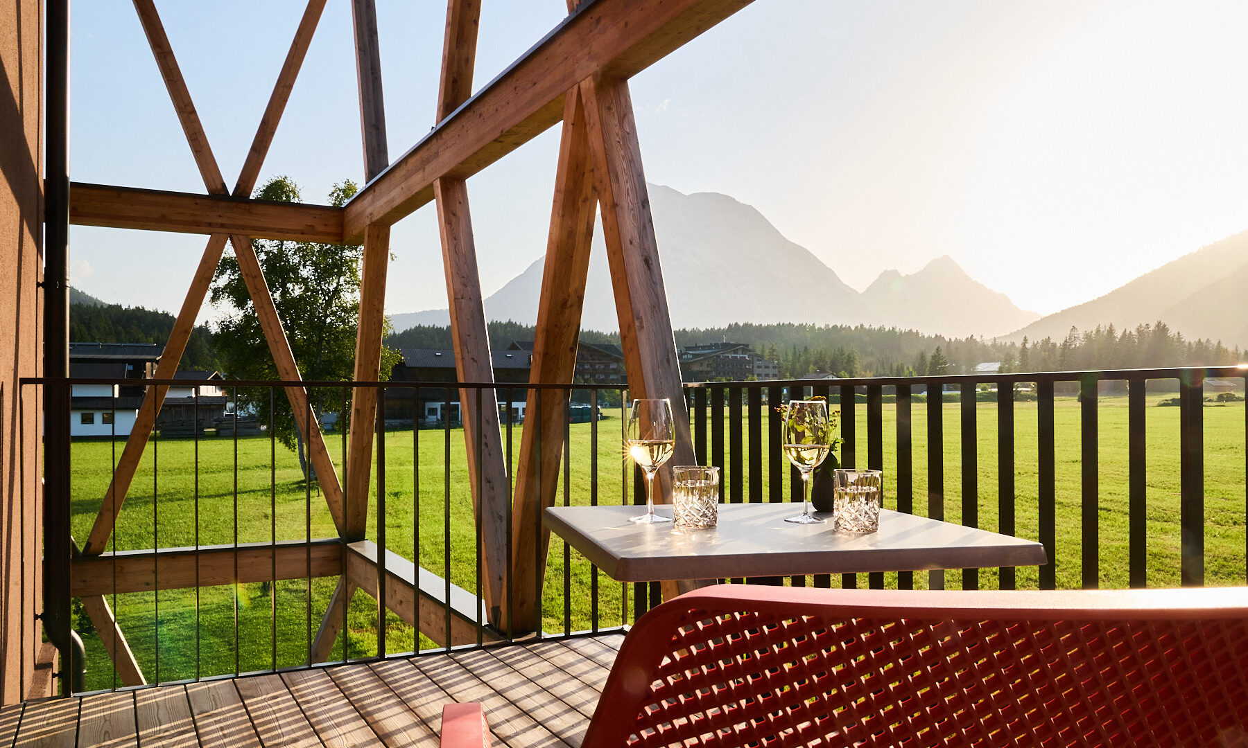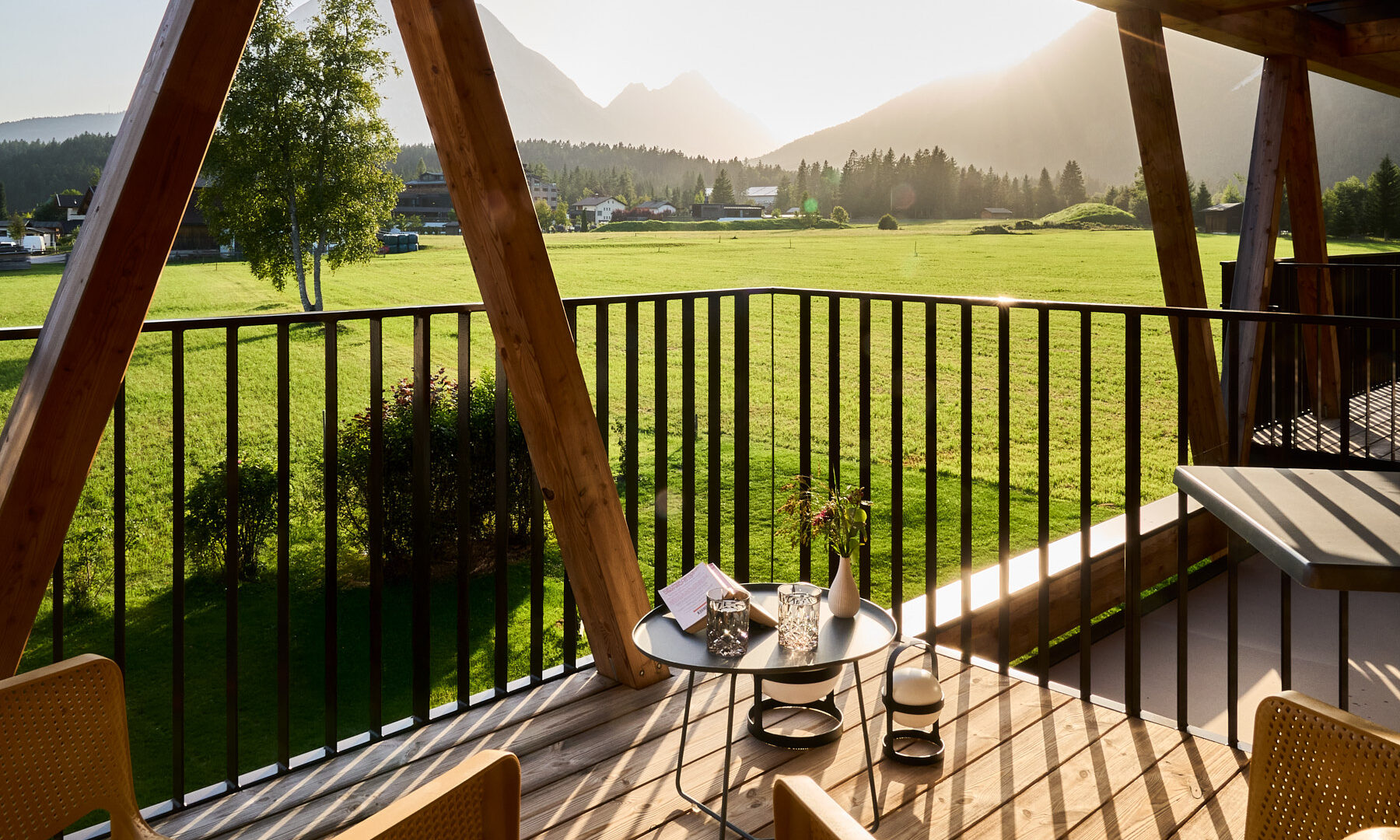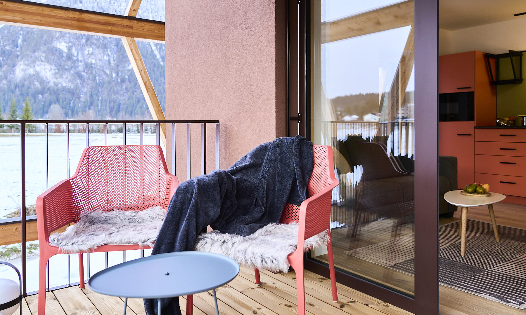 - die weitläufigen Balkone und Terrassen mit Möbeln in leuchtenden Farben, auf denen man auf die schneebedeckten Gipfel schauen und seinen Gedanken nachhängen kann