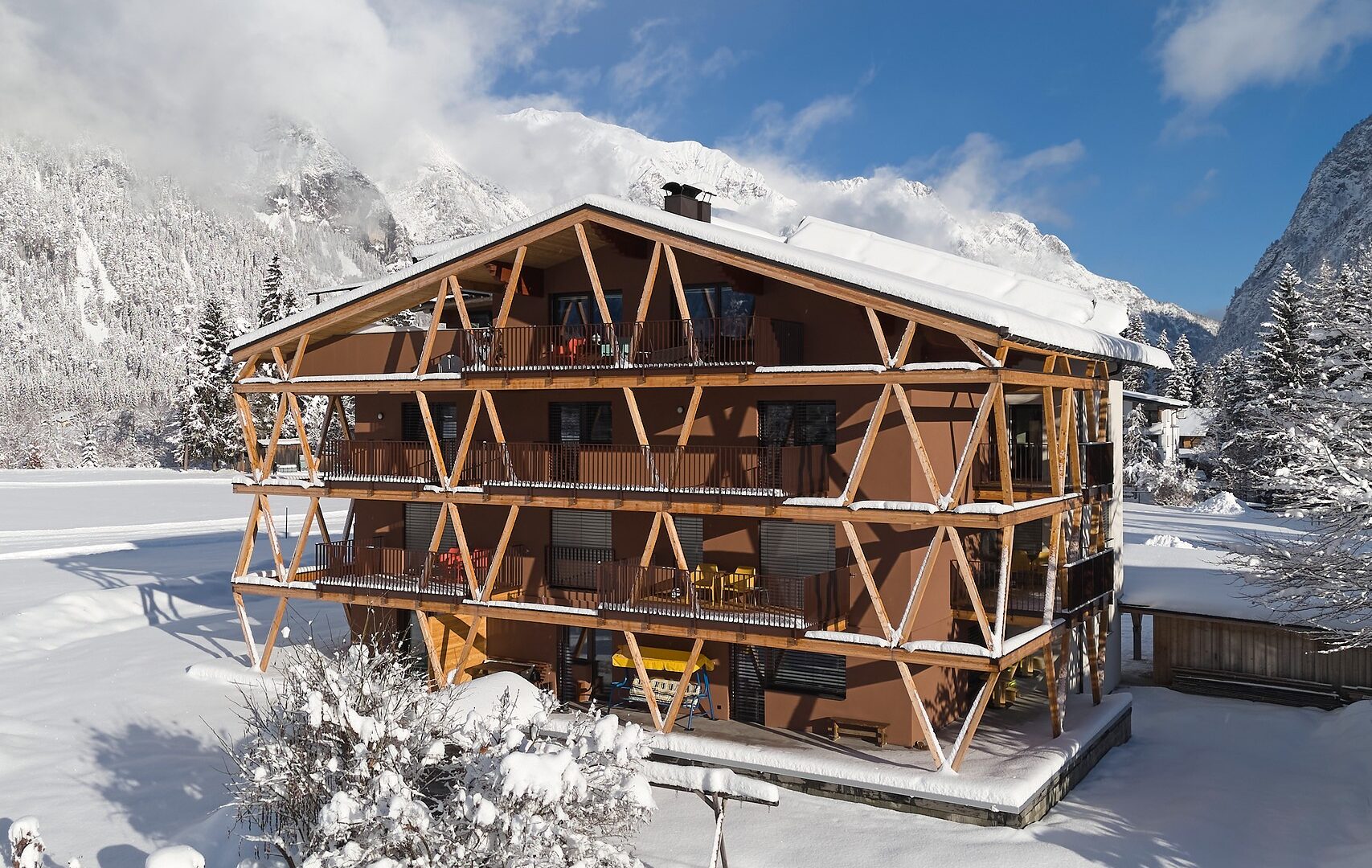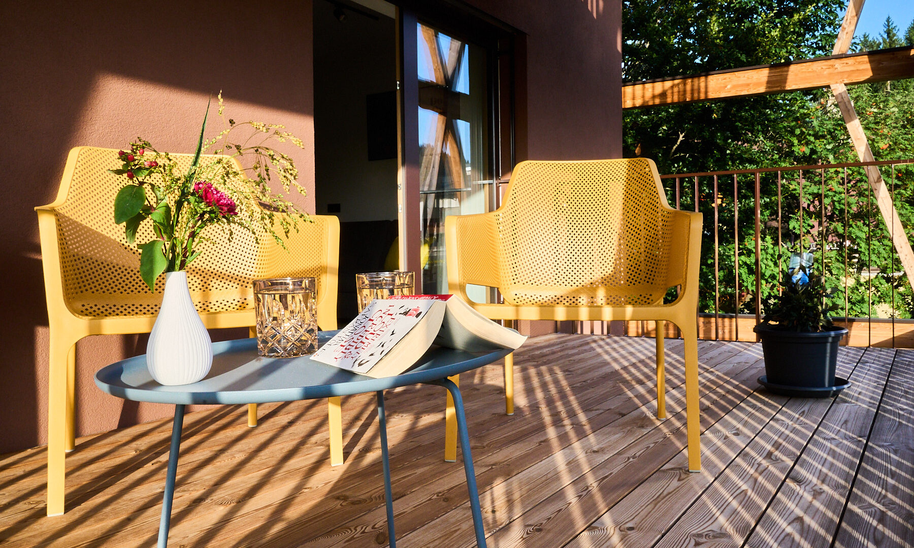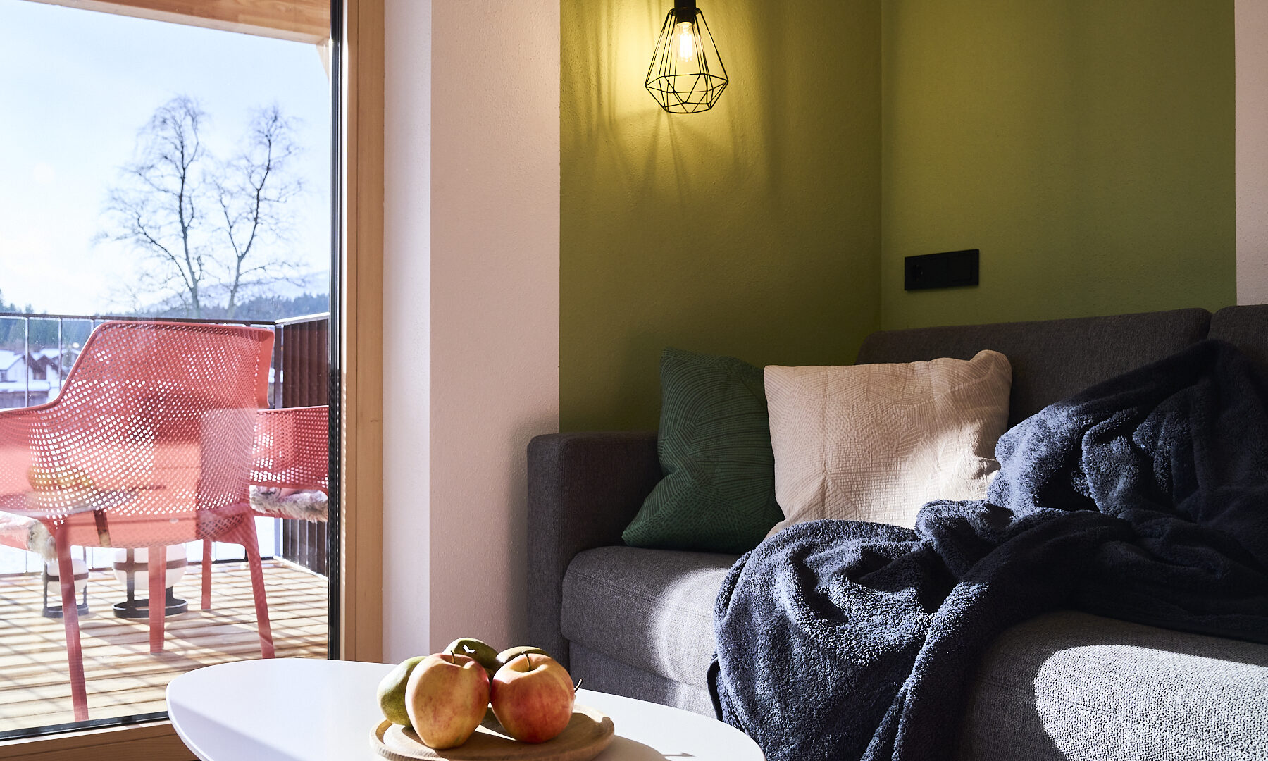 - die weitläufigen Balkone und Terrassen mit Möbeln in leuchtenden Farben, auf denen man auf die schneebedeckten Gipfel schauen und seinen Gedanken nachhängen kann