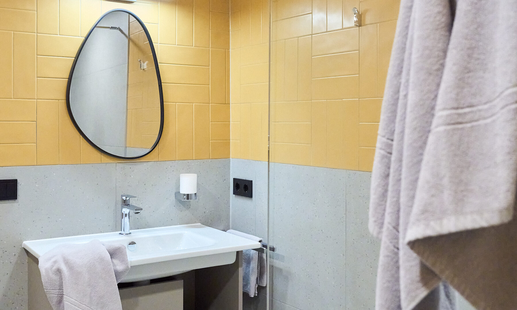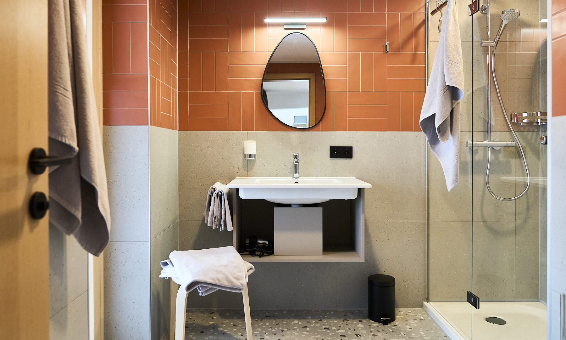 - die frisch renovierten Bäder mit Bodenfliesen in Terrazzo-Optik, farbigen Wandfliesen, asymmetrischen Spiegeln und begehbaren Regenduschen