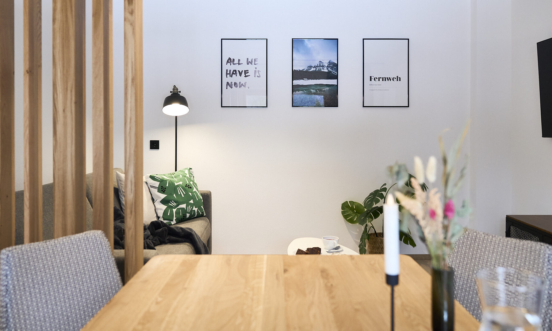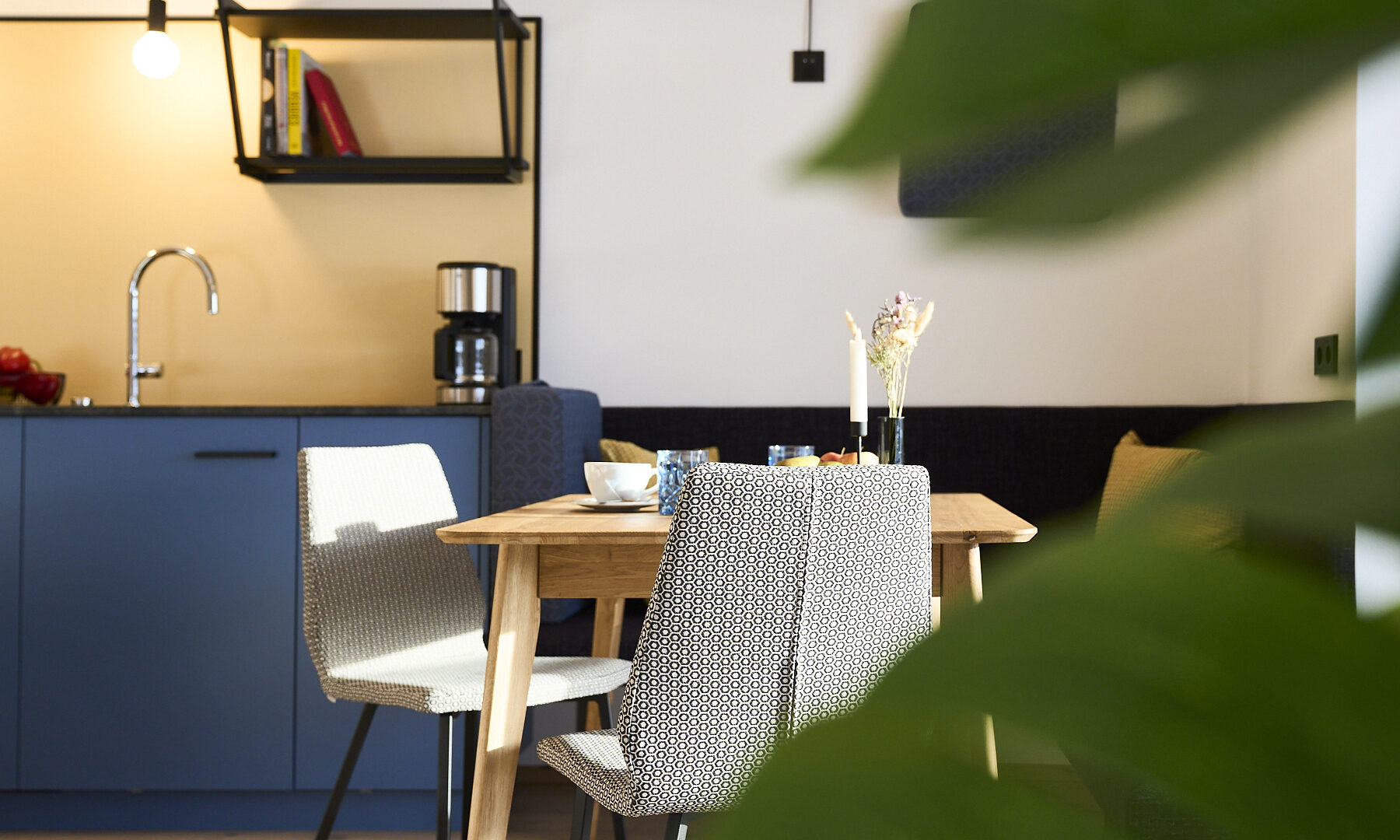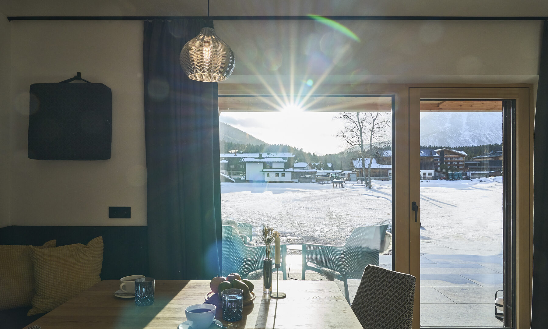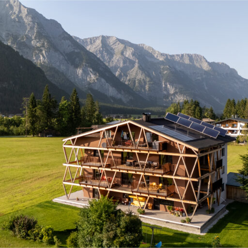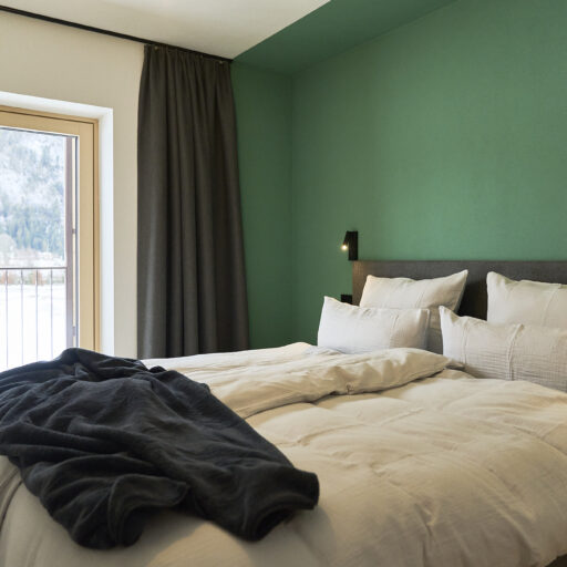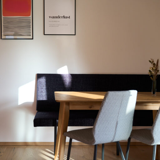 Das klassische Morgenritual geht in den Boutique-Apartments in Leutasch bei Seefeld so: Gleich nach dem Aufwachen tapst man barfuß zum Fenster, öffnet die Jalousien, um sich noch einmal unter der Decke einzukuscheln und mit dem Blick auf Wiesen, Felder und Gipfel gemütlich wach zu werden – oder man genießt die Postkarten-Aussicht beim ersten Kaffee auf der Couch, der Terrasse oder dem Balkon. Wenn Brötchenduft durchs Haus weht, stehen die Chancen gut, dass bereits eine Tüte mit ofenfrischen Backwaren an der Tür der Ferienwohnung baumelt. Beim Frühstück lässt sich dann ein aktiver Tag in der Tiroler Natur planen. Je nach Jahreszeit könnte dieser beinhalten, mit den Füßen in der Leutascher Ache zu plantschen, einen Ausflug in die Geisterklamm zu unternehmen, Blaubeeren zu pflücken und sie zu köstlichen „Datschn“(Pfannkuchen, bei denen die Beeren direkt mit in den Teig gerührt werden) zu verarbeiten oder eine Langlauf-Tour durch schneebedeckte Wälder zu machen. Als Katrin Moser beschloss, ihrem Elternhaus gemeinsam mit ihrem Mann ein neues Gesicht zu geben, war es den beiden wichtig, eine Verbindung von Innen und Außen zu schaffen: durch bodentiefe Fenster, großzügige Balkone, aber auch durch das Farbkonzept. So ließen sie für die sechs individuell gestalteten Apartments vom Tischler Küchen in den Farben der Natur anfertigen: Gelb wie die Sonne, Blau wie der Himmel, Grün wie die Wälder und Orange-Rot wie der Herbst. Diese Nuancen werden durch Kissen, Möbel oder Wandgestaltung im selben Ton aufgegriffen. Im Zusammenspiel mit viel Holz und reduziertem Design entsteht eine warme und einladende Atmosphäre. So ist das Zurückkommen zum Moser-Quartier jedes Mal ein besonders schöner Moment – vor allem nach einem Traumtag in den Tiroler Bergen.