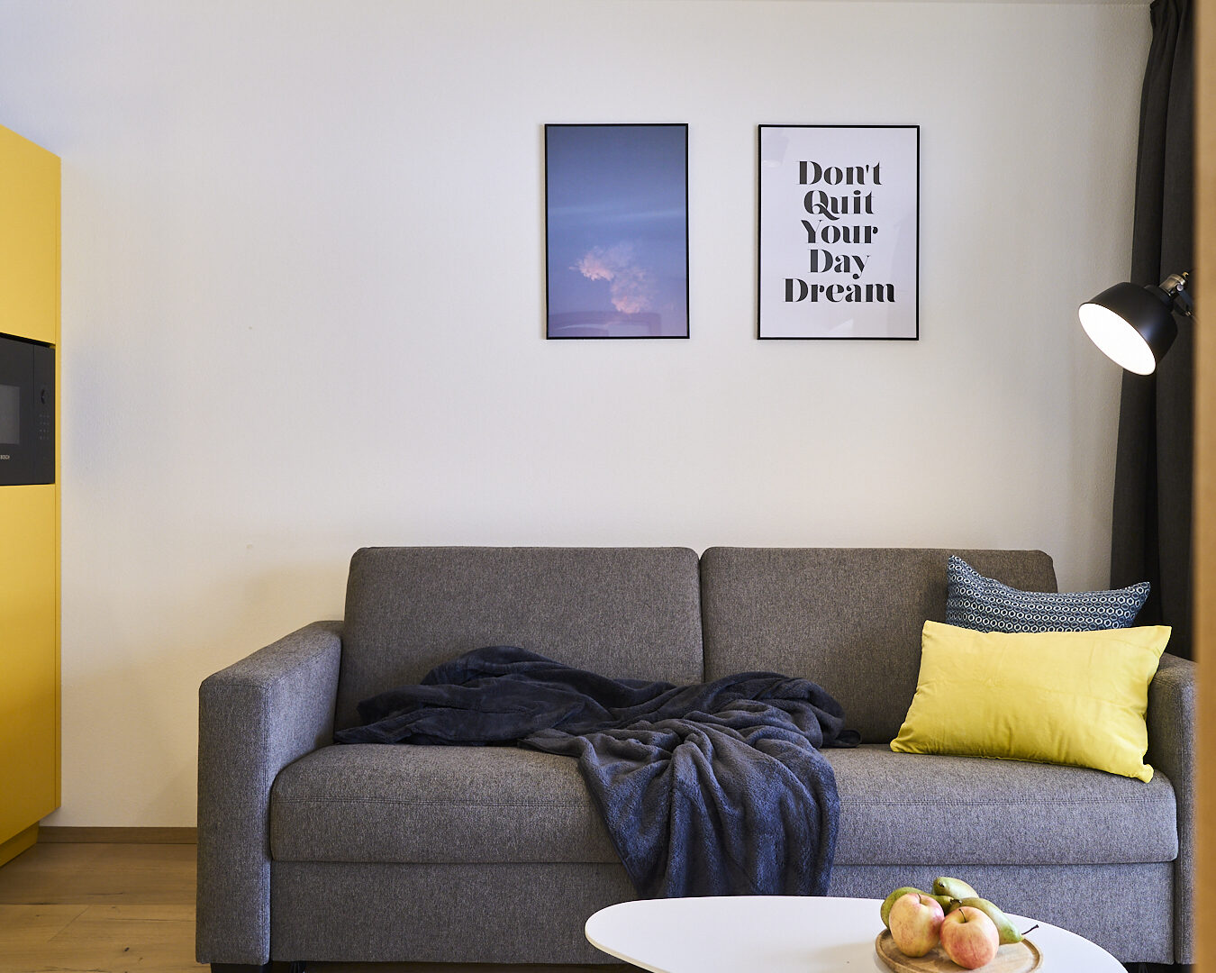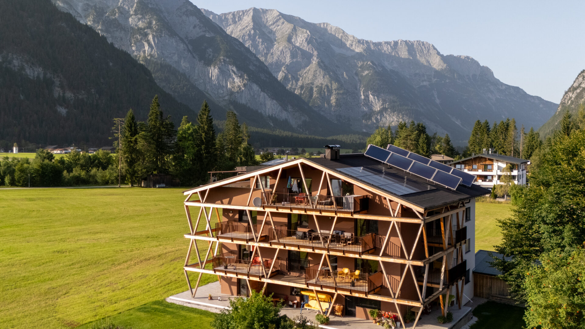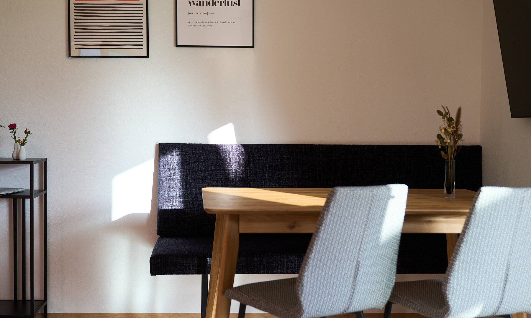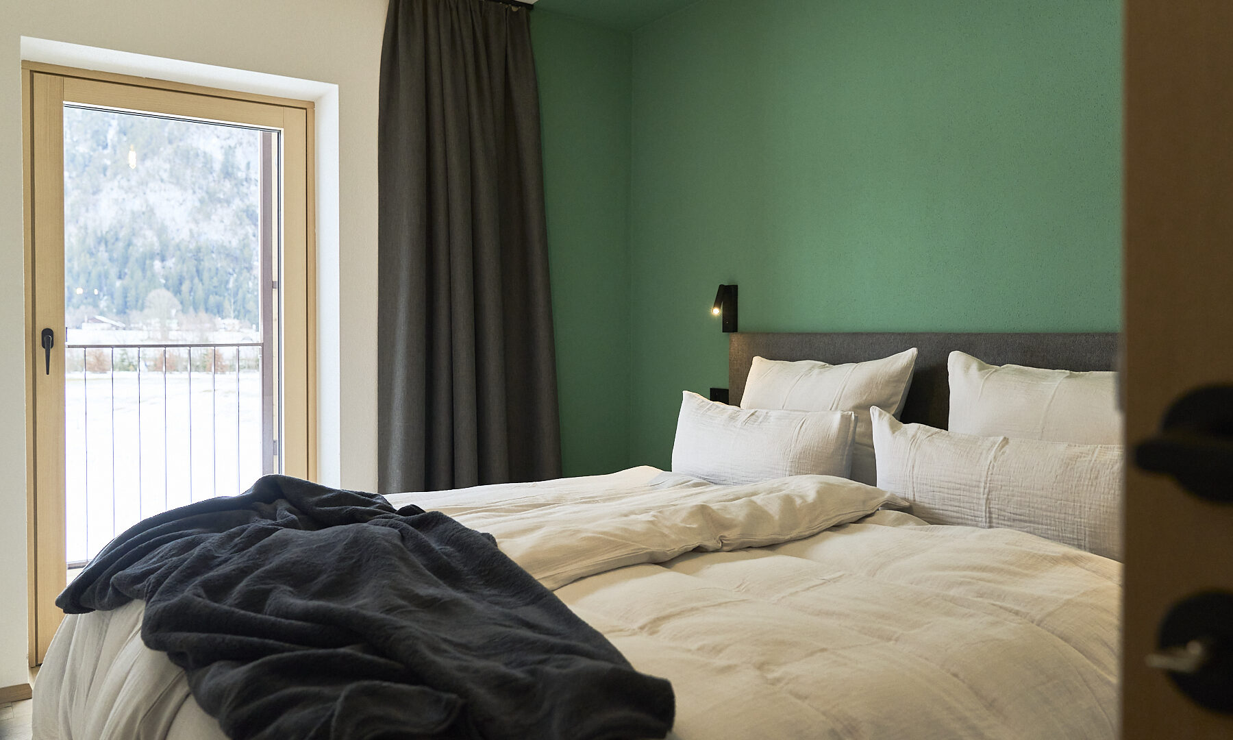 Das klassische Morgenritual geht in den Boutique-Apartments in Leutasch bei Seefeld so: Gleich nach dem Aufwachen tapst man barfuß zum Fenster, öffnet die Jalousien, um sich noch einmal unter der Decke einzukuscheln und mit dem Blick auf Wiesen, Felder und Gipfel gemütlich wach zu werden – oder man genießt die Postkarten-Aussicht beim ersten Kaffee auf der Couch, der Terrasse oder dem Balkon. Wenn Brötchenduft durchs Haus weht, stehen die Chancen gut, dass bereits eine Tüte mit ofenfrischen Backwaren an der Tür der Ferienwohnung baumelt. Beim Frühstück lässt sich dann ein aktiver Tag in der Tiroler Natur planen. Je nach Jahreszeit könnte dieser beinhalten, mit den Füßen in der Leutascher Ache zu plantschen, einen Ausflug in die Geisterklamm zu unternehmen, Blaubeeren zu pflücken und sie zu köstlichen „Datschn“(Pfannkuchen, bei denen die Beeren direkt mit in den Teig gerührt werden) zu verarbeiten oder eine Langlauf-Tour durch schneebedeckte Wälder zu machen. Als Katrin Moser beschloss, ihrem Elternhaus gemeinsam mit ihrem Mann ein neues Gesicht zu geben, war es den beiden wichtig, eine Verbindung von Innen und Außen zu schaffen: durch bodentiefe Fenster, großzügige Balkone, aber auch durch das Farbkonzept. So ließen sie für die sechs individuell gestalteten Apartments vom Tischler Küchen in den Farben der Natur anfertigen: Gelb wie die Sonne, Blau wie der Himmel, Grün wie die Wälder und Orange-Rot wie der Herbst. Diese Nuancen werden durch Kissen, Möbel oder Wandgestaltung im selben Ton aufgegriffen. Im Zusammenspiel mit viel Holz und reduziertem Design entsteht eine warme und einladende Atmosphäre. So ist das Zurückkommen zum Moser-Quartier jedes Mal ein besonders schöner Moment – vor allem nach einem Traumtag in den Tiroler Bergen.
