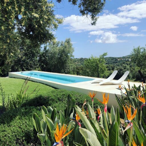 - den charaktervollen Pool – eingelassen in einen 15 m langen Betonblock bietet er eine ganz eigene Bühne