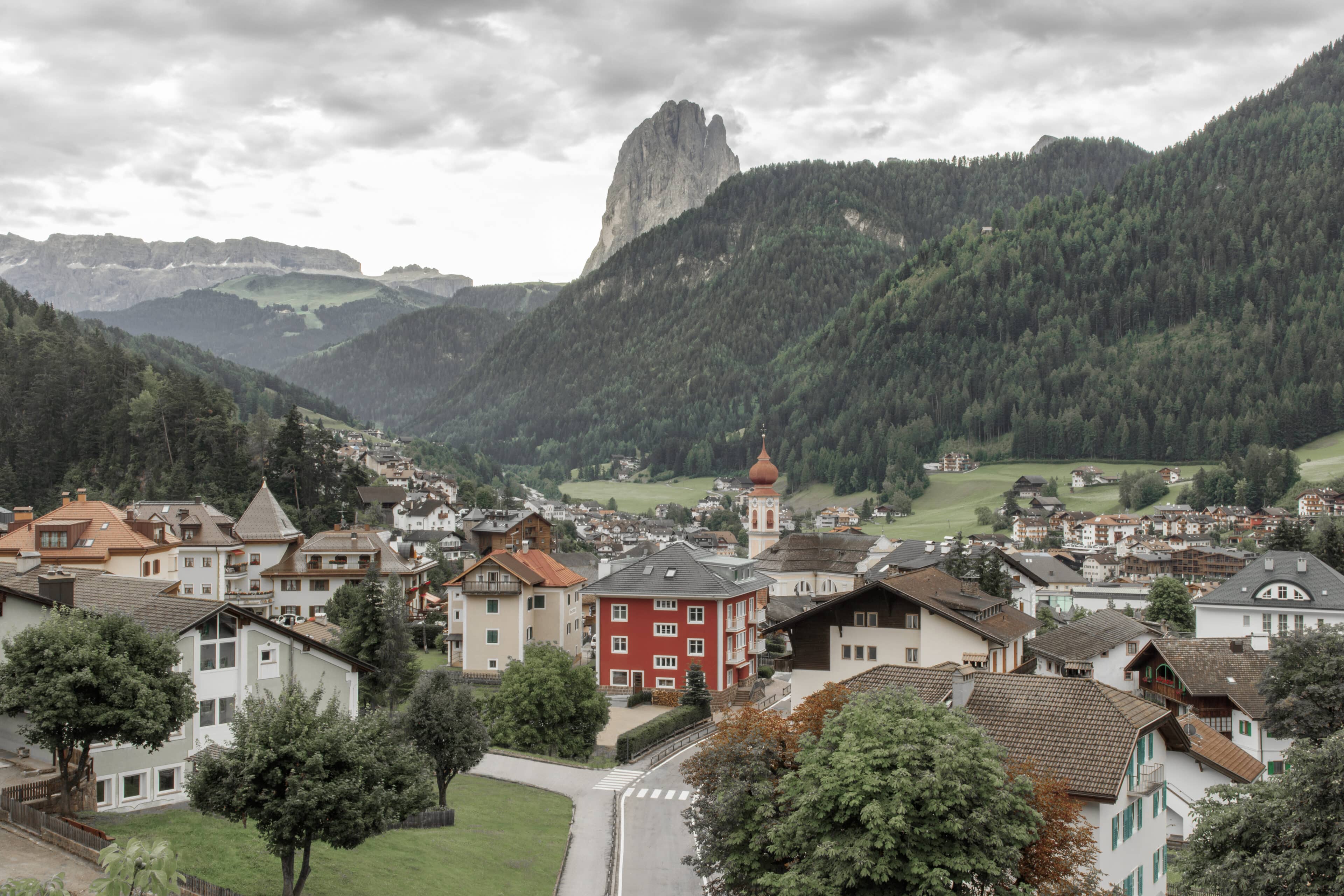 Mächtige Dolomitengipfel ragen in den Himmel, dichte Tannenwälder und grüne Hügel säumen das Tal, in dem das Südtiroler Dorf St. Ulrich mit seinen Zwiebelturm-Kirchen und Giebelhäusern liegt. Genau hier steht die Casa al Sole mit rostroter Fassade und weiß-gerahmten Kastenfenstern, in den 1930er Jahren im Stil rationalistischer Architektur erbaut und im Jahr 2020 von den Eigentümern Manuel und Alexandra mit viel Herzblut und Sinn für Ästhetik renoviert und neugestaltet. Dabei haben die beiden möglichst viel Originales erhalten, um den Charakter des Hauses zu bewahren. Natürliche Materialien wie Lärchenholz, Naturstein, Lehm und Loden geben dem Inneren einen skandinavischen Look. Die zwölf Zimmer des Bed & Breakfast verteilen sich auf zwei Etagen, sind mit modernen Möbeln aus Chrom- und Rohstahl eingerichtet, die mit Lieblingsstücken aus vergangenen Tagen kombiniert werden. Umgeben vom „schönsten Open-Air-Fitnessstudio der Welt“, dem Grödnertal, verbringt man den Tag bei strahlend blauem Himmel (die Chancen dafür stehen hier tatsächlich sehr gut!) und frischer Bergluft beim Sporteln, Spazieren zwischen Wildblumen, Schwimmen im See oder Pilzesammeln. Zurück im Zuhause auf Zeit, zieht es die Gäste an die Hausbar mit ihren gepolsterten Cocktailsesseln, wo man bei entspanntem Sound, Naturwein und Craftbeer ins Gespräch kommt. An warmen Abenden ist jedoch die Terrasse der Place to be, um der Sonne beim Untergehen zuzusehen. Wenn dieses besondere Licht die „Bleichen Berge“ in glühendes Rot taucht, ist das der unangefochtene Lieblingsmoment des Tages