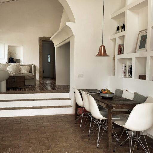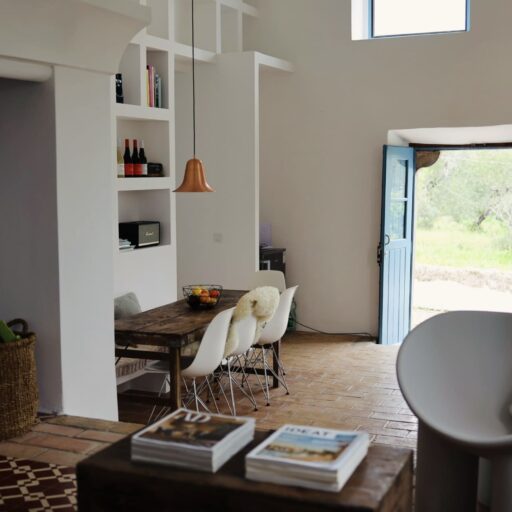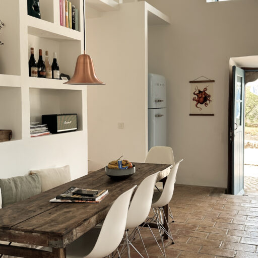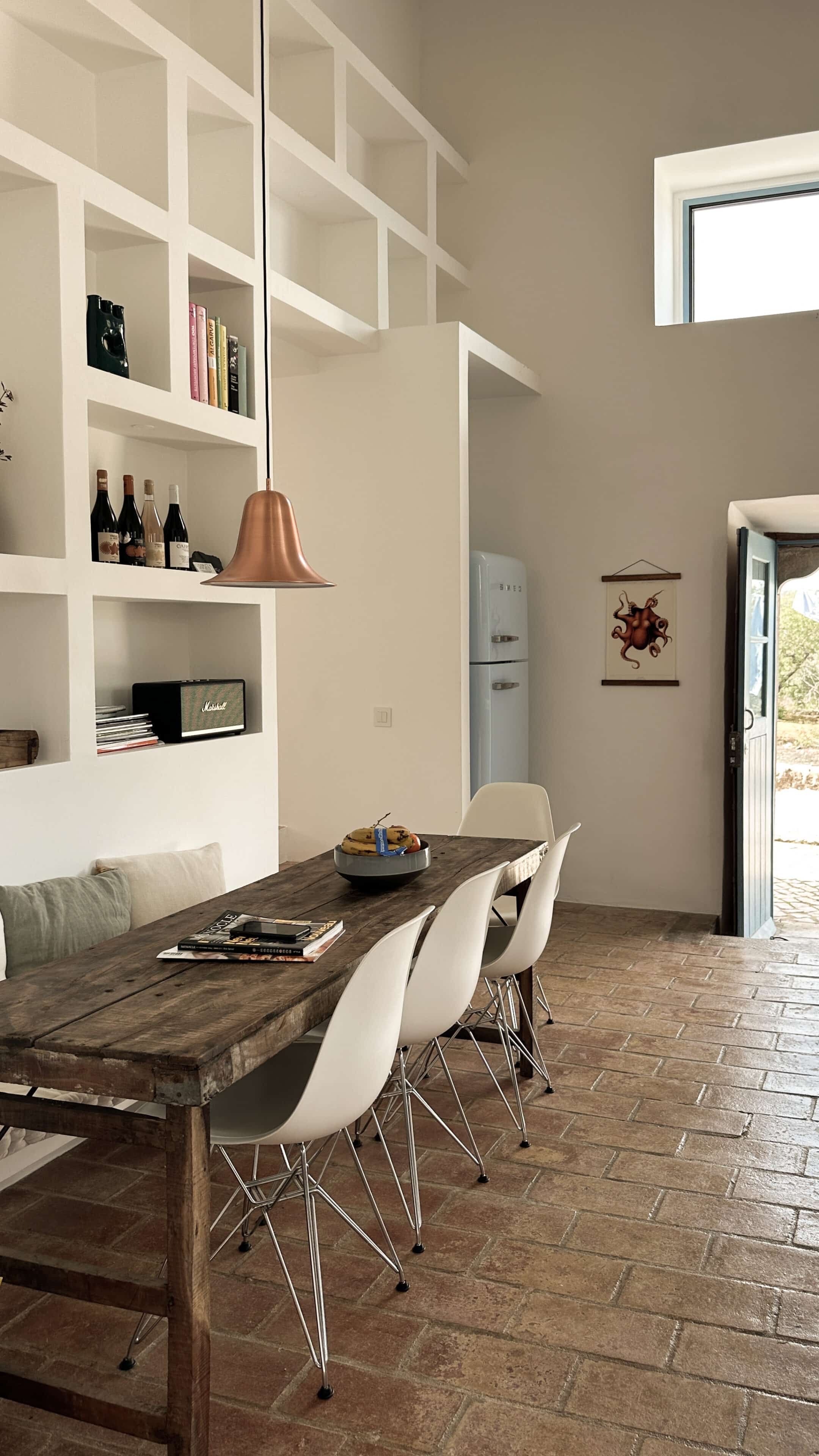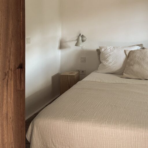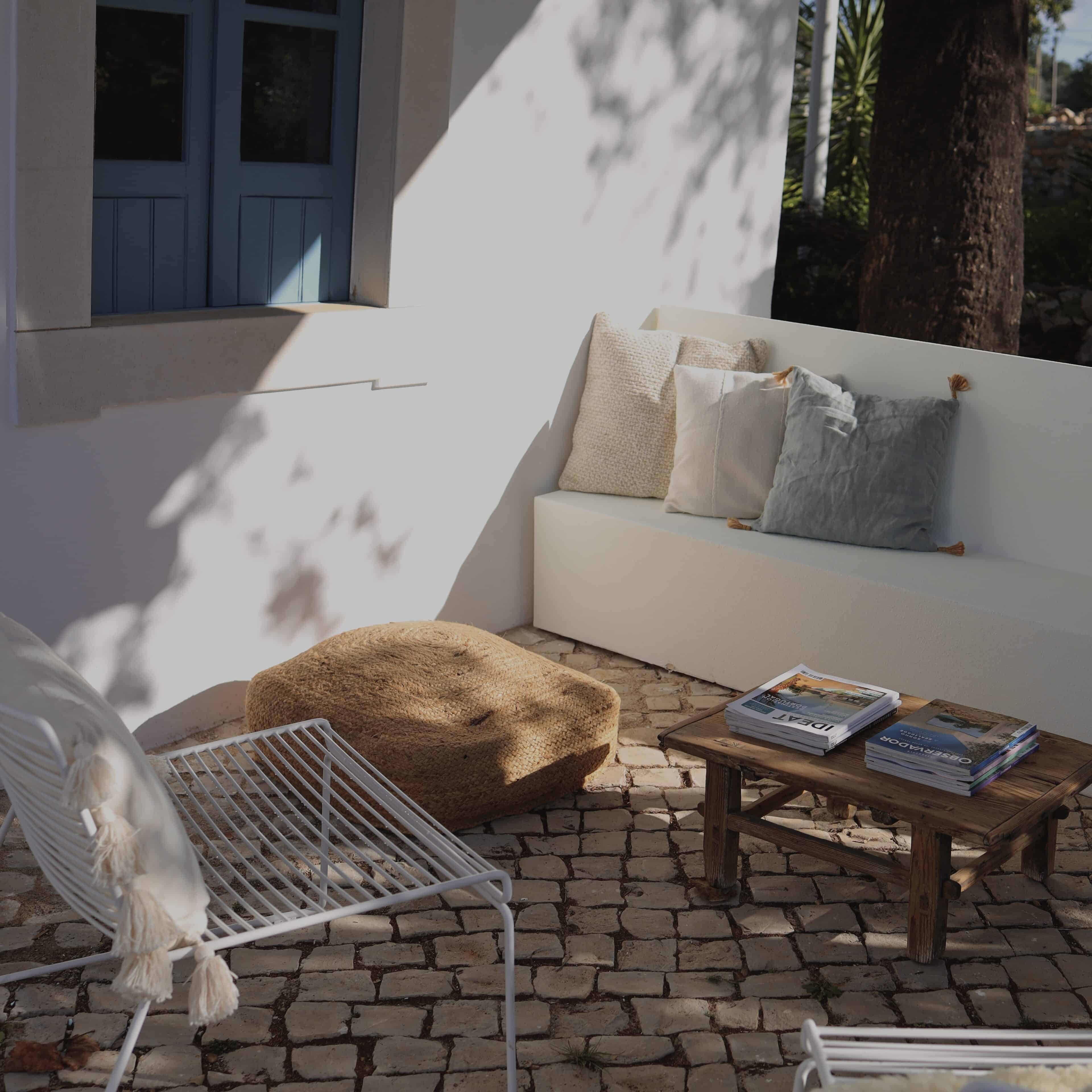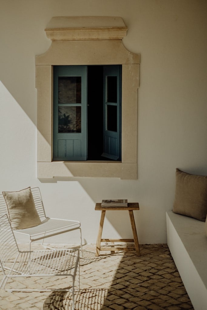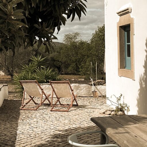 Am allerschönsten ist es hier, wenn die Abendsonne alles in ein warm-goldenes Licht taucht. Das ist der Moment, wenn man sich auf der Terrasse des weißgestrichenen Farmhauses mit seinen blauen Fensterläden einfindet, mit einem Gläschen Wein in der Hand, den Blick über den großen Garten schweifen lässt und nirgendwo sonst auf der Welt sein möchte – außer genau hier. Dieses Gefühl stellte sich bei den Gastgebern, einer kleinen Familie aus Düsseldorf, sofort ein, als sie auf das Haus in der Nähe von Loulé stießen. Till hatte als Kind oft die Sommerferien in Portugal bei seiner Tante verbracht, die dort lange lebte, und Frau Birthe und Sohn Pepe mit seiner Liebe zur Algarve angesteckt. Seit dem Kauf im Jahr 2022 haben sie das alte Haus mit frischem Design und einem veränderten Grundriss wieder zum Leben erweckt. Dabei haben sie besonderen Wert darauf gelegt, möglichst viel Ursprüngliches zu erhalten, um den Charakter des Hauses zu bewahren. So wurden der originale Ofen sowie die Santa Catarina-Bodenfliesen aufwändig restauriert. Neu eingezogen sind Design-Klassiker und Holzmöbel mit Patina. Viel Weiß und helle Naturtöne vermitteln Leichtigkeit, Wohntextilien, Bast- und Kupferleuchten sowie dezente Deko machen es gemütlich. Ebenso einladend ist es drumherum: Im gewachsenen, 3900 Quadratmeter große Garten mit Oliven-, Granatapfel-, Feigen- und den namensgebenden Mandelbäumen pendelt man entspannt zwischen Hängesessel und Liegestuhl. Im Hinterland gelegen, bietet die Casa Amendoeira mit den drei gemütlichen Schlafzimmern viel Ruhe und Entspannung. Die unschlagbar schönen Naturstrände der Region erreicht man in einer knappen halben Stunde – und so trifft hier alles mehr als glücklich zusammen, was einen Urlaub besonders macht: authentisches Dorfleben, Beach Vibes und ein Rückzugsort mit den wohl schönsten Sonnenuntergängen weit und breit.