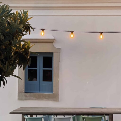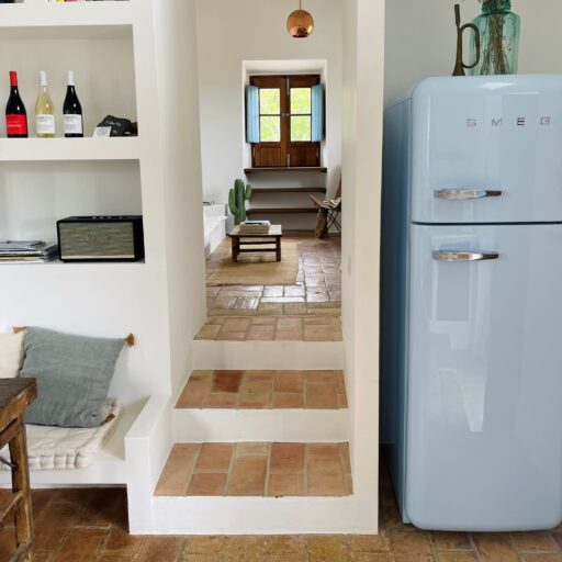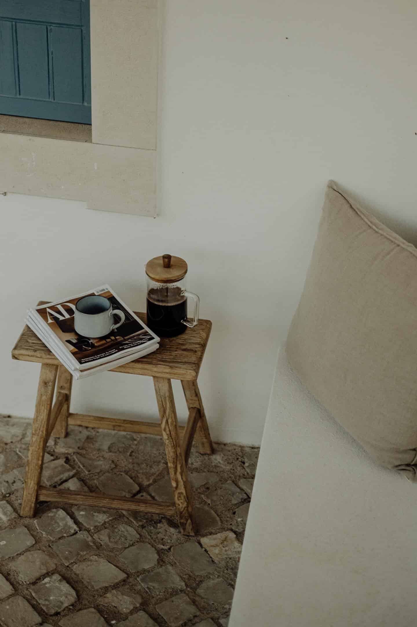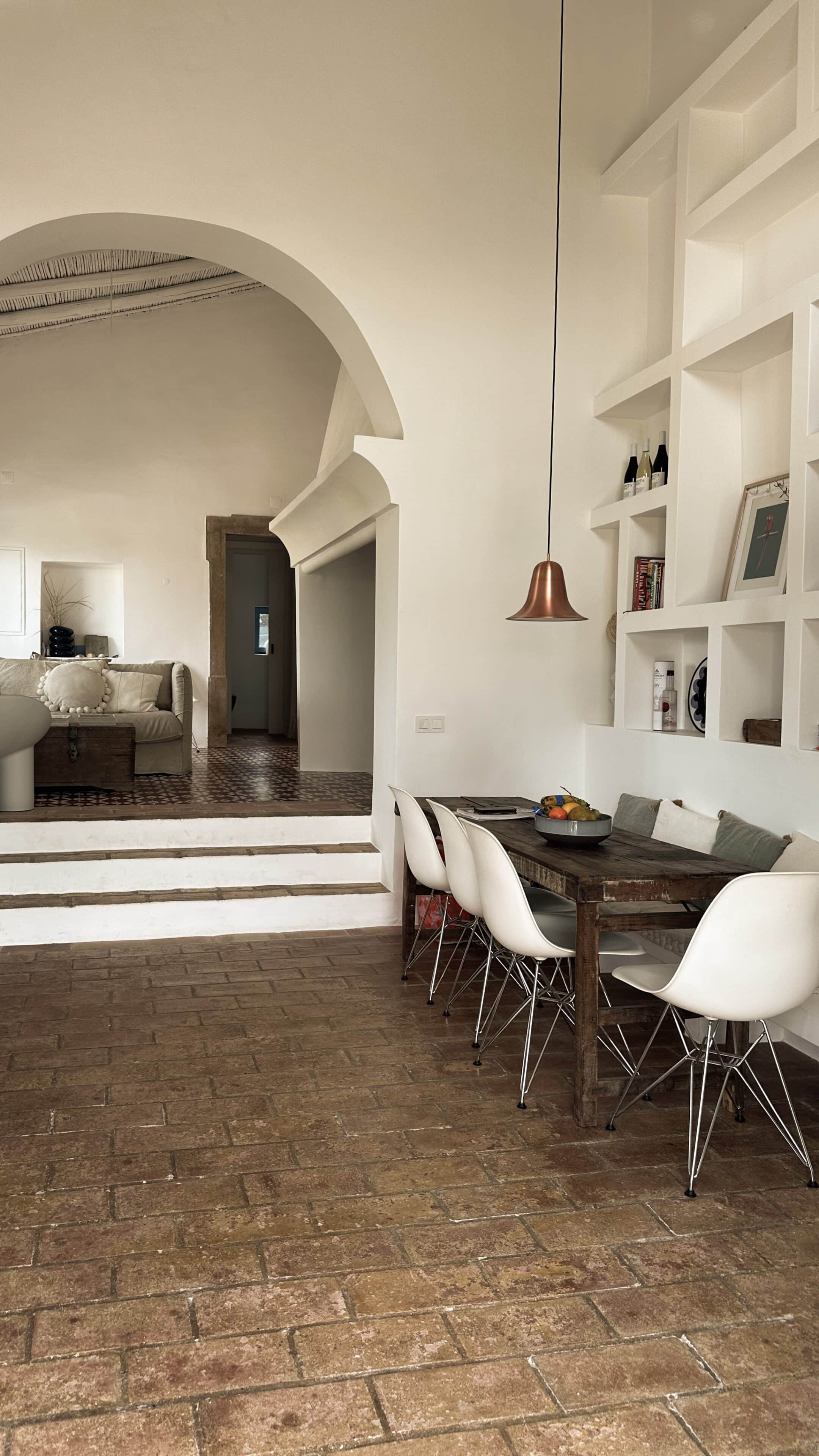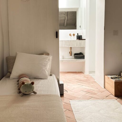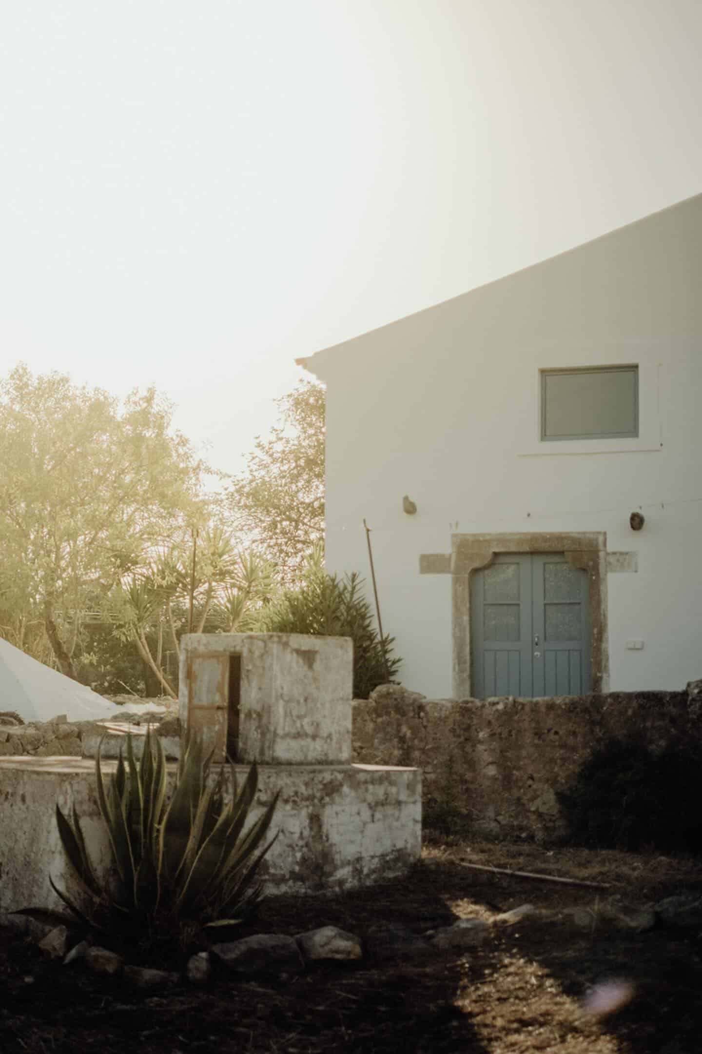 Am allerschönsten ist es hier, wenn die Abendsonne alles in ein warm-goldenes Licht taucht. Das ist der Moment, wenn man sich auf der Terrasse des weißgestrichenen Farmhauses mit seinen blauen Fensterläden einfindet, mit einem Gläschen Wein in der Hand, den Blick über den großen Garten schweifen lässt und nirgendwo sonst auf der Welt sein möchte – außer genau hier. Dieses Gefühl stellte sich bei den Gastgebern, einer kleinen Familie aus Düsseldorf, sofort ein, als sie auf das Haus in der Nähe von Loulé stießen. Till hatte als Kind oft die Sommerferien in Portugal bei seiner Tante verbracht, die dort lange lebte, und Frau Birthe und Sohn Pepe mit seiner Liebe zur Algarve angesteckt. Seit dem Kauf im Jahr 2022 haben sie das alte Haus mit frischem Design und einem veränderten Grundriss wieder zum Leben erweckt. Dabei haben sie besonderen Wert darauf gelegt, möglichst viel Ursprüngliches zu erhalten, um den Charakter des Hauses zu bewahren. So wurden der originale Ofen sowie die Santa Catarina-Bodenfliesen aufwändig restauriert. Neu eingezogen sind Design-Klassiker und Holzmöbel mit Patina. Viel Weiß und helle Naturtöne vermitteln Leichtigkeit, Wohntextilien, Bast- und Kupferleuchten sowie dezente Deko machen es gemütlich. Ebenso einladend ist es drumherum: Im gewachsenen, 3900 Quadratmeter große Garten mit Oliven-, Granatapfel-, Feigen- und den namensgebenden Mandelbäumen pendelt man entspannt zwischen Hängesessel und Liegestuhl. Im Hinterland gelegen, bietet die Casa Amendoeira mit den drei gemütlichen Schlafzimmern viel Ruhe und Entspannung. Die unschlagbar schönen Naturstrände der Region erreicht man in einer knappen halben Stunde – und so trifft hier alles mehr als glücklich zusammen, was einen Urlaub besonders macht: authentisches Dorfleben, Beach Vibes und ein Rückzugsort mit den wohl schönsten Sonnenuntergängen weit und breit.