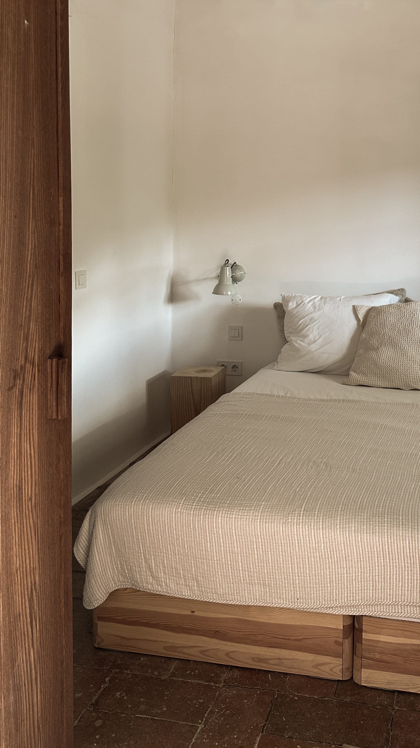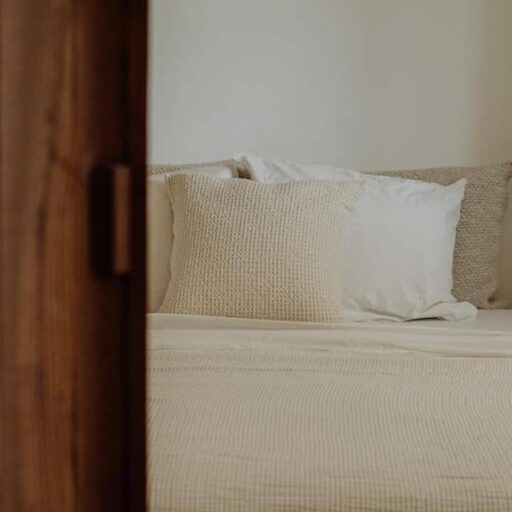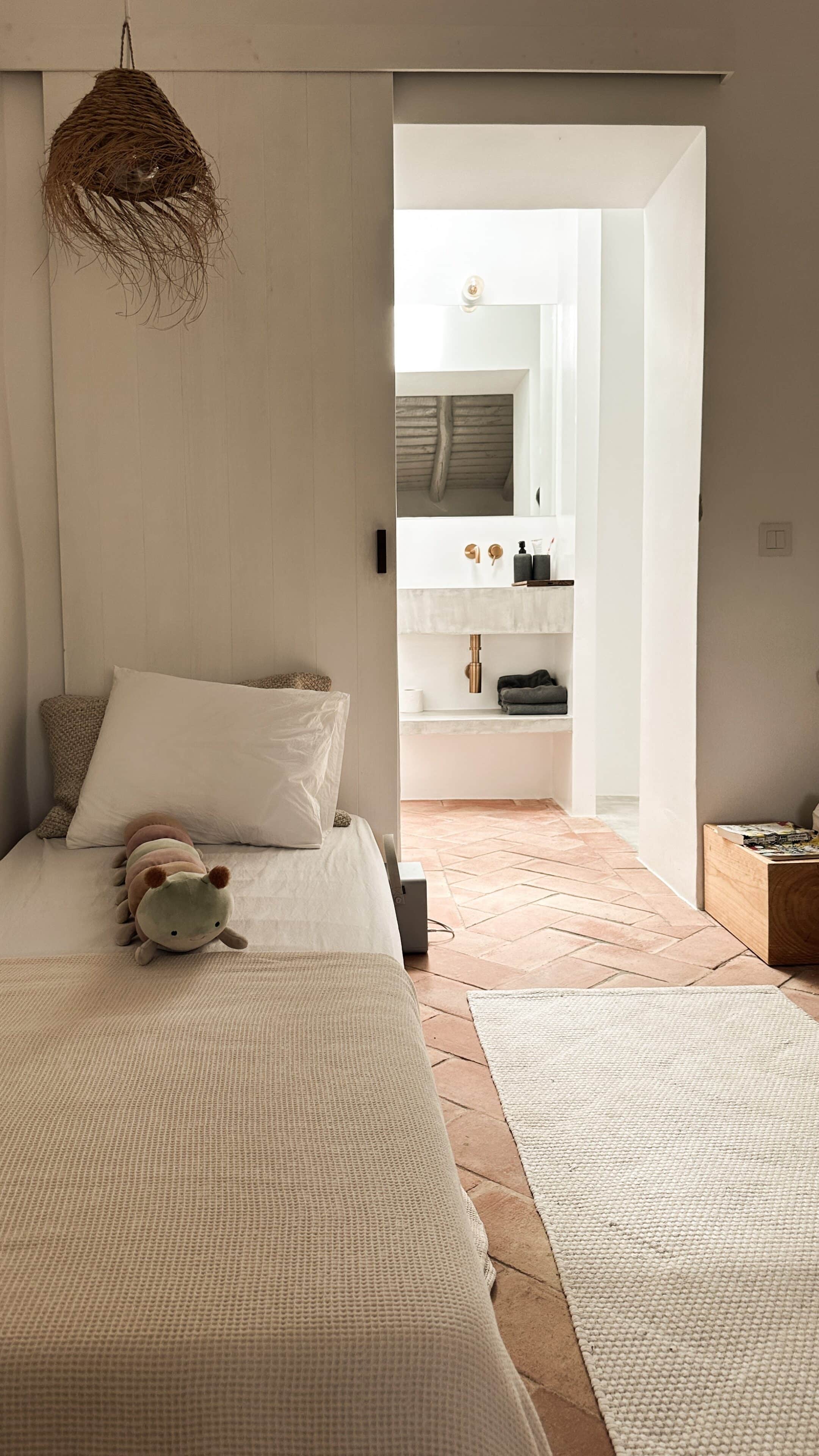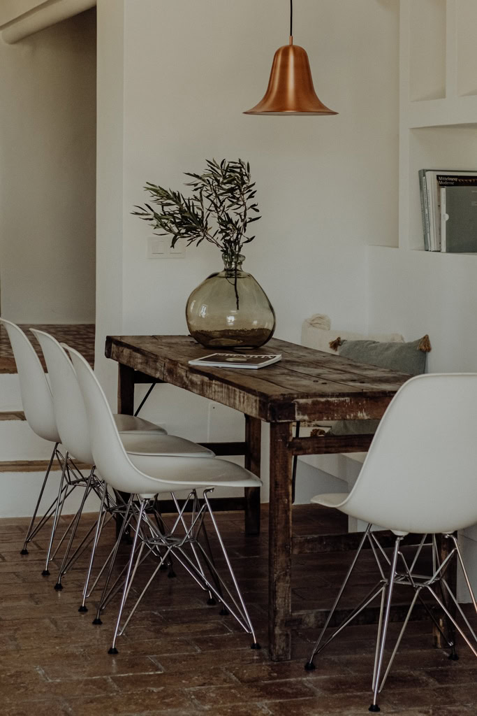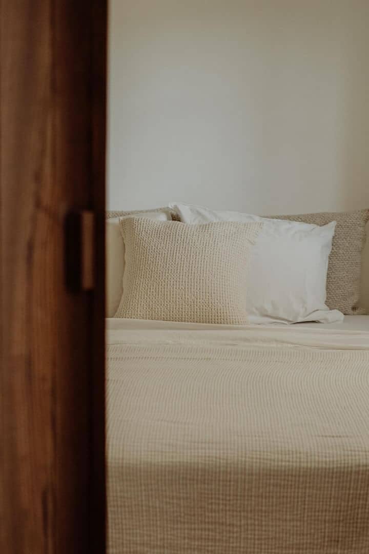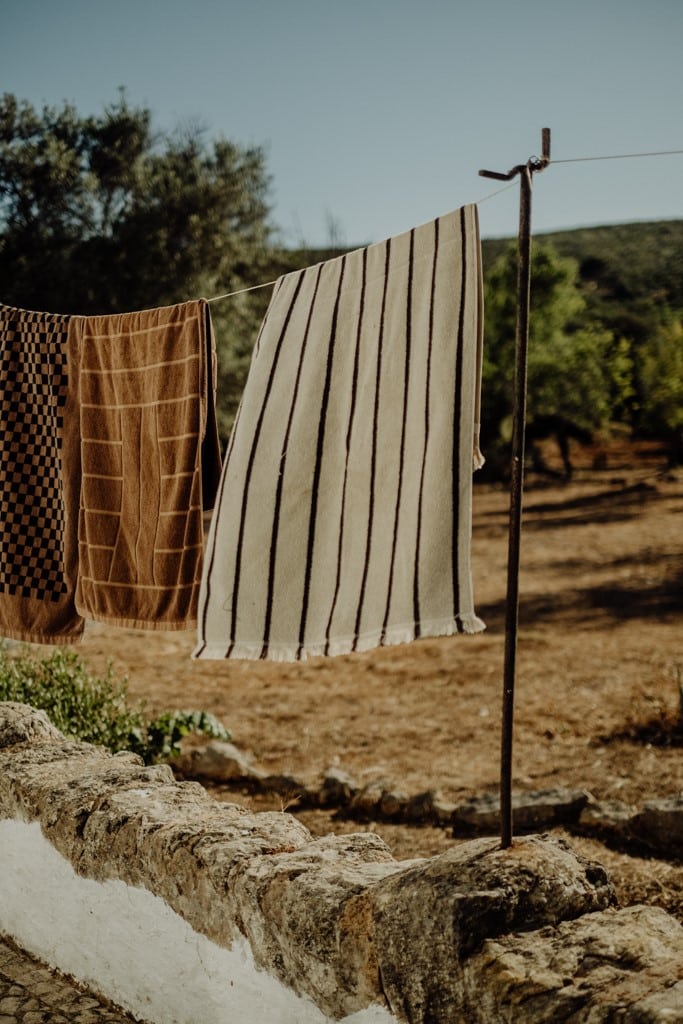 Am allerschönsten ist es hier, wenn die Abendsonne alles in ein warm-goldenes Licht taucht. Das ist der Moment, wenn man sich auf der Terrasse des weißgestrichenen Farmhauses mit seinen blauen Fensterläden einfindet, mit einem Gläschen Wein in der Hand, den Blick über den großen Garten schweifen lässt und nirgendwo sonst auf der Welt sein möchte – außer genau hier. Dieses Gefühl stellte sich bei den Gastgebern, einer kleinen Familie aus Düsseldorf, sofort ein, als sie auf das Haus in der Nähe von Loulé stießen. Till hatte als Kind oft die Sommerferien in Portugal bei seiner Tante verbracht, die dort lange lebte, und Frau Birthe und Sohn Pepe mit seiner Liebe zur Algarve angesteckt. Seit dem Kauf im Jahr 2022 haben sie das alte Haus mit frischem Design und einem veränderten Grundriss wieder zum Leben erweckt. Dabei haben sie besonderen Wert darauf gelegt, möglichst viel Ursprüngliches zu erhalten, um den Charakter des Hauses zu bewahren. So wurden der originale Ofen sowie die Santa Catarina-Bodenfliesen aufwändig restauriert. Neu eingezogen sind Design-Klassiker und Holzmöbel mit Patina. Viel Weiß und helle Naturtöne vermitteln Leichtigkeit, Wohntextilien, Bast- und Kupferleuchten sowie dezente Deko machen es gemütlich. Ebenso einladend ist es drumherum: Im gewachsenen, 3900 Quadratmeter große Garten mit Oliven-, Granatapfel-, Feigen- und den namensgebenden Mandelbäumen pendelt man entspannt zwischen Hängesessel und Liegestuhl. Im Hinterland gelegen, bietet die Casa Amendoeira mit den drei gemütlichen Schlafzimmern viel Ruhe und Entspannung. Die unschlagbar schönen Naturstrände der Region erreicht man in einer knappen halben Stunde – und so trifft hier alles mehr als glücklich zusammen, was einen Urlaub besonders macht: authentisches Dorfleben, Beach Vibes und ein Rückzugsort mit den wohl schönsten Sonnenuntergängen weit und breit.