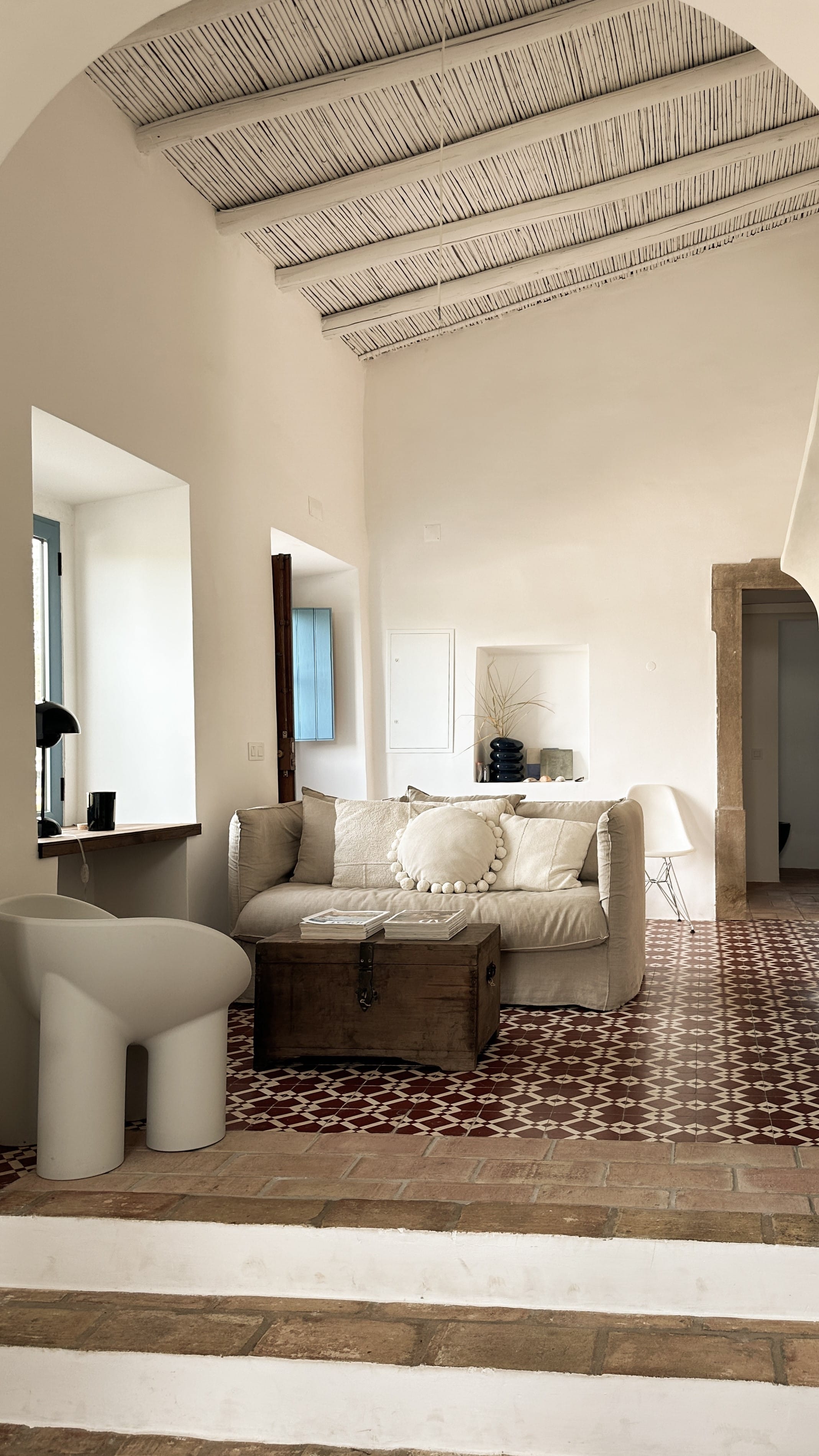 • den Mix aus rustikalem Bauernhaus und zeitgenössischem Touch. Die aus Holzbalken und Schilfrohr bestehende Decke wurde weiß gestrichen, die alte Holztruhe mit einem modernen Sofa und den klaren, runden Formen des Lounge-Stuhls Roly Poly von Driade kombiniert