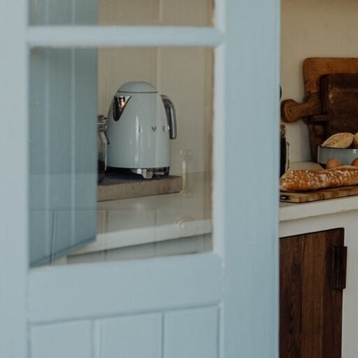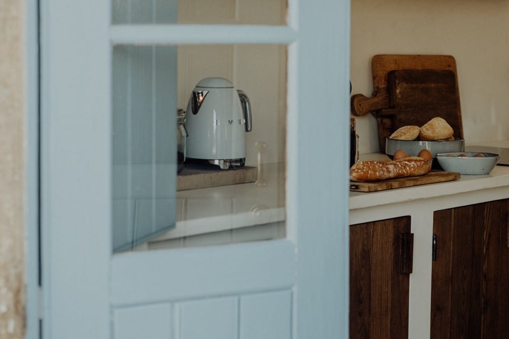 • wie sorgfältig die Küchenutensilien ausgesucht wurden: die gusseiserne Teekanne, das Besteck in einem matten Goldton und die hübsche Keramik