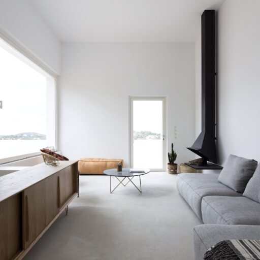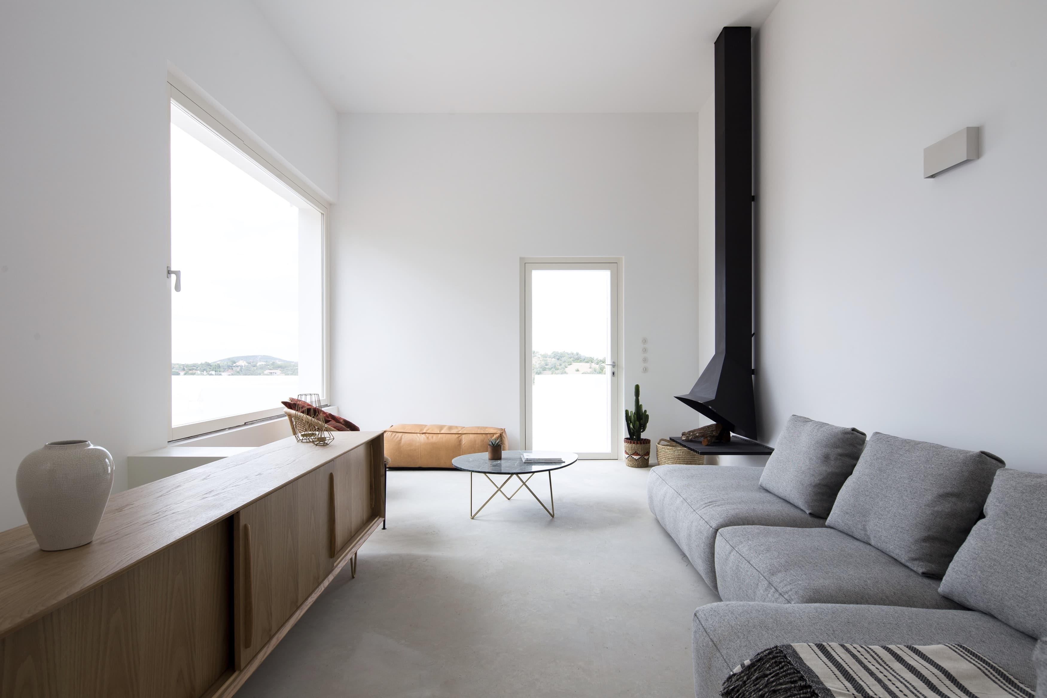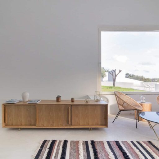 minimalistisch eingerichteter Wohnraum mit großem Fenster, Sitzplatz und Holz-Sideboard