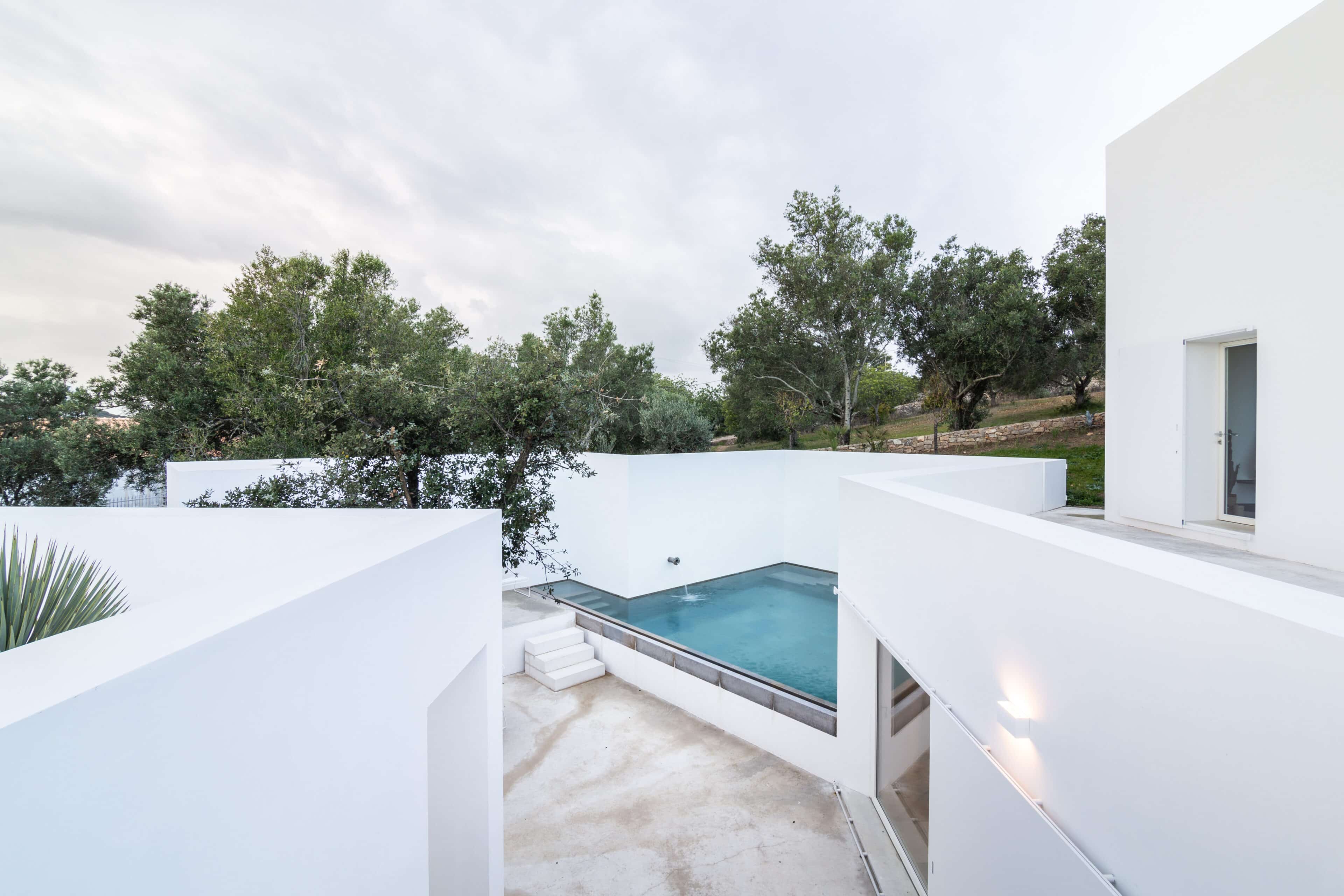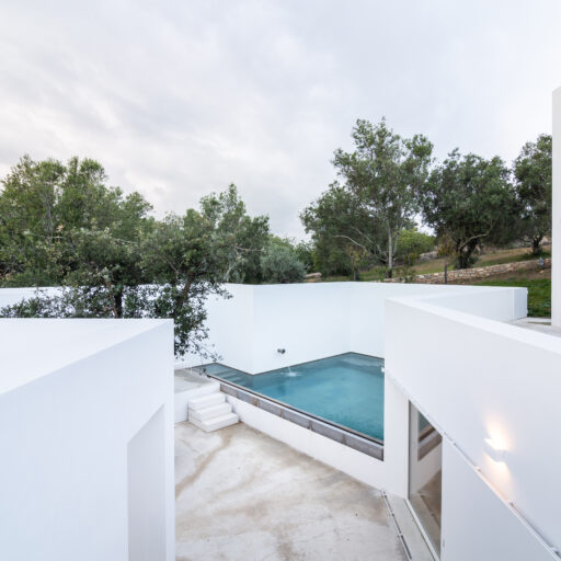 Treppe zum Pool, türkises Wasser und weiße Wände