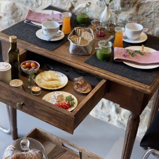 - mit dem ausgiebigen Frühstück „km0“ in den Tag starten: Brioche, selbstgebackenes Brot, hausgemachte Marmeladen, regionale Käsesorten, Obst und Gemüse und sogar ein Green Smoothie aus eigener Herstellung; angerichtet wahlweise auf der Terrasse oder im Frühstücksraum