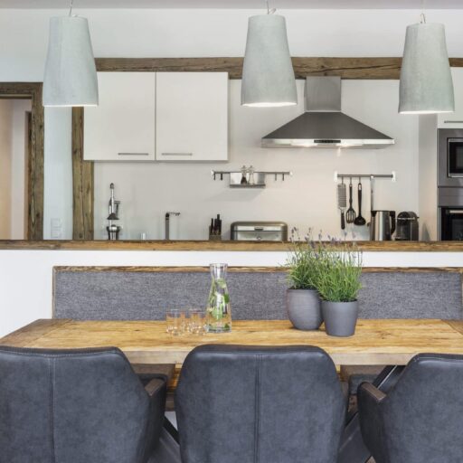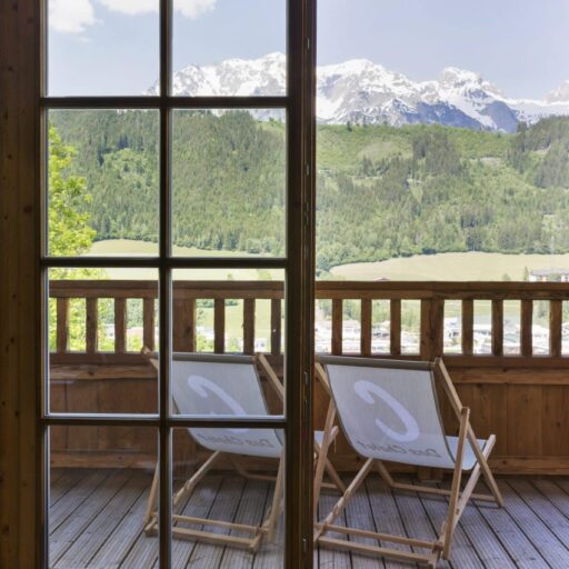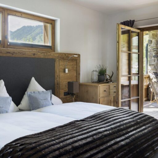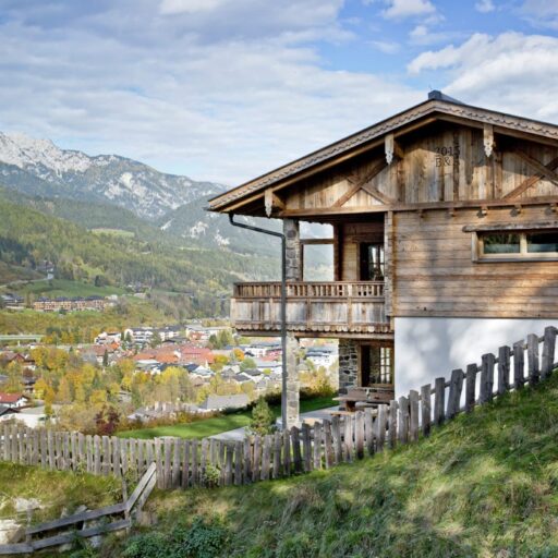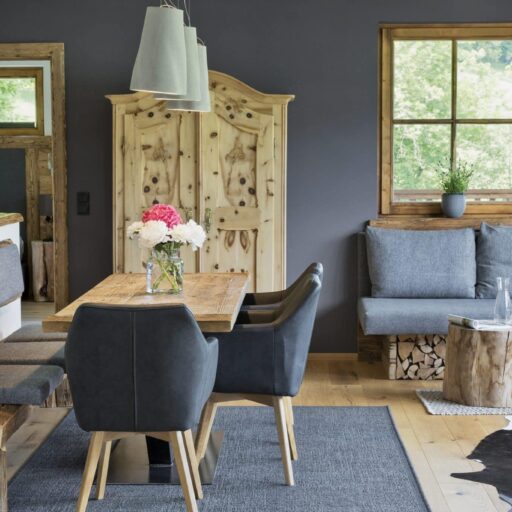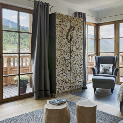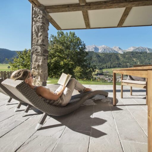 Wie soll man nur je wieder ohne diese Aussicht leben? Man kann es sich auf der Sitzbank beim Kamin gemütlich machen, am Esstisch, auf dem Sofa, im Doppelbett, auf der Terrasse und sogar in einer der Saunen: immer blickt man durch bodentiefe Fenster auf diese Idylle aus verstreut liegenden Häuschen, Wiesen und Bäumen und der alles überragenden, beeindruckenden Bergkulisse. Will man mal eine Pause vom „Gucken“ einlegen, schnallt man die Ski unter oder wandert drauflos – beides geht hier gleich hinterm Haus, wo Skilift und Wanderweg äußerst praktisch platziert sind. Wenn es jedoch schwerfällt, sich von den großzügigen Appartements mit all ihren Lieblingsplätzen und Aussichtspunkten loszureißen, ist das nur allzu verständlich. Die Gastgeber Brigitte und Andreas Kahr haben lange geplant und viele Ideen gesammelt, um die beiden Ferienwohnungen so zu gestalten, wie sie selber gerne ihren Urlaub verbringen. Da ihr Herz nicht nur an den Alpen, sondern auch an den Rocky Mountains hängt (wo Andreas einige Zeit als Skilehrer gelebt hat), ist das Ergebnis ein elegantes und individuelles Hideaway im urig-modernen Alpin-Stil, gemixt mit dem rustikalen und gemütlichen Look der Rocky-Mountains-Cabins. Ganz viel Holz und Naturstein, viel Licht, gemütliche Sitzecken, Terrassen, Sauna, luxuriöse Bäder und ein großer Kachelofen sorgen dafür, dass man sich hier pudelwohl fühlt und ruckzuck die Batterien auflädt – den Blick immer fest auf die Berge gerichtet.
