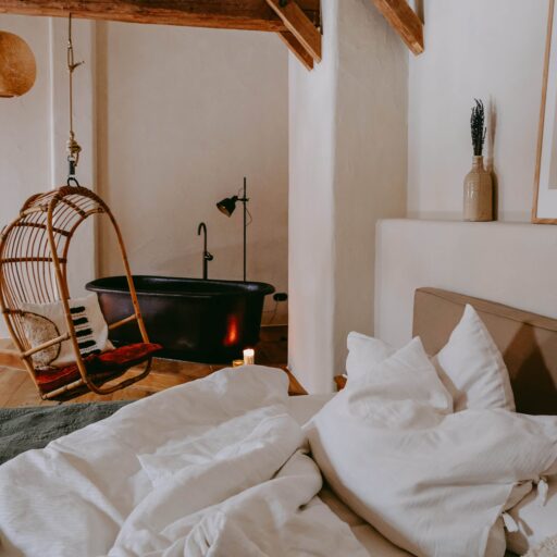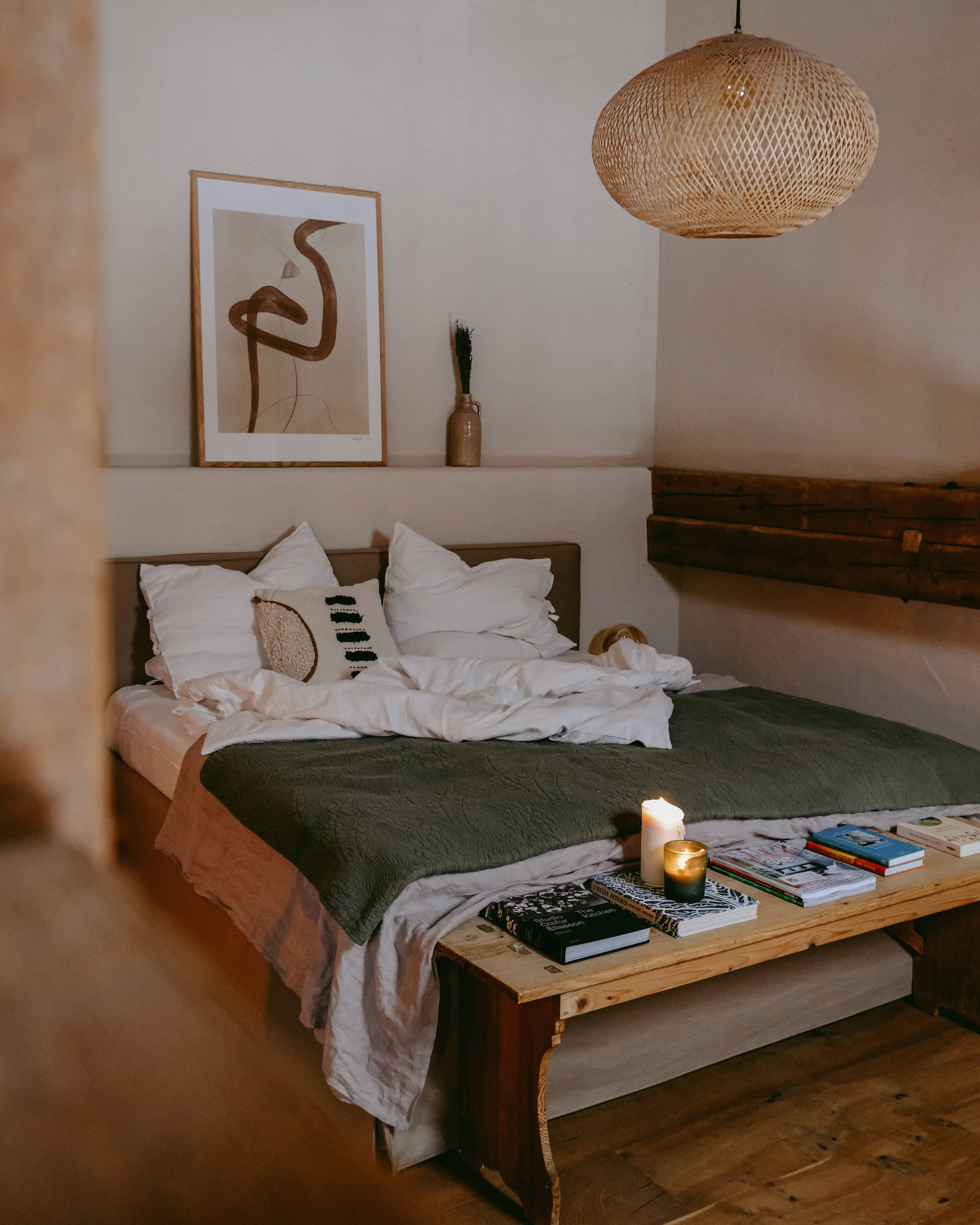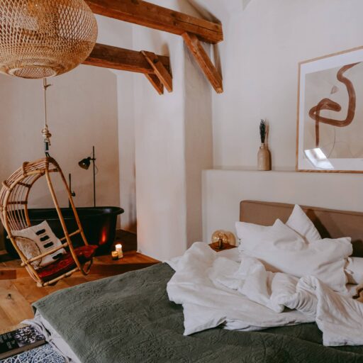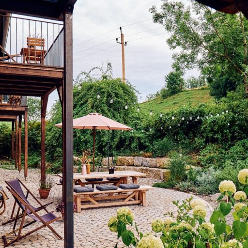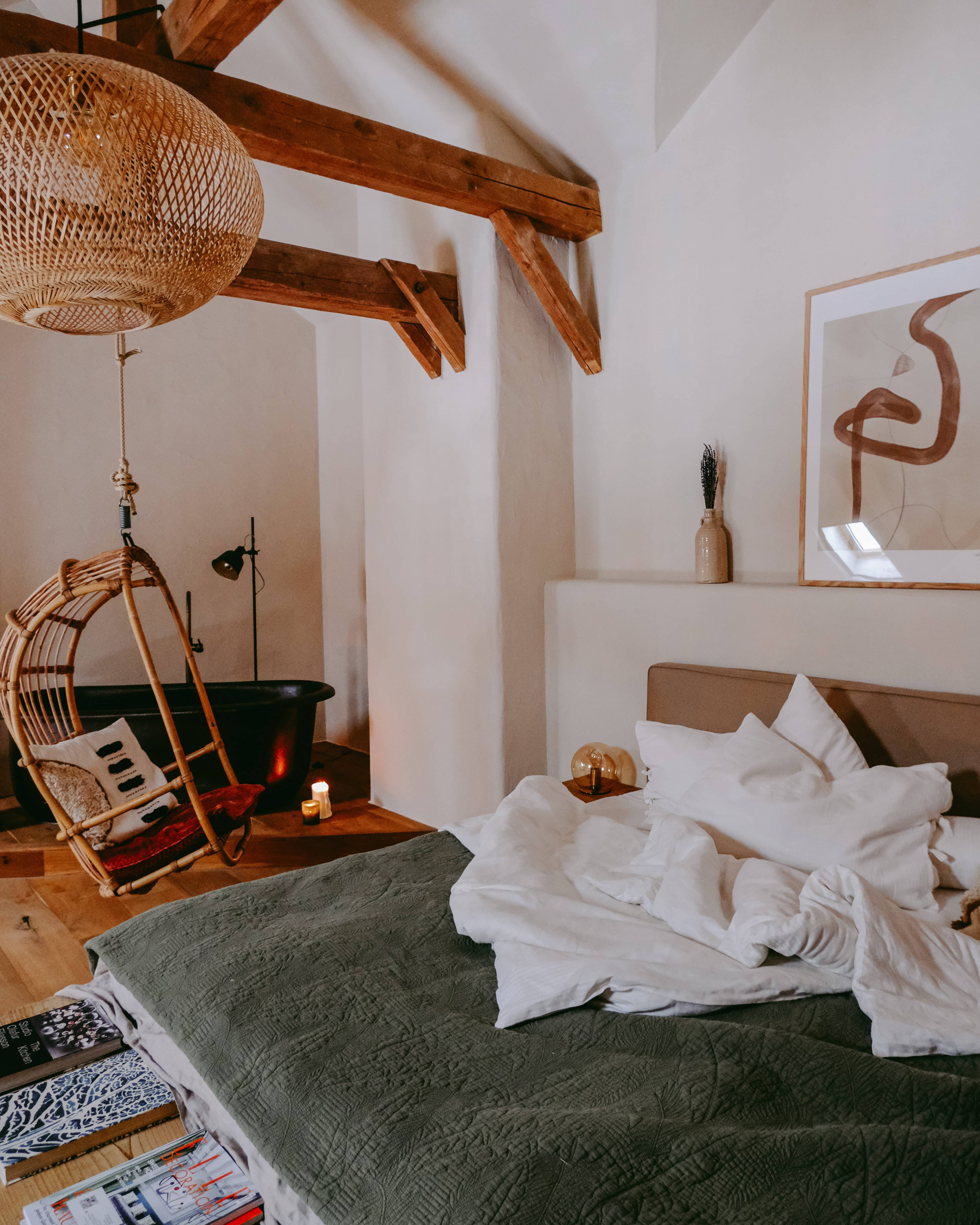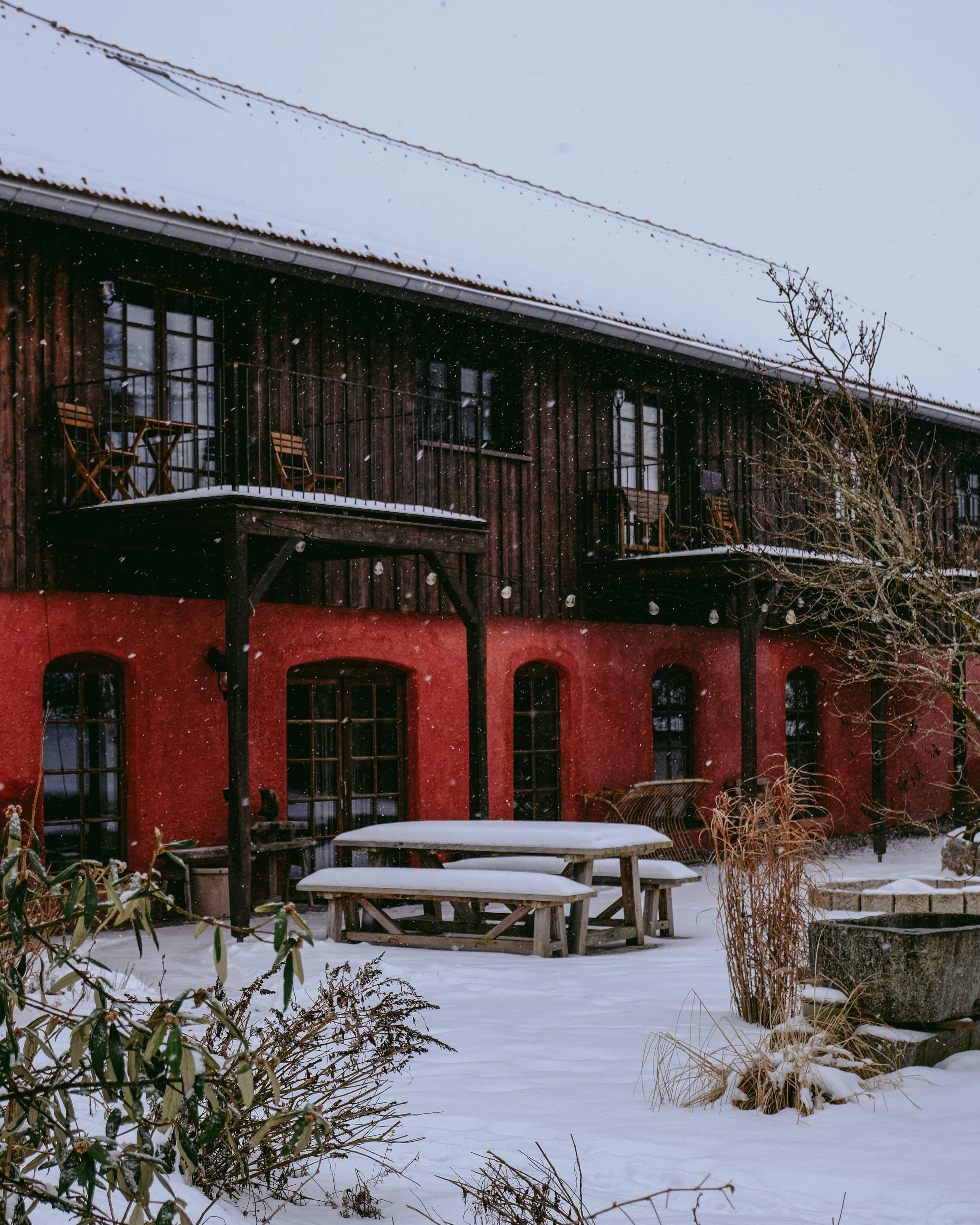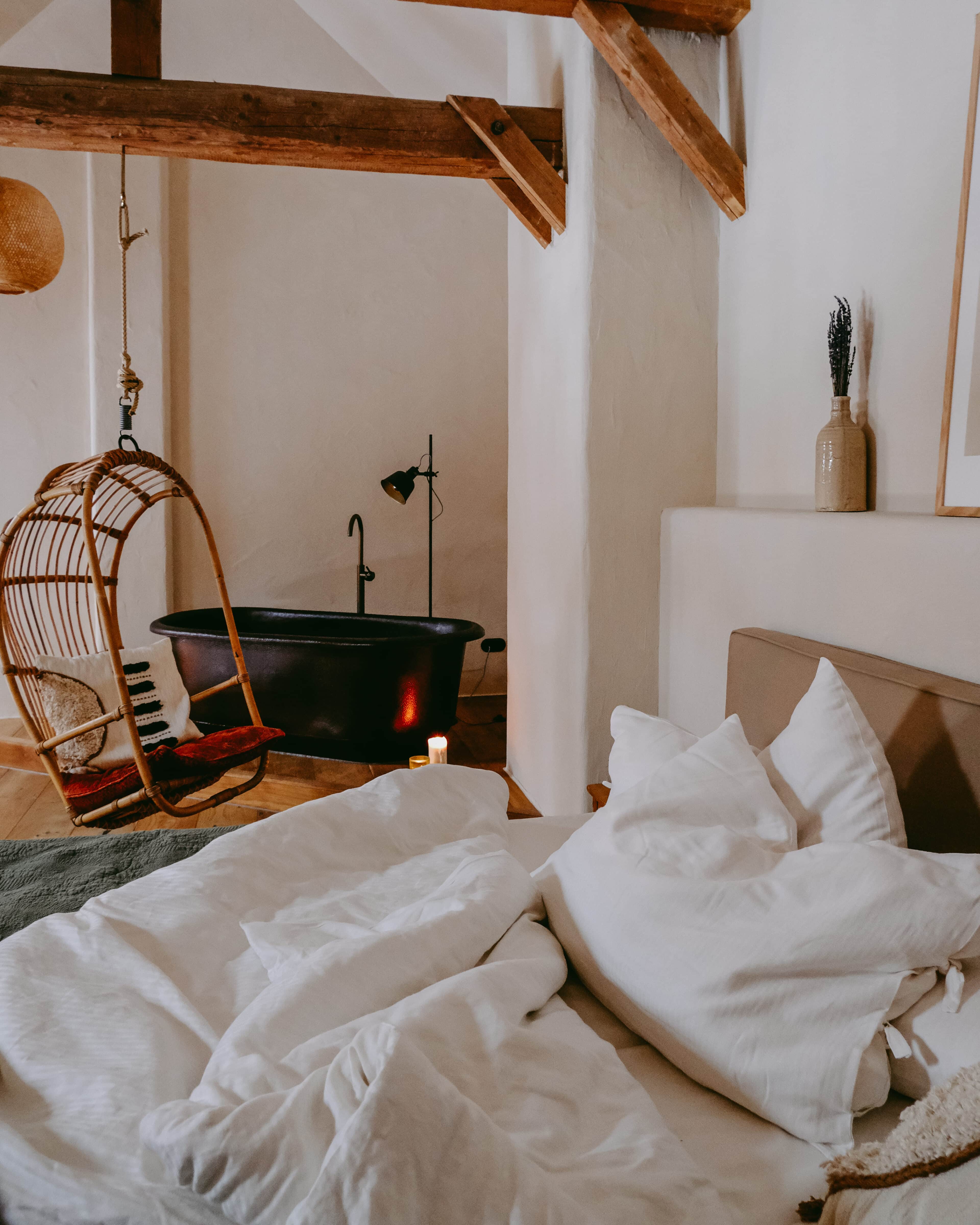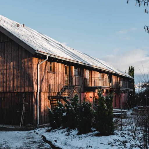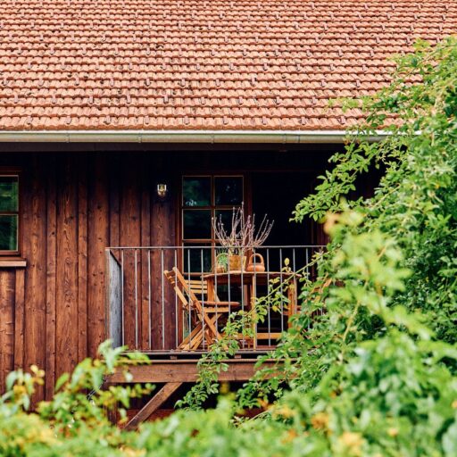 Es gibt sie manchmal, diese besonderen Orte. Wo man sich einen Hauch freier fühlt. Wo die Welt ein guter Ort ist. So ein Ort ist das Rosso in Altusried im Allgäu. Obstbäume, Hühner, Bienen, Schaukeln. Dazwischen ein altes Bauernhaus, in dem alt und neu, bunt und schlicht haargenau richtig zusammengemixt sind. Geschaffen hat diese Idylle das junge Paar Lisa und Christian, Creative Director und Start-up-Gründer. Aus dem hippen Karoviertel in Hamburg haben sie sich aufgemacht in den bergigen Süden des Landes, auf der Suche nach einem ruhigeren Leben inmitten der Natur. Hier im Allgäu haben sie ihr Glück in Form eines alten Bauernhofes gefunden, den sie mit viel Liebe und Sinn für gute Architektur und einem stilsicheren Händchen in ein italienisch anmutendes Landgut verwandelt haben. Denn die Liebe der beiden gehört eigentlich Italien, samt der zugehörigen kulinarischen Feinheiten und der entspannten Daseinsart. Zum Glück teilen sie ihren Dolce-Vita–in-der-Natur-Traum großzügig mit ihren Gästen. Ins knorrige Gebälk der alten Tenne, wo früher das Heu für die Tiere gelagert wurde, sind nämlich die drei wunderbaren Bleiben „La Bella“, „La Famiglia“ und „La Grande“ eingezogen. Altes Holz, Kalkputz, hohe Decken, viel Licht. Schlicht und komfortabel. Zeitgemäß und gleichzeitig urig. Mit voll ausgestatteter Küche, großem Holztisch, an dem alle Platz haben, hohen Decken, urgemütlichen Betten, handverlesenen Bauernmöbeln, kuscheligem Daybed, Blumen, Leinen, Wärme. Einen großen Balkon zum Sonnenunterganggucken gibt es auch. Und eine Sonnenterrasse im Hof, wo man vor roten Bruchsteinmauern sitzt, den Vögeln lauscht und den sechs Hühnerladies mit ihrem Mr. Hahn beim Flanieren zuschaut. Nichts und niemand schubst einen hier durch den Tag. Ein Ort zum Ankommen und Bleiben.