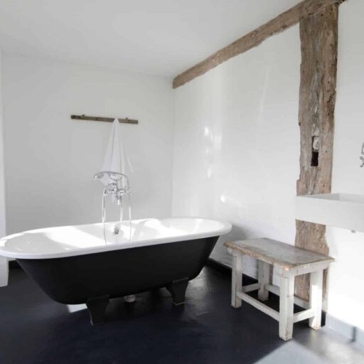- das wunderschöne Bad in Weiß und Schwarz, mit freistehender Badewanne und Blick in den Garten