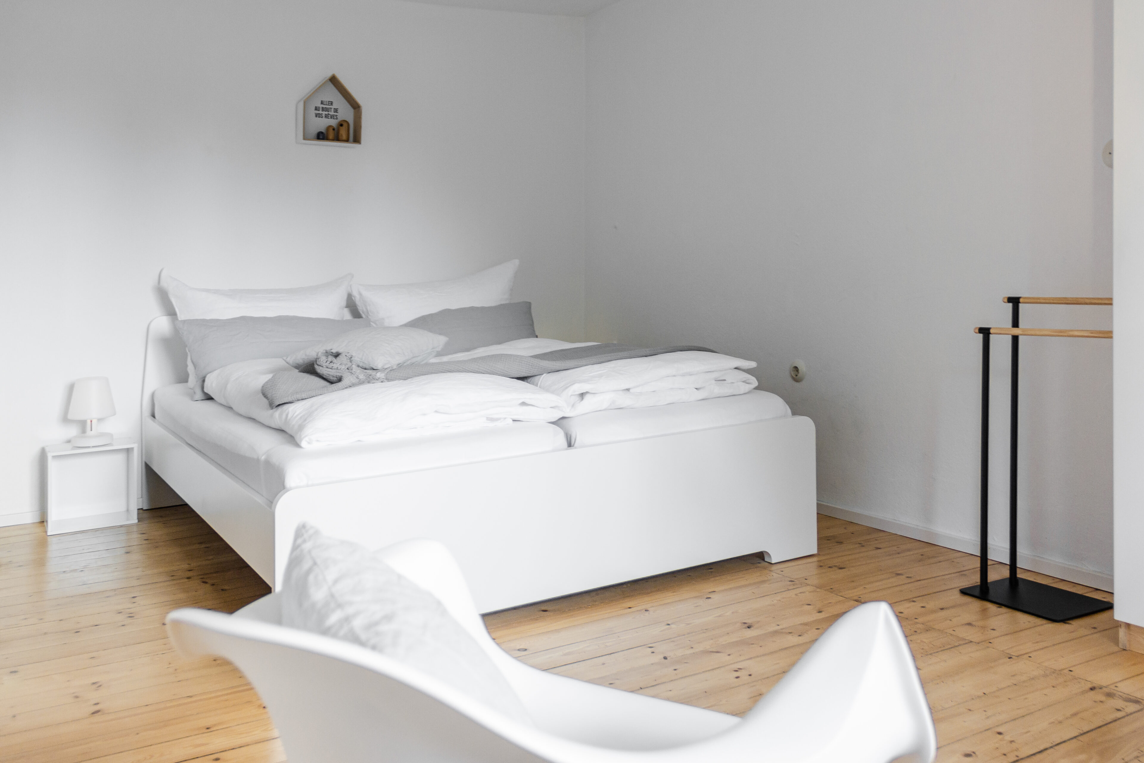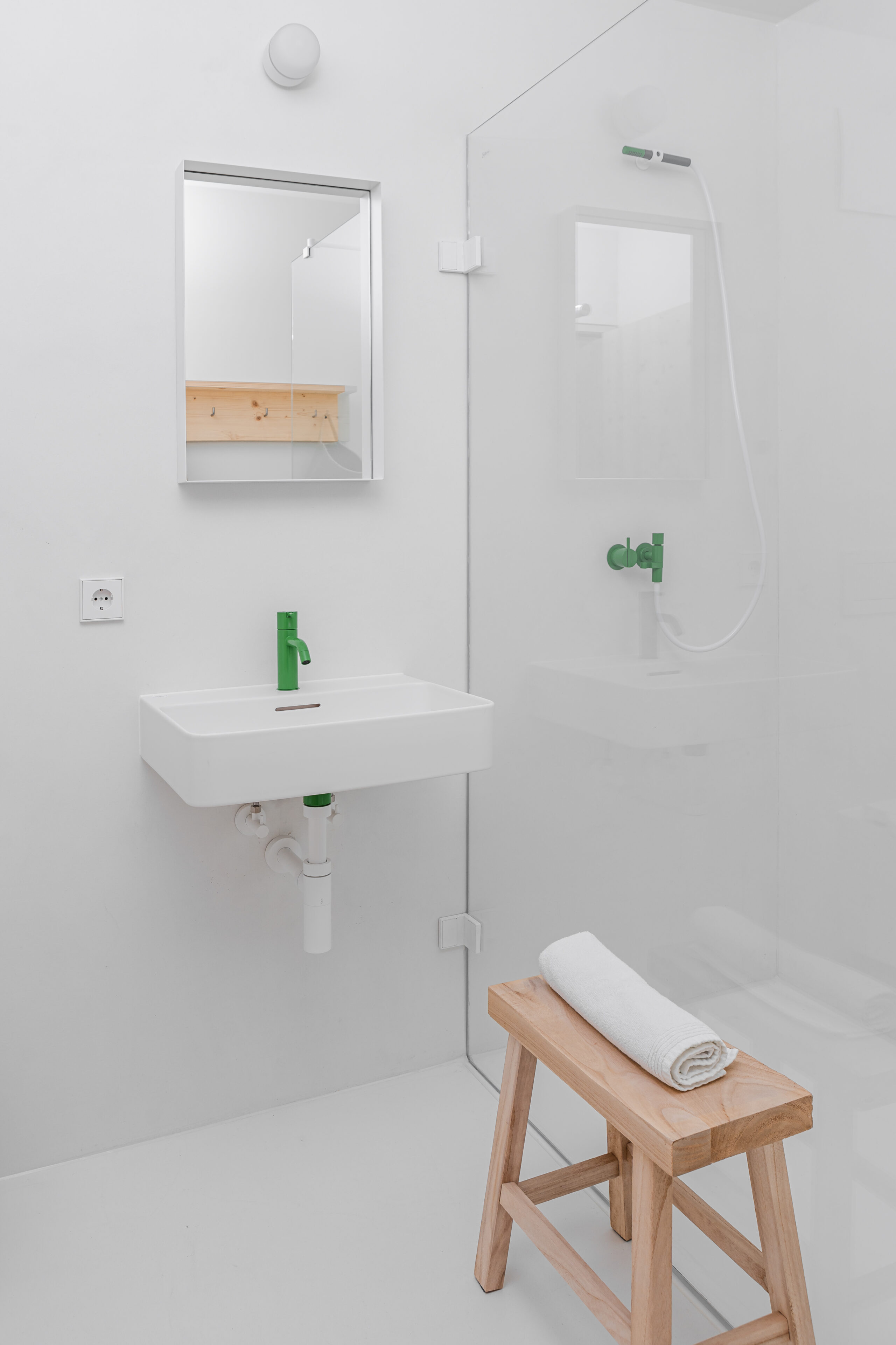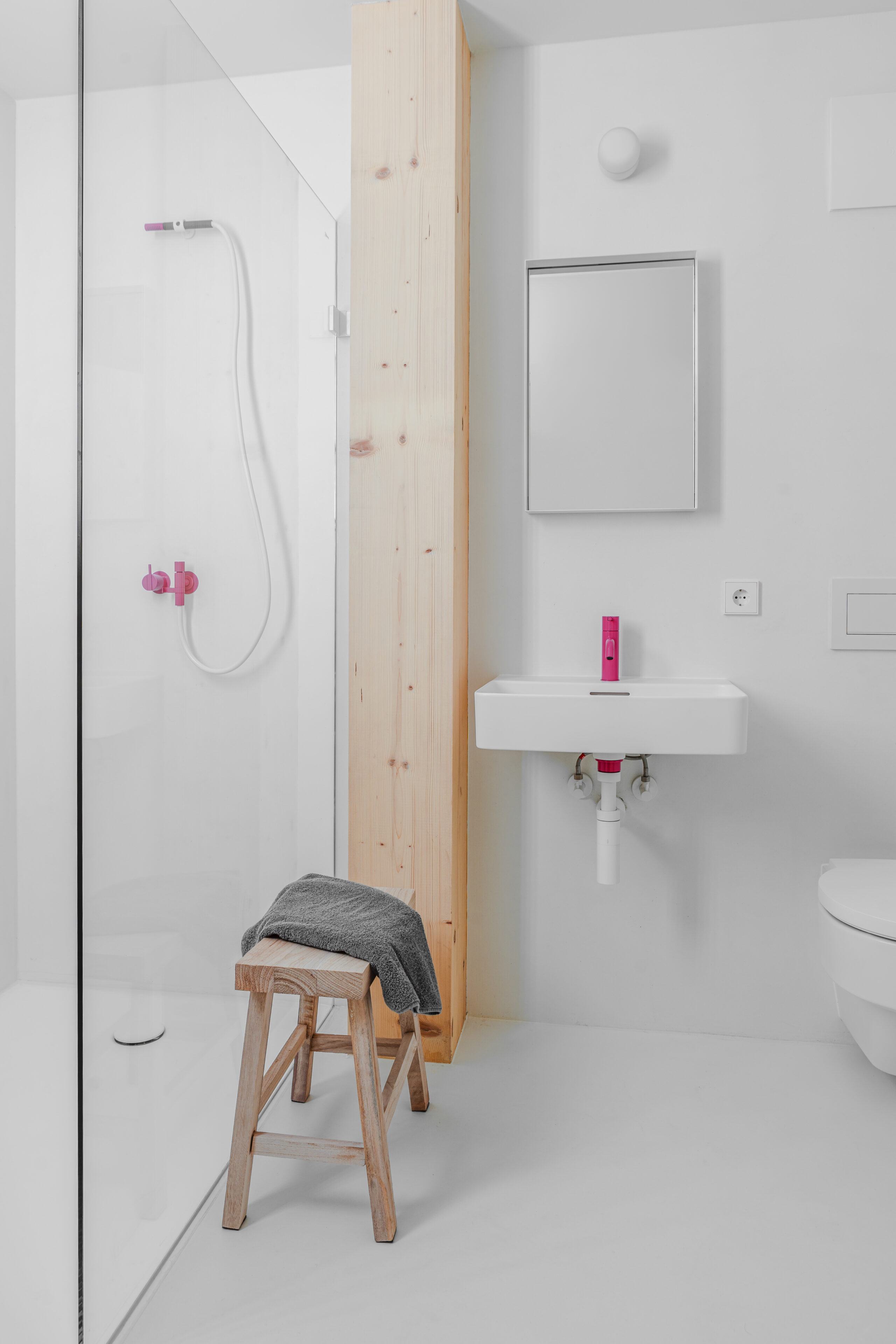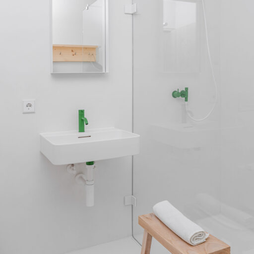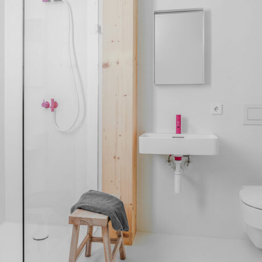 • jedes Apartment hat neben der weißbetonten Farbauswahl auch einen knalligen Farbton als spannenden Effekt, so sind die Armaturen im Bad, einzelne Textilien oder Anstriche in Orange, Pink, Grün, Gelb gestaltet