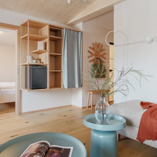 • wie geradlinig und puristisch die Zimmer eingerichtet sind, hier ist nichts überflüssig – sogar ein sternförmiges Deko-Objekt entpuppt sich auf den zweiten Blick als Garderobe. Durch viel Holz und natürliche Materialien stellt sich sogleich Gemütlichkeit ein