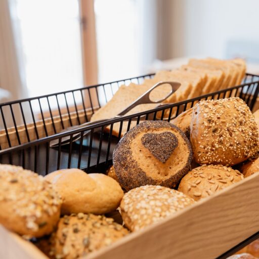 • das liebevoll zubereitete Frühstücksbuffet, angerichtet in Weckgläsern und mit hübscher Keramik, mit hausgemachten Aufstrichen, frisch gebackenem Brot, Miso-Suppe und dem weltbesten Honig von Hobby-Imker Franz