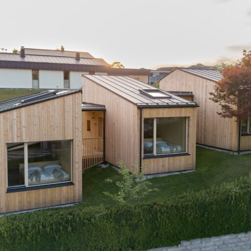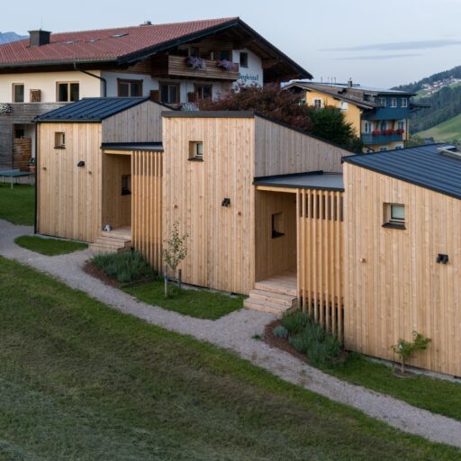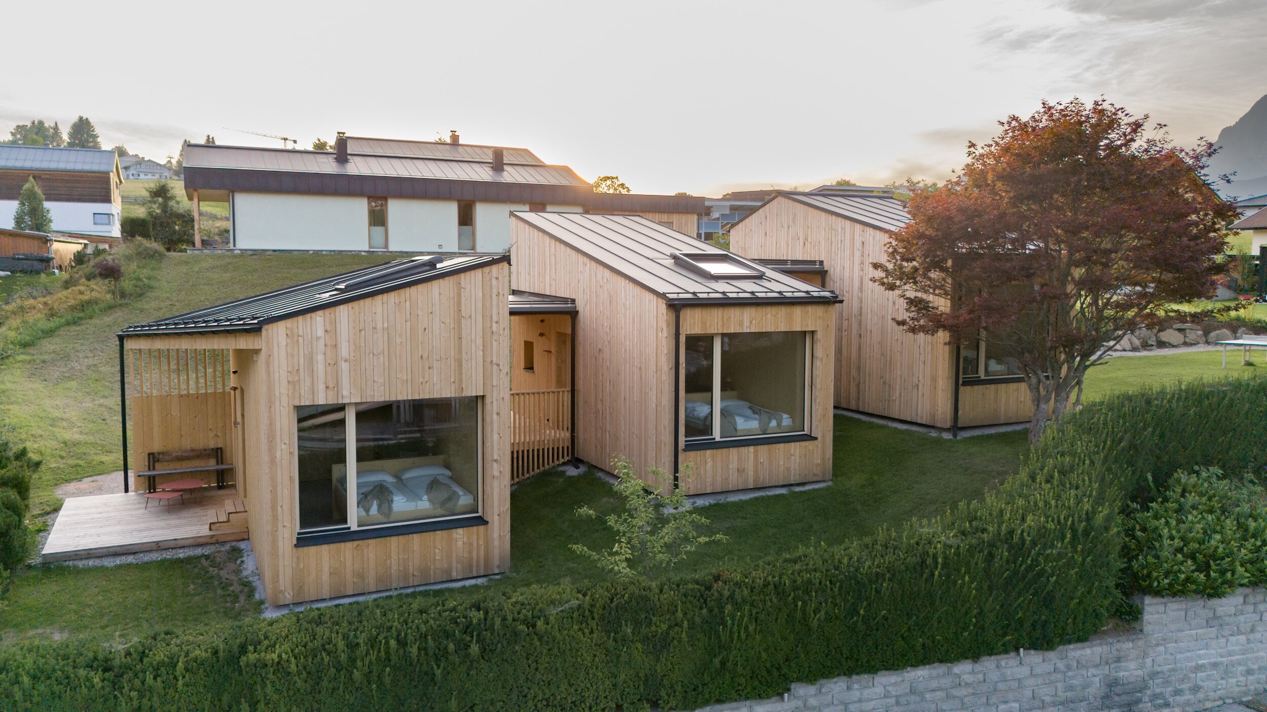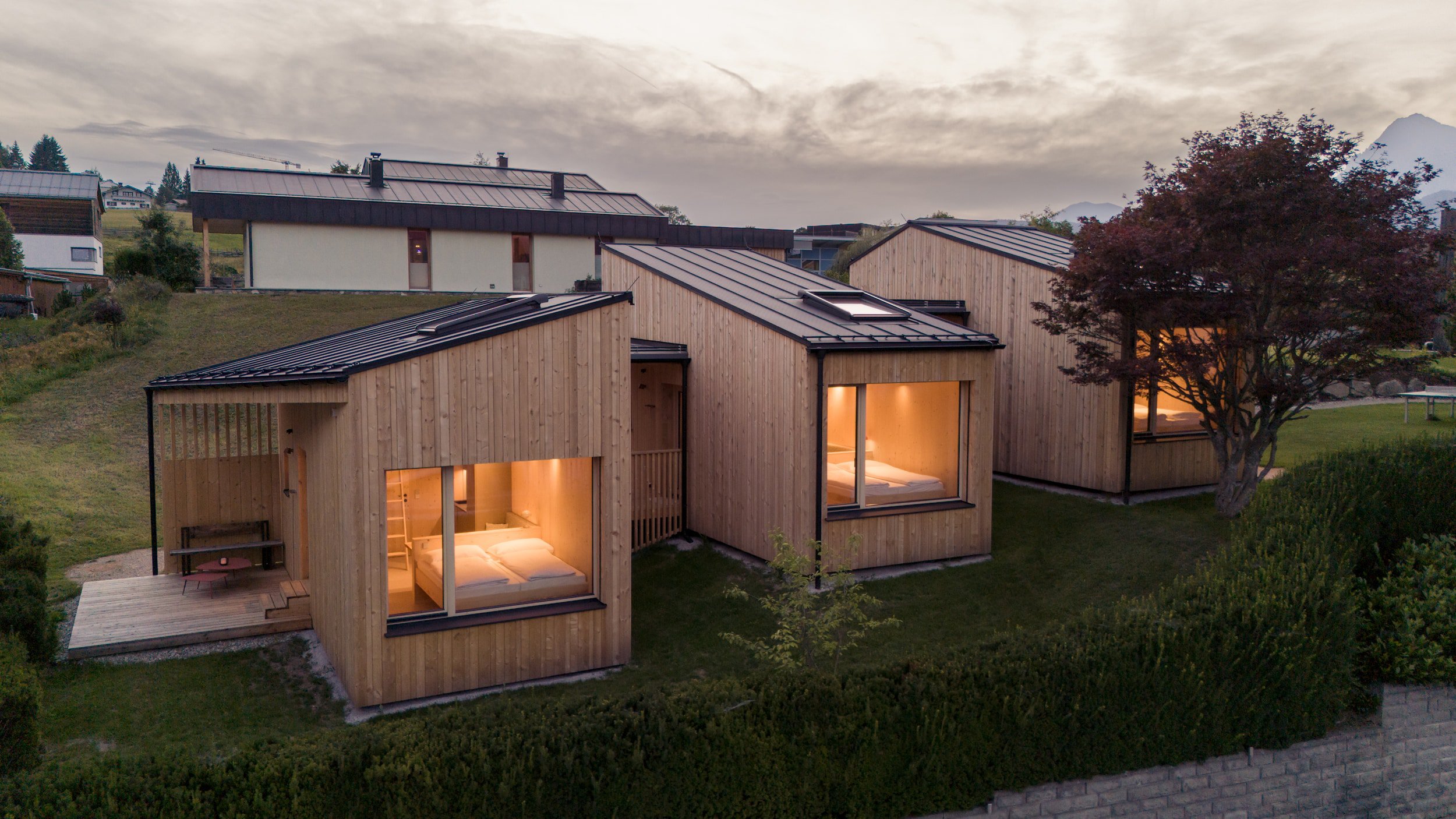 • die freistehenden, komplett aus Holz gebauten Tinyhouses im Garten, vom Doppelbett schaut man ins Grüne – und durch das Panoramafenster im Dach in die Sterne