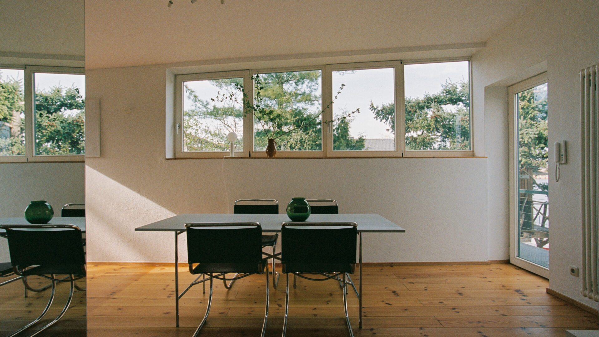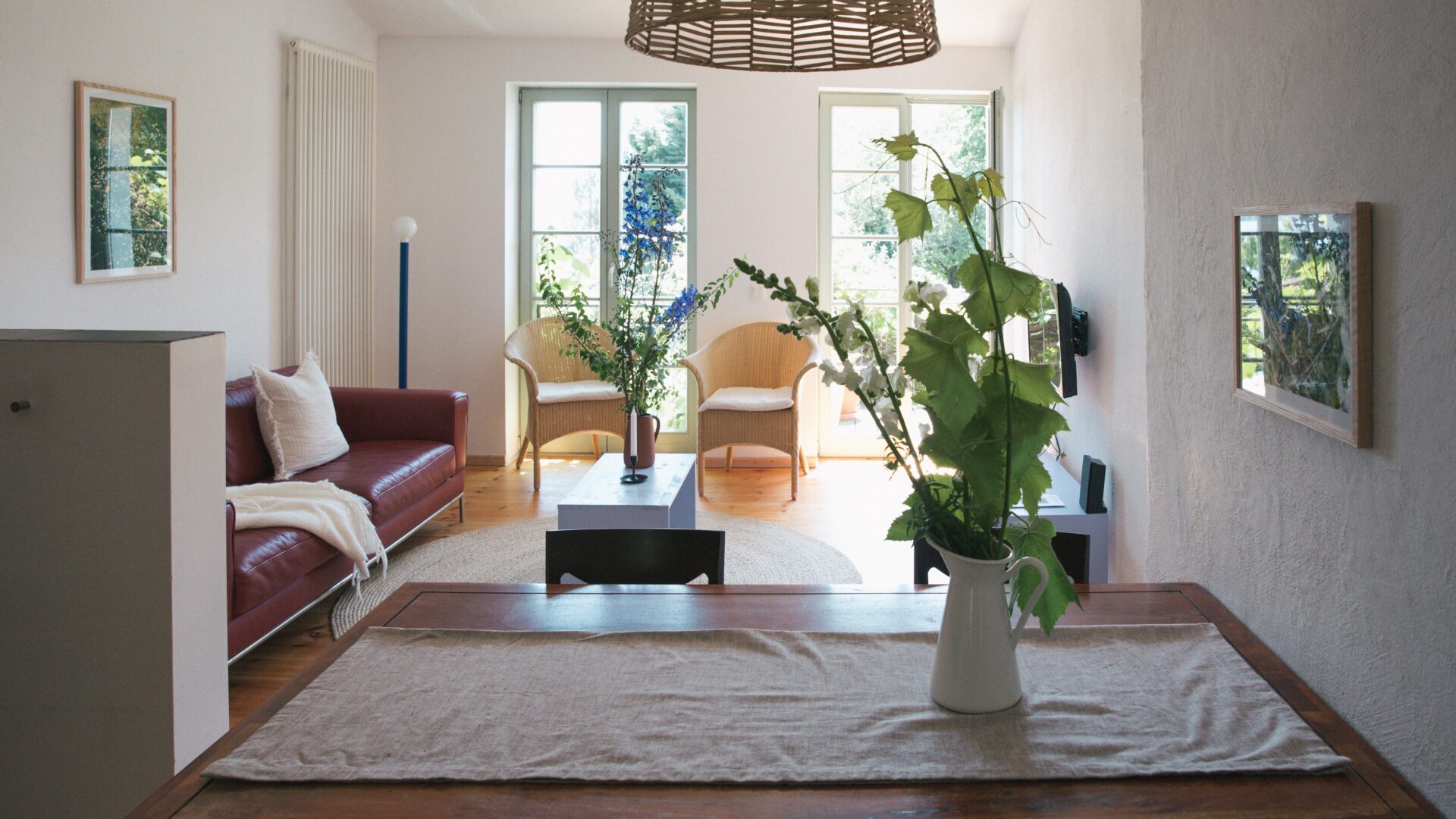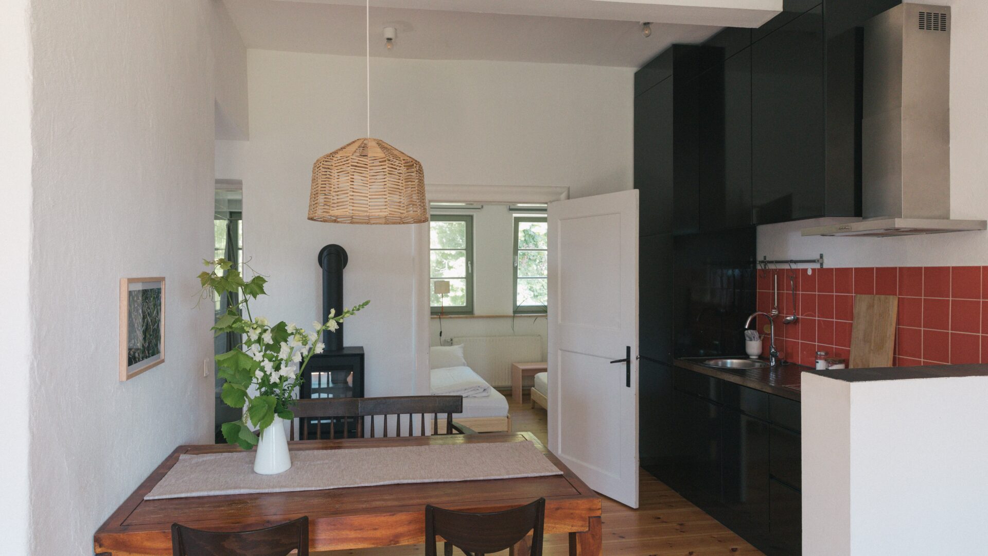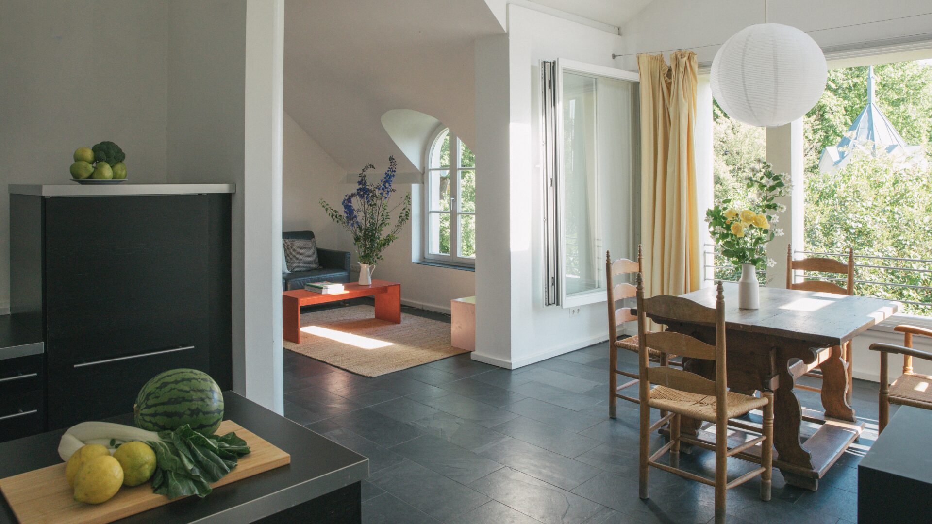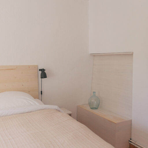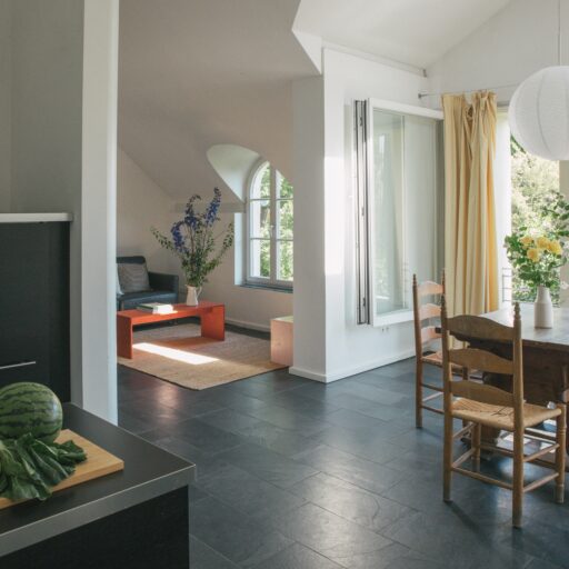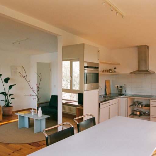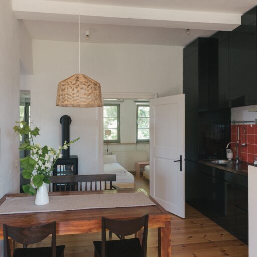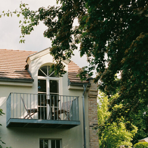 - 8 unterschiedlich große Apartments verteilen sich auf 4 Häuser auf zwei Grundstücken, beide direkt am Fluss gelegen. Sie bieten 1 bis 6 Personen Platz. Alle verfügen über gut ausgestattete Küchen, jede Wohnung hat einen Balkon, eine Terrasse oder einen Gartenzugang, auf Anfrage kann auch das gesamte Ensemble gemietet werden: für kleine Produktionen, Shootings oder Feste und Hochzeiten im Grünen