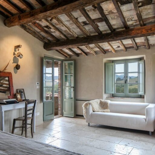 - jedes Zimmer ist unterschiedlich groß. Während das eine etwas luxuriöser ist, weil größer und mit Kamin, eröffnet das andere den Blick auf das Panorama von Montepulciano. Das nächste wiederum ist in der Art eines Lofts ohne Barrieren und Türen gestaltet