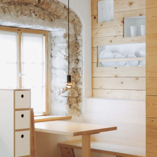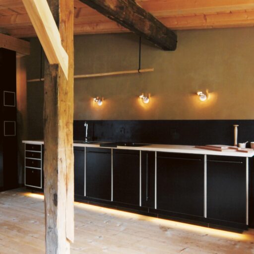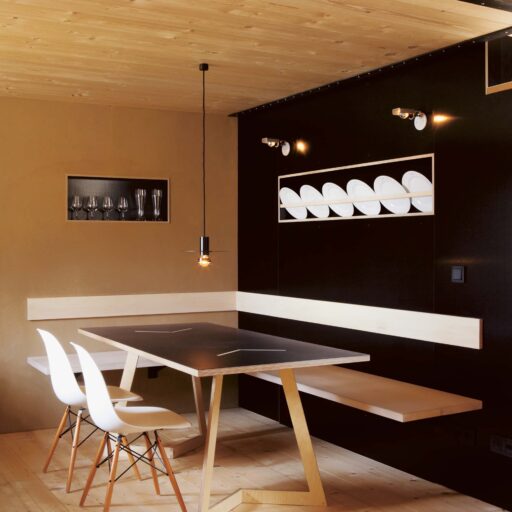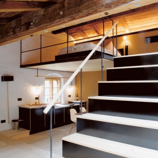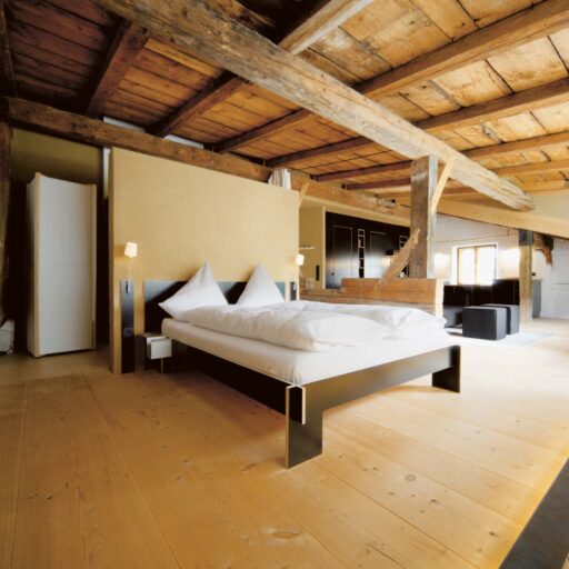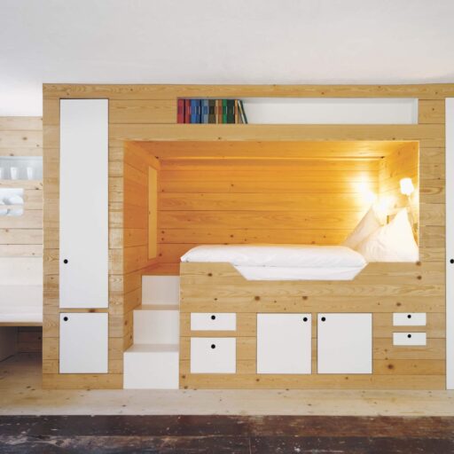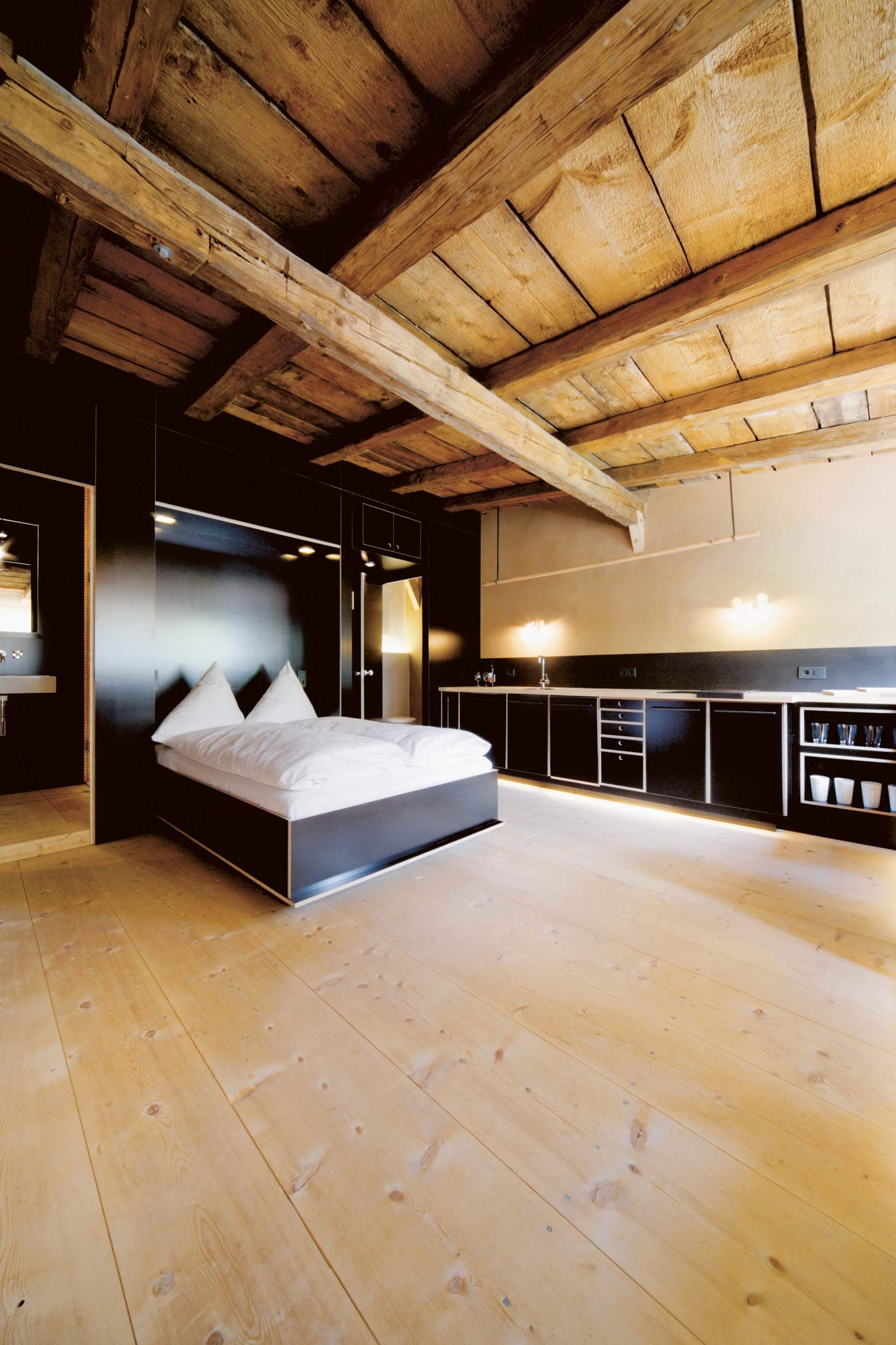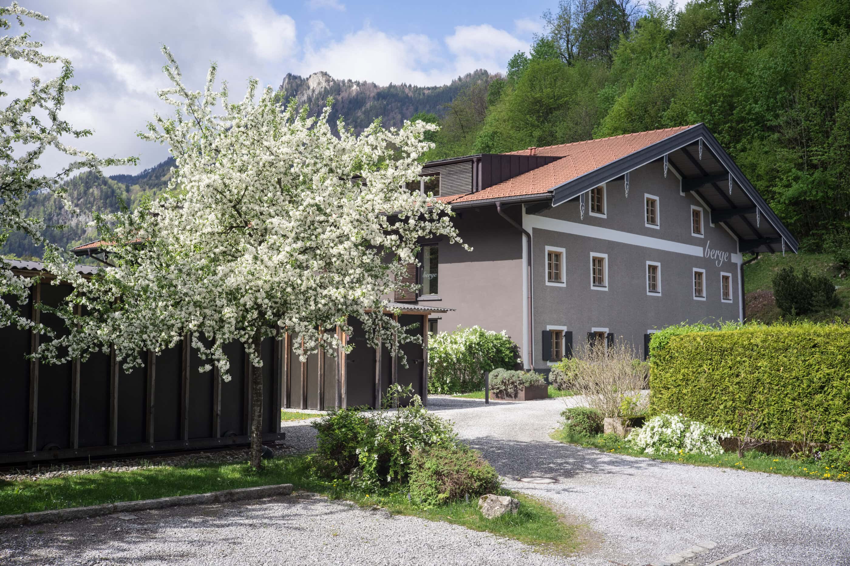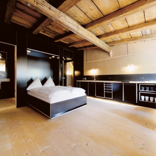 „Alles weglassen, was unnötig ist“ – so lautet die Philosophie des Gästehauses berge in Aschau im Chiemgau. Ursprünglich wurde es von dem Designer und Möbelunternehmer Nils Holger Moormann entwickelt, der für sein unkonventionelles, intelligentes und hochwertiges Möbeldesign bekannt ist. 2005 entdeckte er das rund 350 Jahre alte Gebäude und verwandelte es in eine außergewöhnliche Herberge. Seit 2025 wird das Haus von Nicole Martinsohn mit derselben Liebe zum Detail weitergeführt. 17 verschiedene Unterkünfte zählt das Quartier in Oberbayern, sie heißen Bergbude oder Zaungast und reichen vom Tiny House im Bauerngarten bis zur Galeriewohnung unterm Dach. Alle sind individuell gestaltet, sprechen aber die gleiche Formensprache – und am liebsten würde man in jedem einzelnen (mindestens!) eine Nacht verbringen. Die historische Substanz wurde in dem alten Bauernhaus erhalten und in einen spannenden Kontrast zu reduziertem Design gesetzt. So treffen knarzende Dielenböden und freiliegende Deckenbalken auf Stahl, offengelegte Steinwände auf Glasflächen. Wo alte Strukturen vorhanden waren, werden diese auch gezeigt: ungestrichene Lehmputzwände, Böden aus unbehandelter Hochgebirgsfichte und im Entrée ein Deckengewölbe, das erst beim Umbau des Hauses wieder freigelegt wurde. Die Einbauten bestehen größtenteils aus schwarzem Furniersperrholz, sind funktional und geradlinig. Neben Stücken aus der Moormann-Kollektion finden sich Klassiker wie der Plastic Side Chair von Charles und Ray Eames oder Maßanfertigungen wie die Bettnischen, in denen man so gemütlich schlummert wie in einem Nest. Und weil das alles so sensationell gut zusammen passt, gab es dafür bereits zahlreiche Designpreise. Absolut preisverdächtig ist übrigens auch der Blick auf die Kampenwand, den Aschauer Hausberg, der beim Aufwachen genauso glücklich macht wie am Abend, wenn man bei einem Glas Wein beobachtet, wie die Sonne hinter den Bergen verschwindet. Dafür, dass der größte Luxus in der Einfachheit der Dinge liegt, ist diese Unterkunft der allerschönste Beweis.